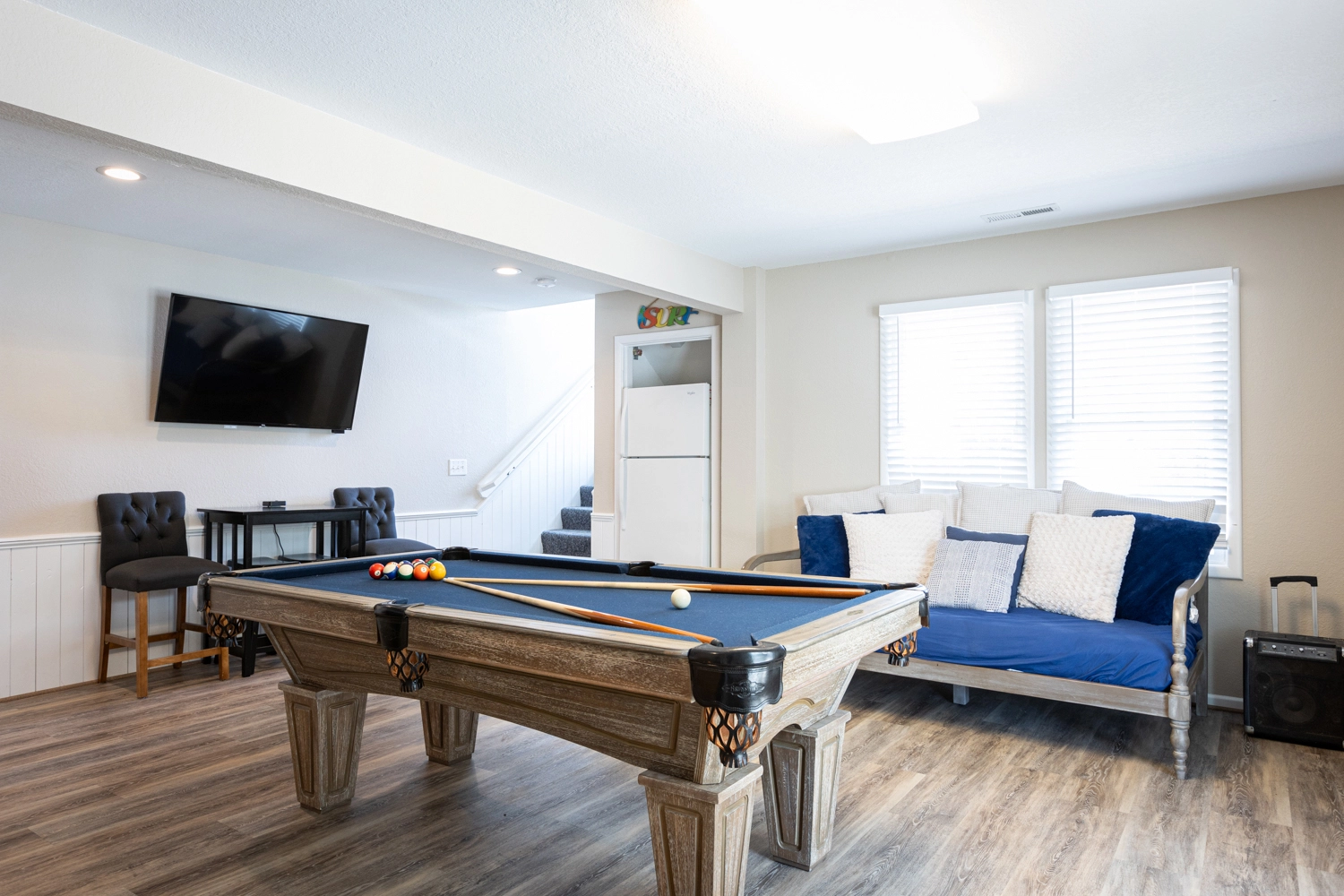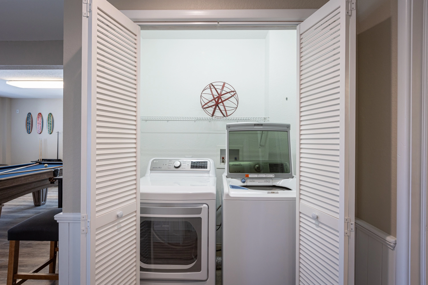 Rec room with pool table, wet bar, refrigerator and wine refrigerator; laundry.