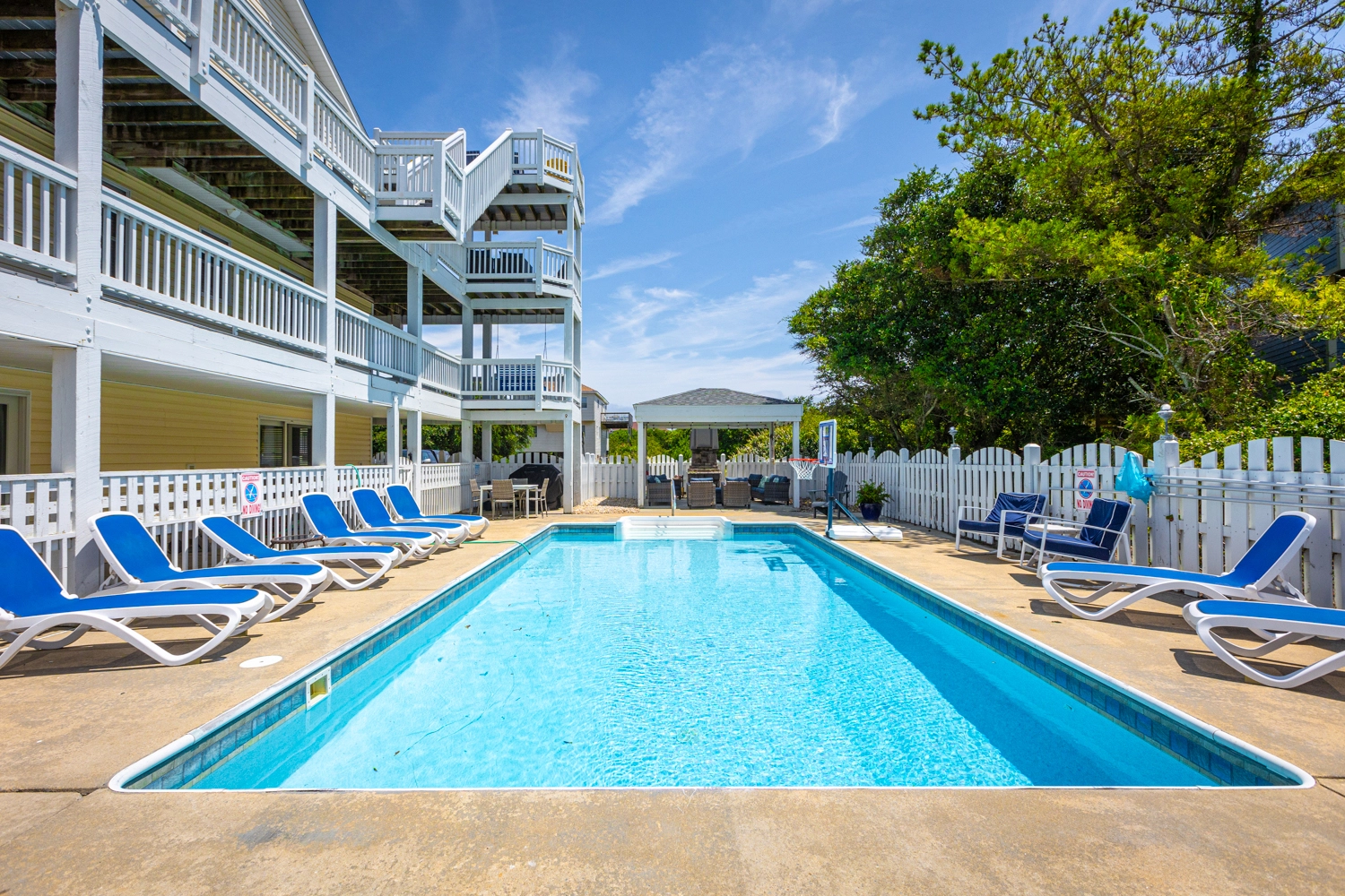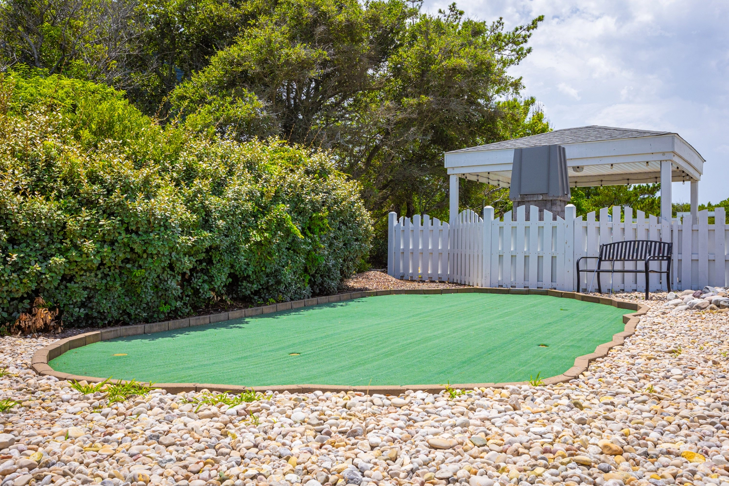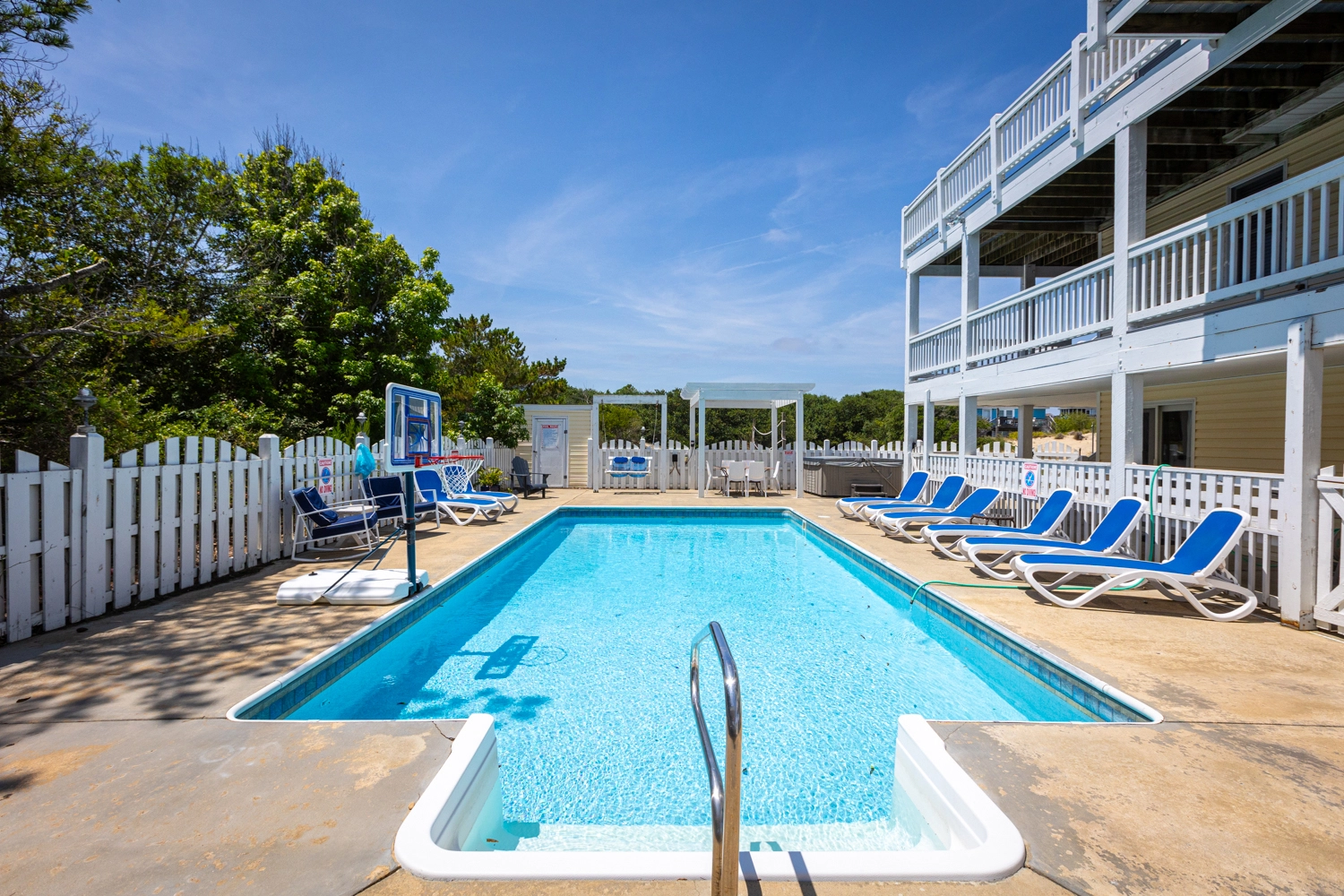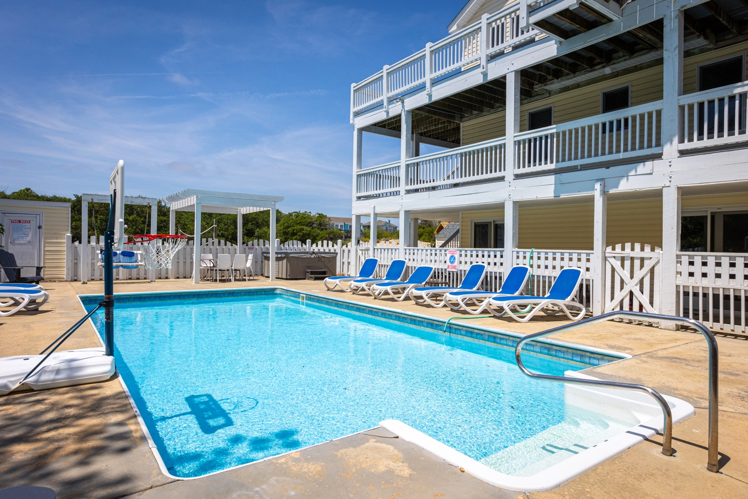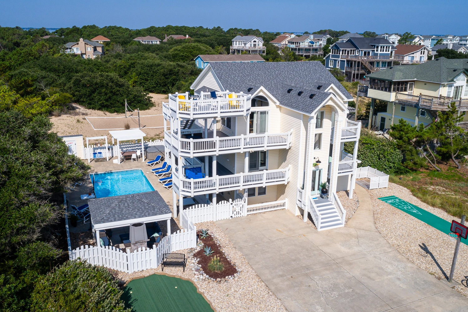 Private saltwater pool with an optional pool chiller ($350 plus tax, only available July/August), hot tub, poolside cabana with wood fireplace, basketball goal, putting green, shuffleboard court, volleyball net, cabana half bath, and kid's play set.