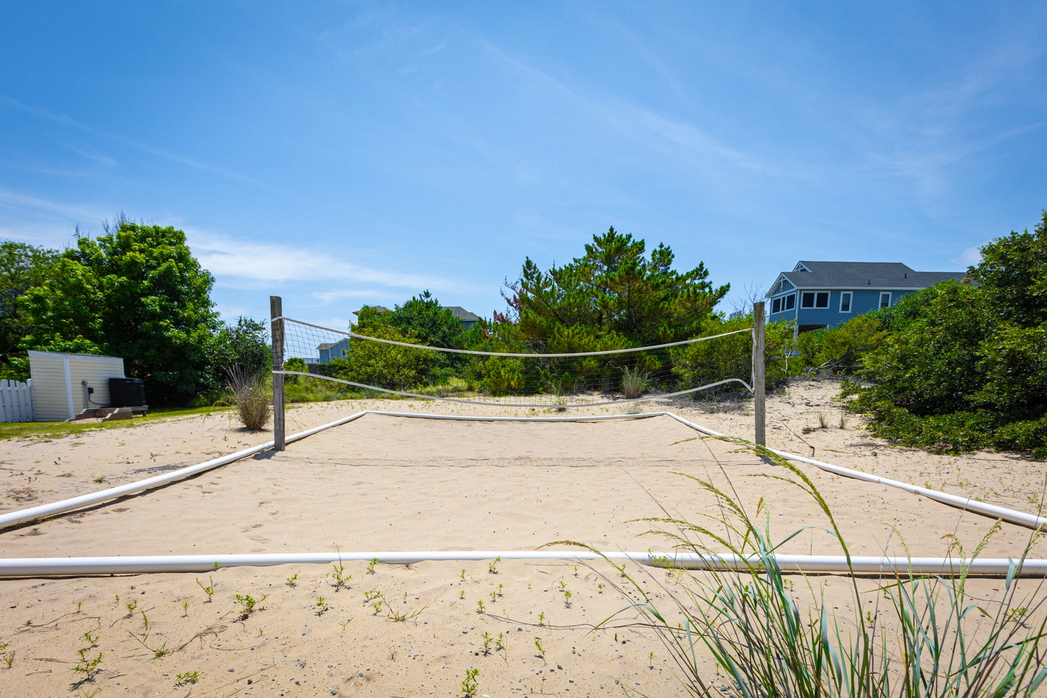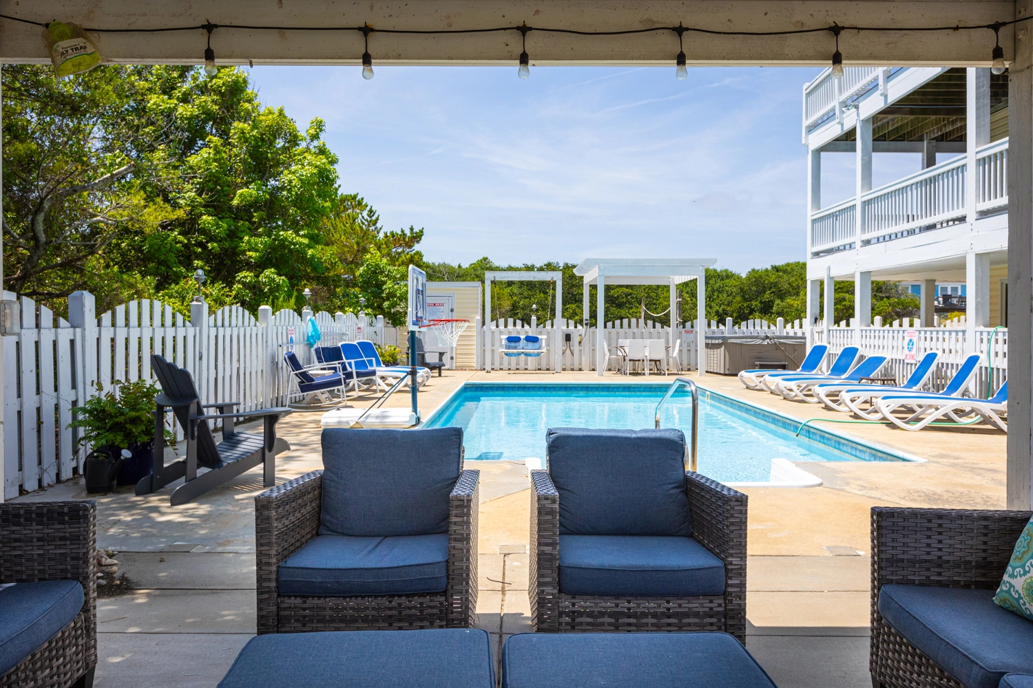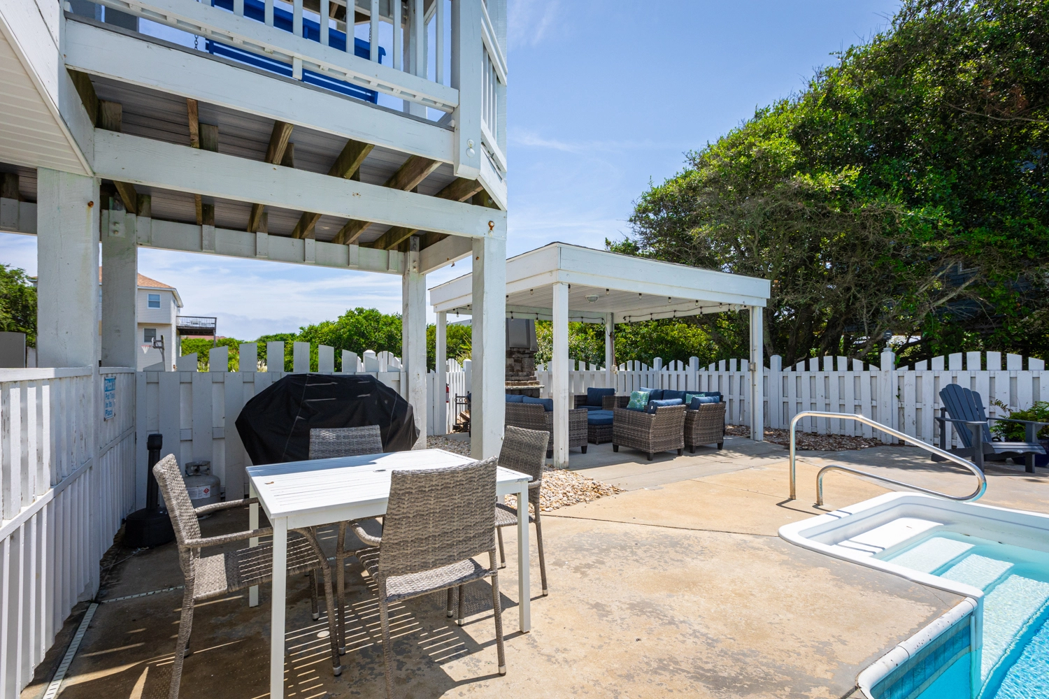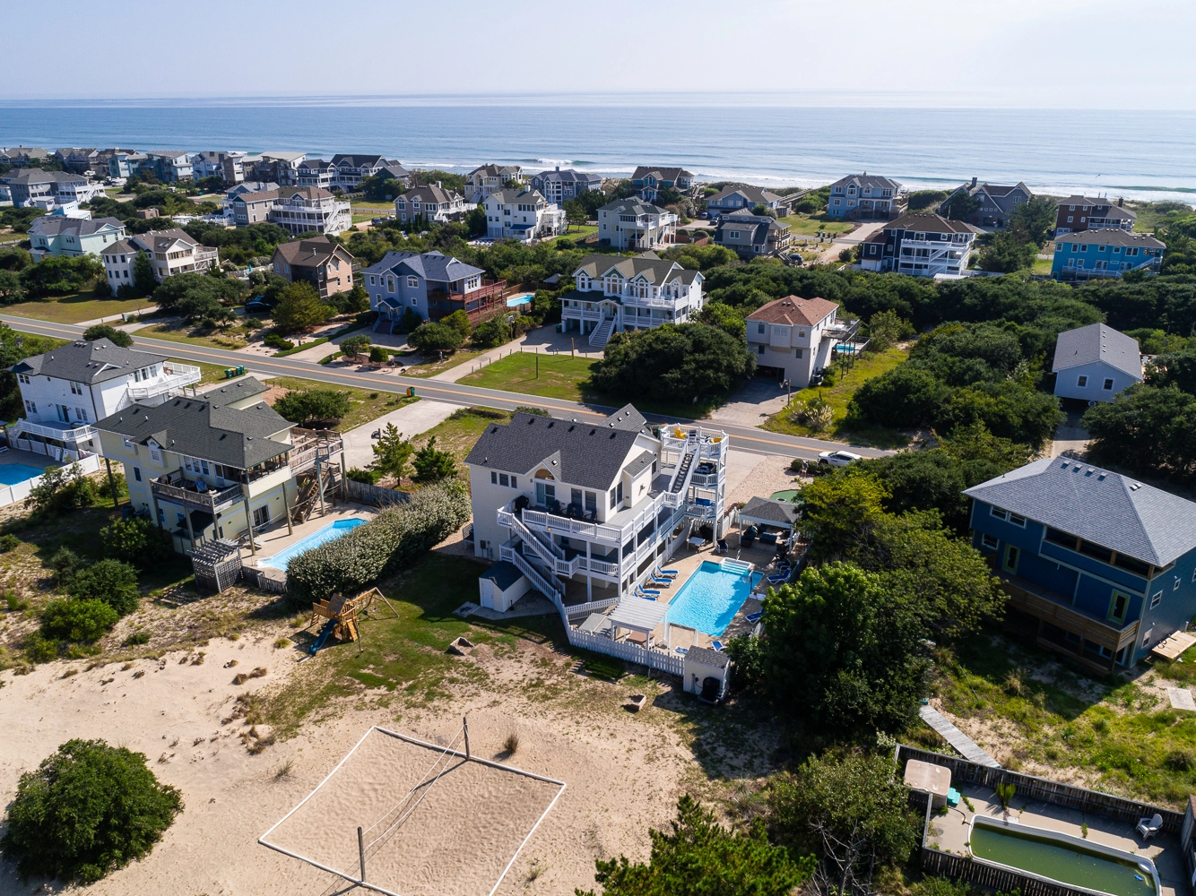 Private saltwater pool with an optional pool chiller ($350 plus tax, only available July/August), hot tub, poolside cabana with wood fireplace, basketball goal, putting green, shuffleboard court, volleyball net, cabana half bath, and kid's play set.