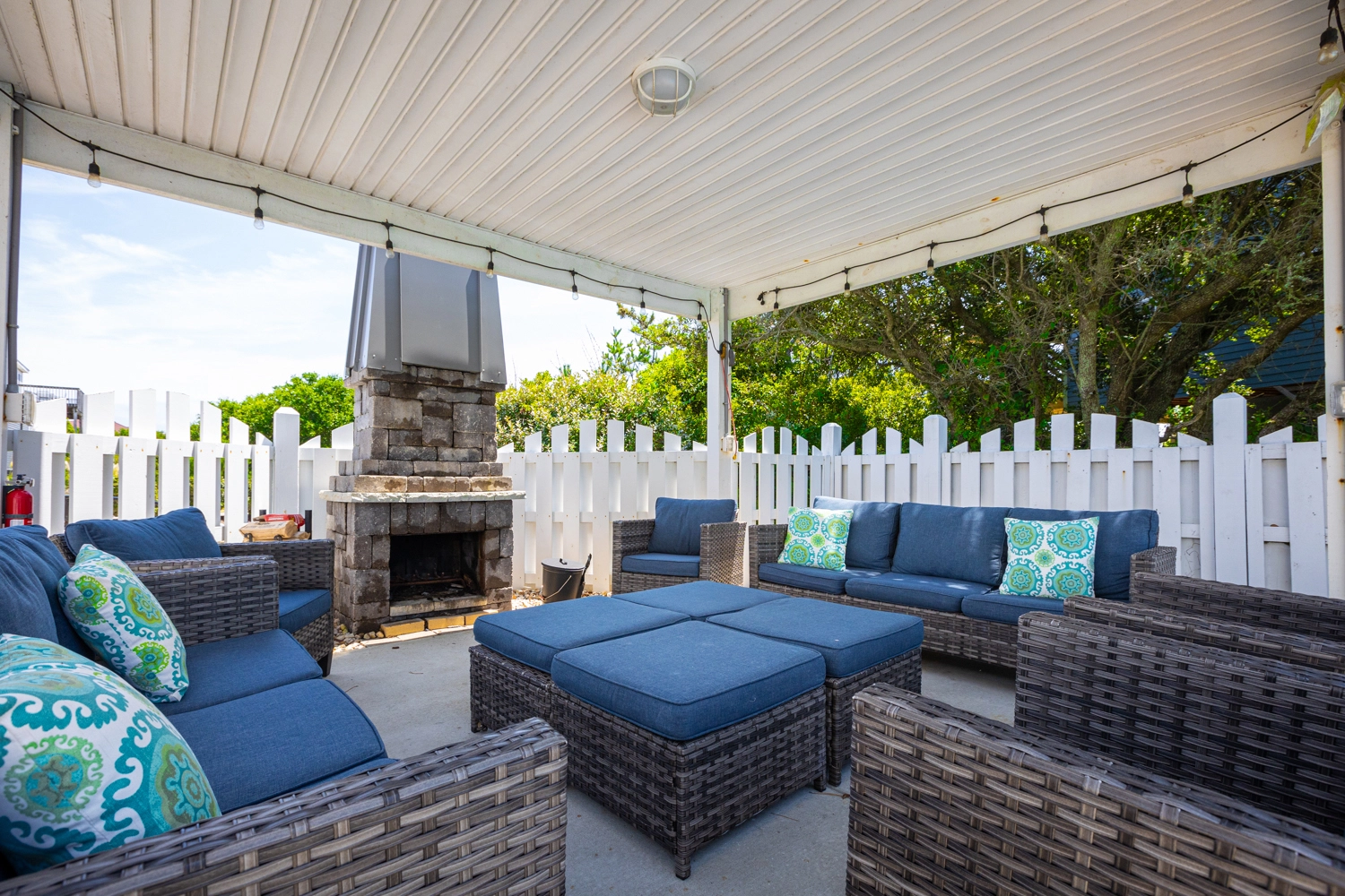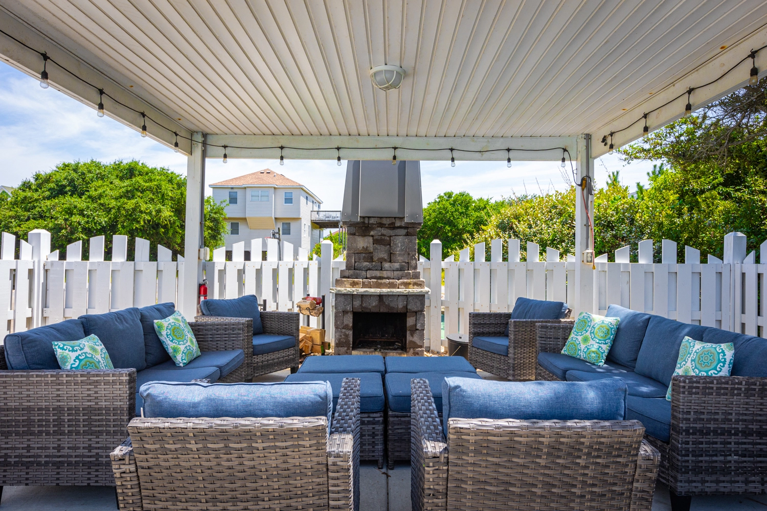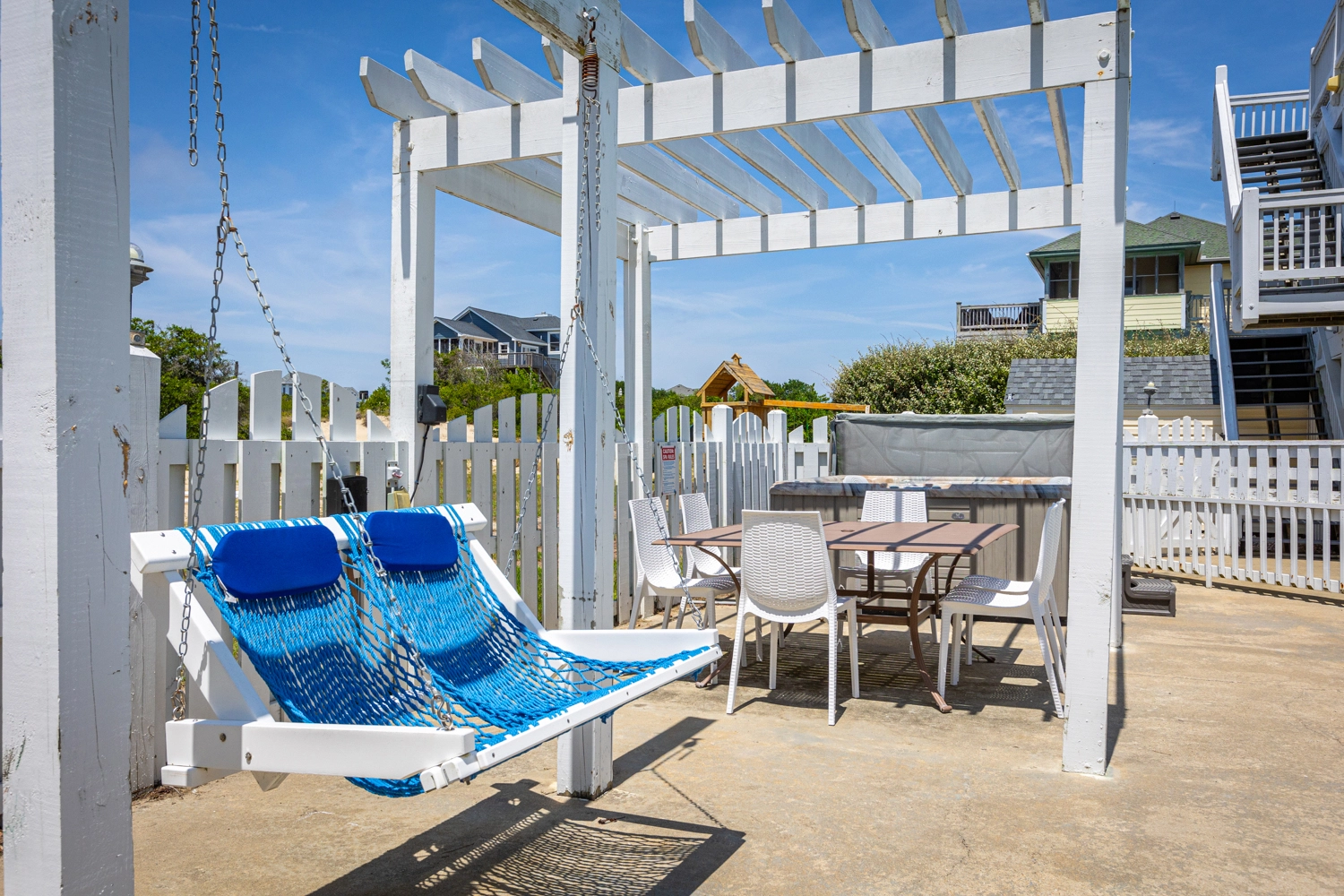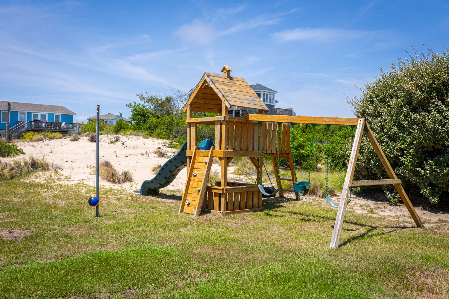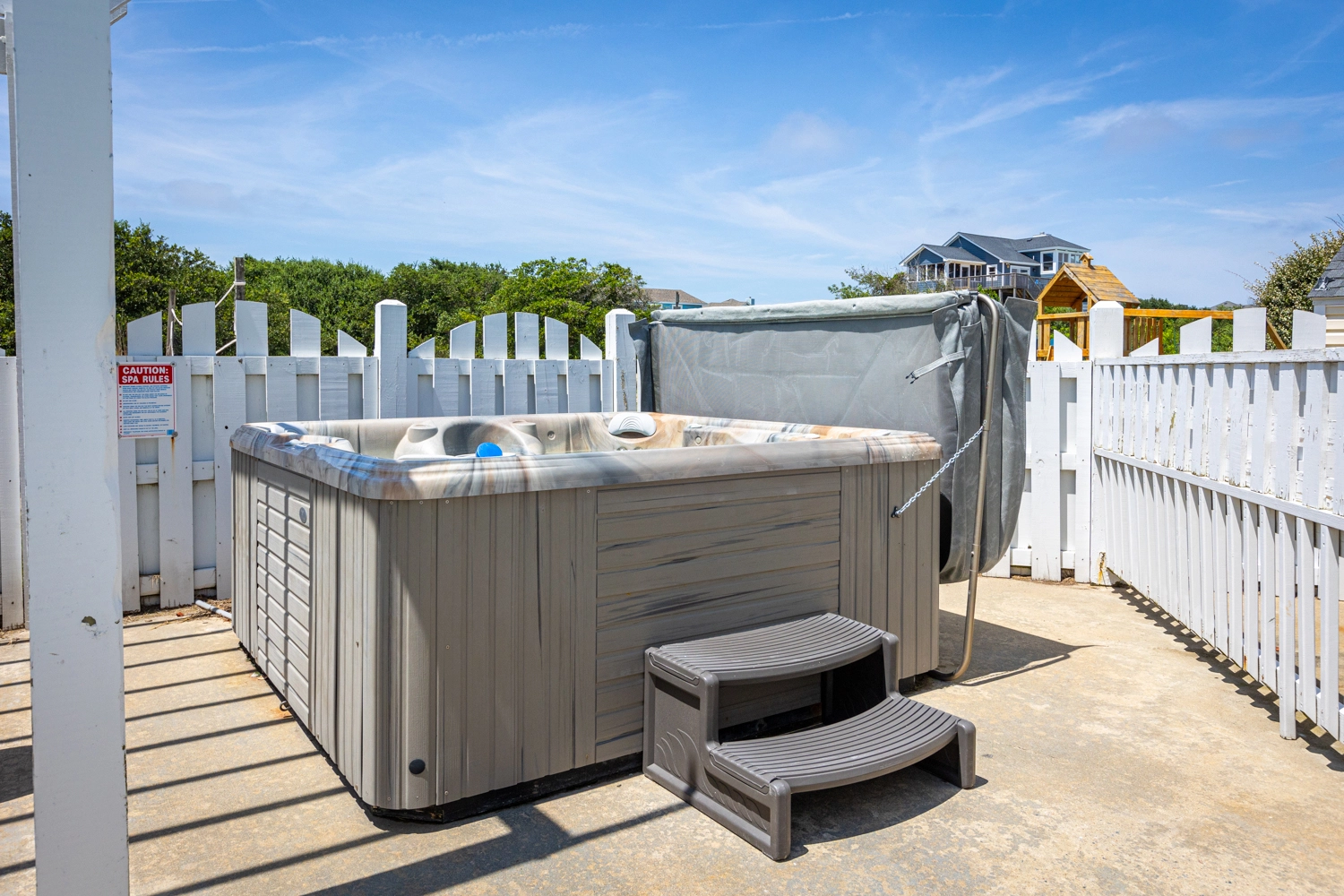 Private saltwater pool with an optional pool chiller ($350 plus tax, only available July/August), hot tub, poolside cabana with wood fireplace, basketball goal, putting green, shuffleboard court, volleyball net, cabana half bath, and kid's play set.