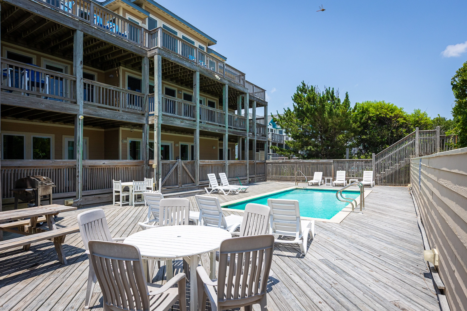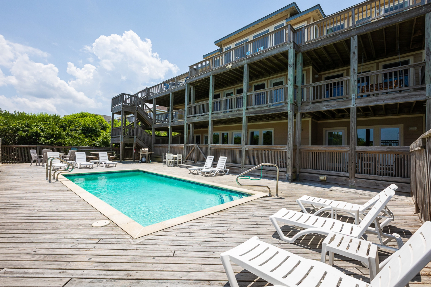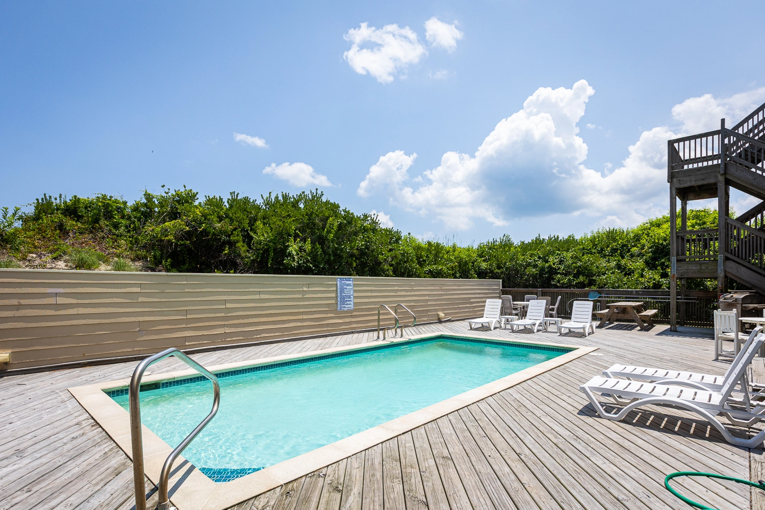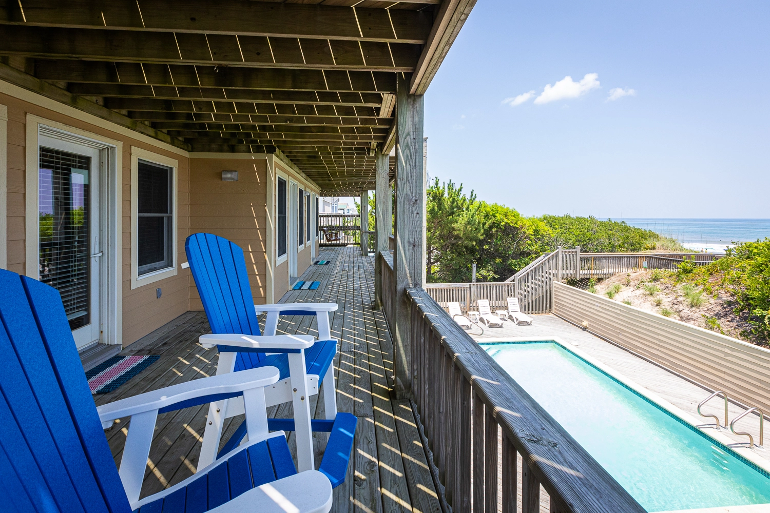 "What a wonderful home. Everything about this home was top notch, especially the well stocked kitchen. Pool heat was perfect and made the pool lovely to use in May. Rooms and bathrooms are spacious, media room was a great hangout spot and the hot tub was perfect. The access to the beach was easy and the dune deck with built in bench was great. We rented bikes nearby and used them to bike to the lighthouse and nature path on the sound. What a fantastic week with family."