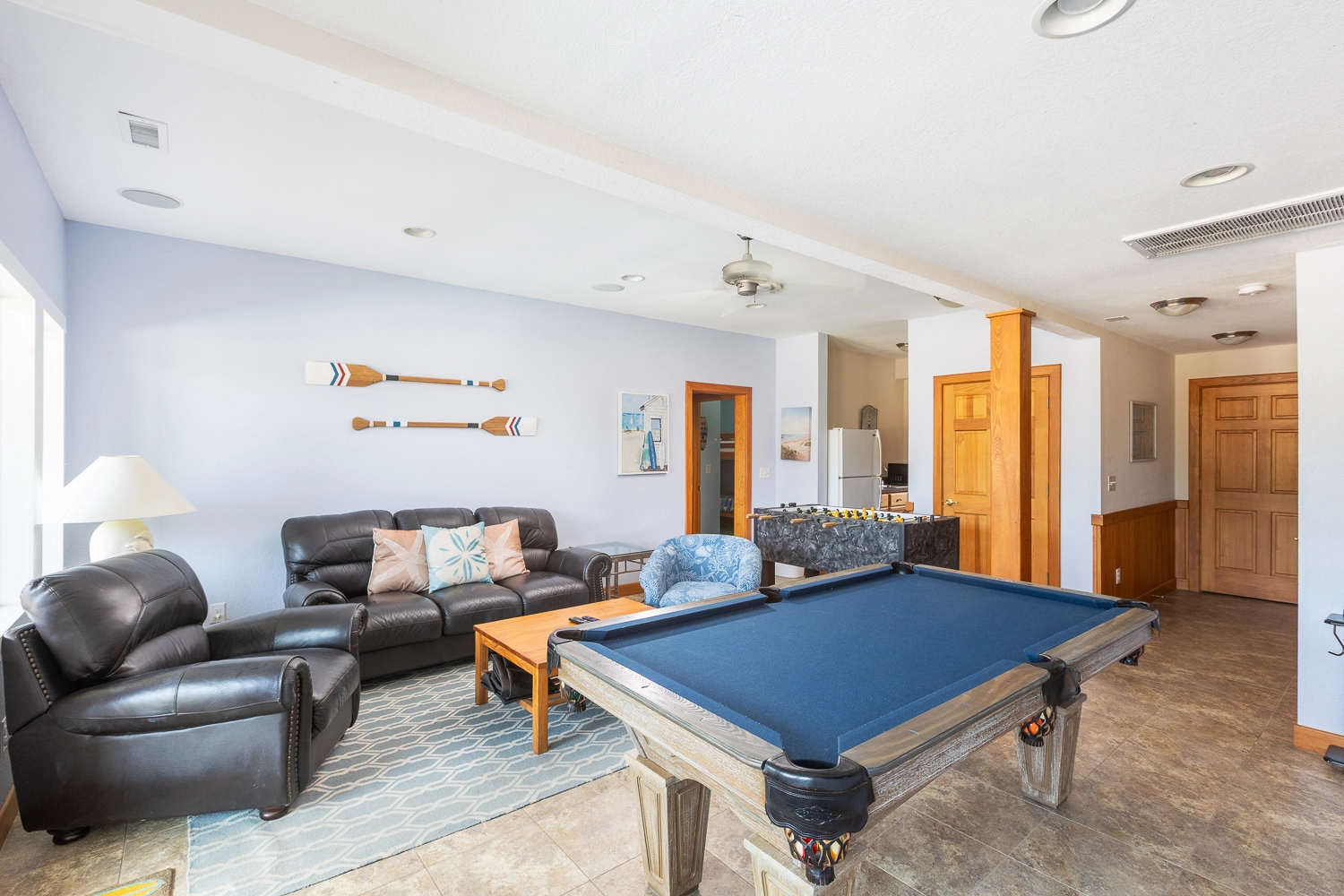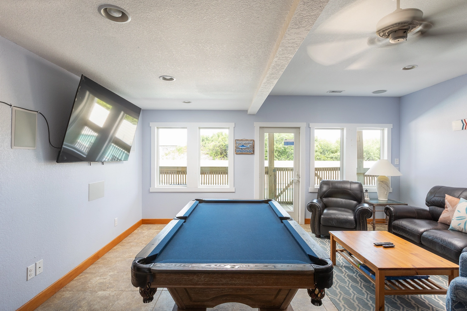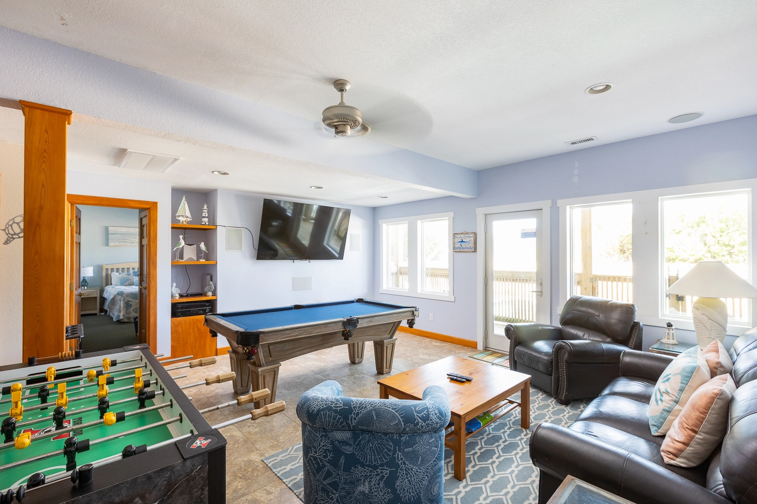 Game room overlooking the pool area with surround sound, pool table, foosball table, and wet bar with full-size refrigerator and microwave.