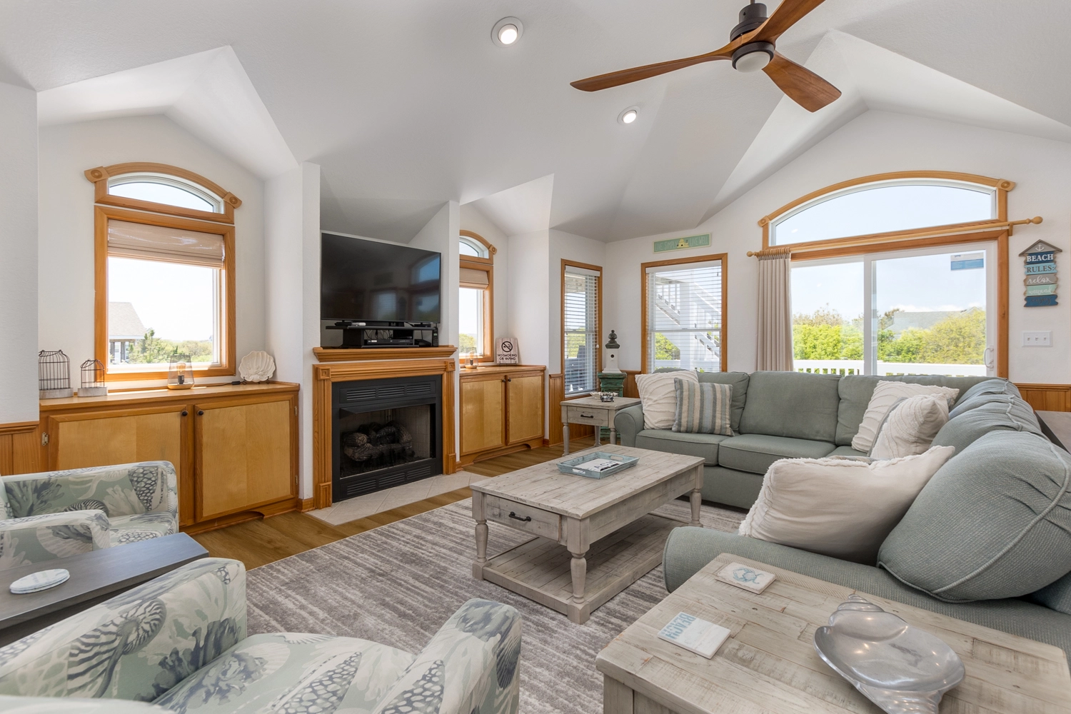 "We loved the spacious upstairs and all of the bathrooms. The house was beautifully decorated and the kitchen was wonderfully stocked. My only complaint was that there were a lot of spiders...none that we saw but every morning, the first one up walked through some spider webs on the steps and in various corners. I think it just needs sprayed...as I realize that there are some unwelcome house guests at times. We had a great time and Twiddy really helped us with every need. The tv wasn't working nor was a burner on the stove but they fixed us up. Thank you."