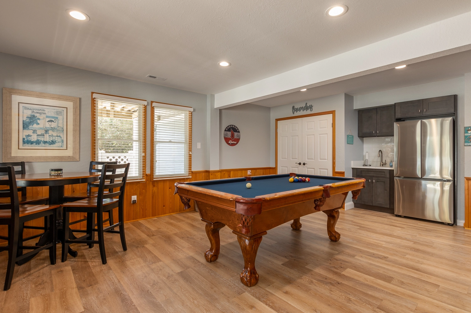 Rec room with pool table and kitchenette with mini-refrigerator and microwave; laundry.