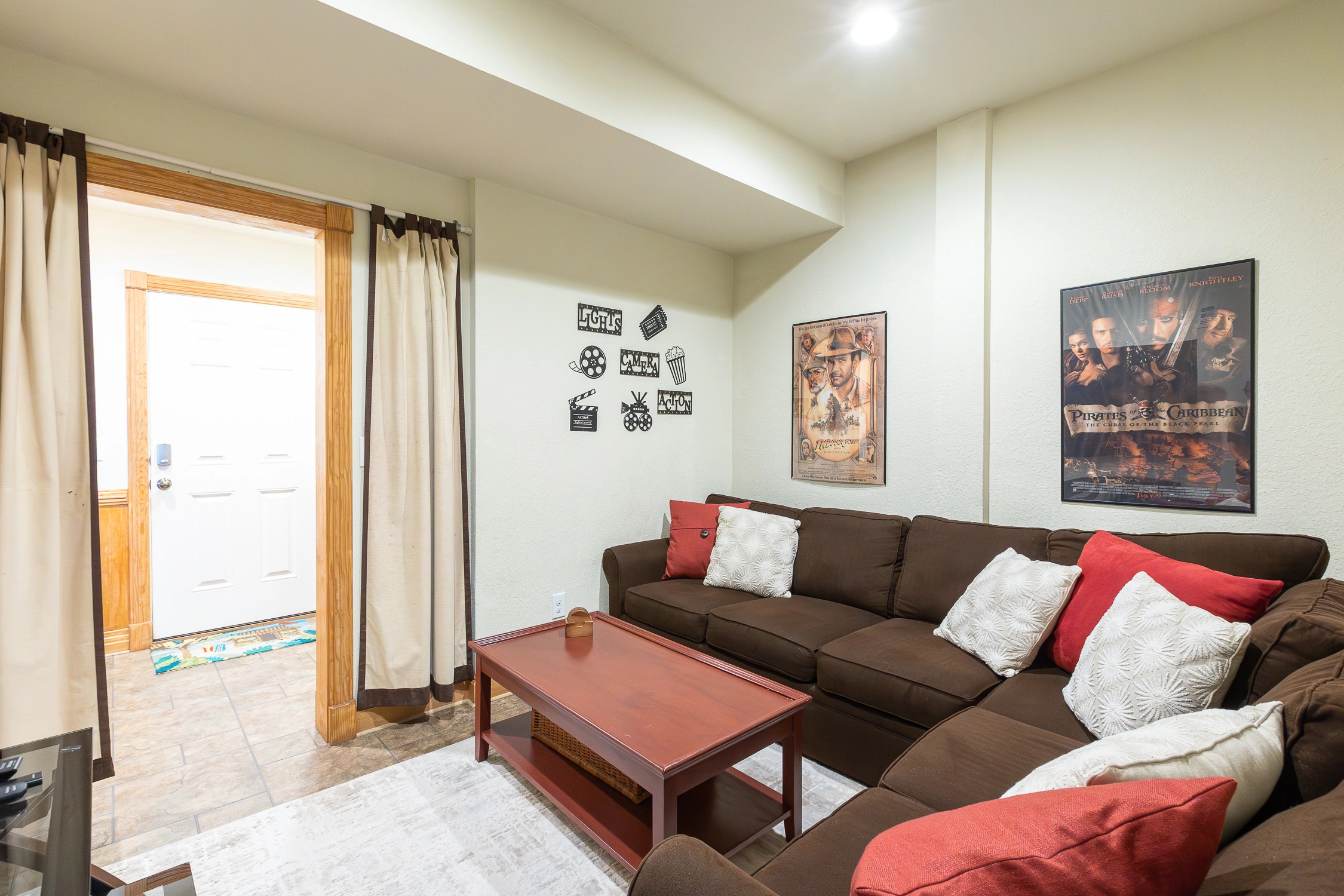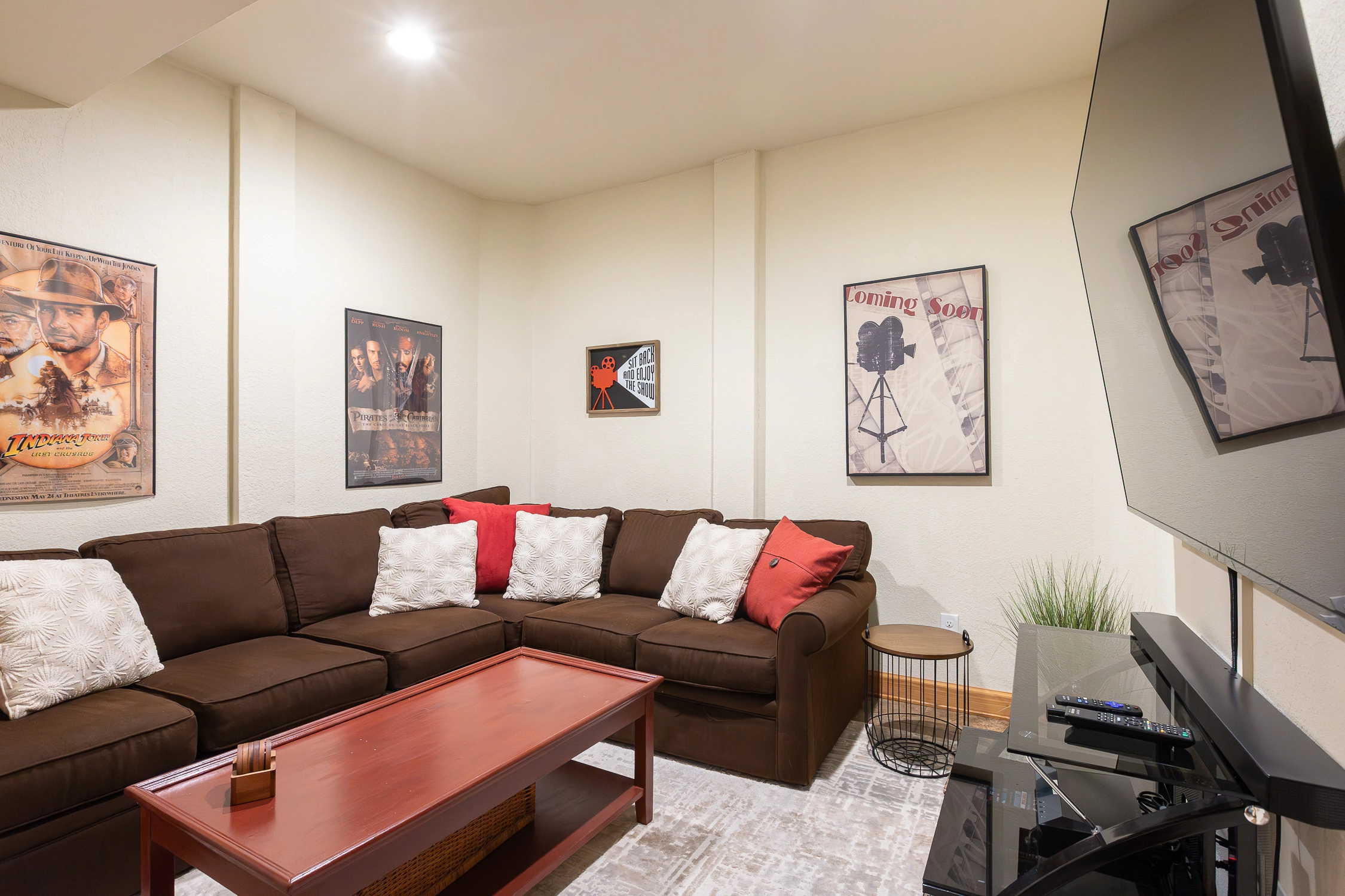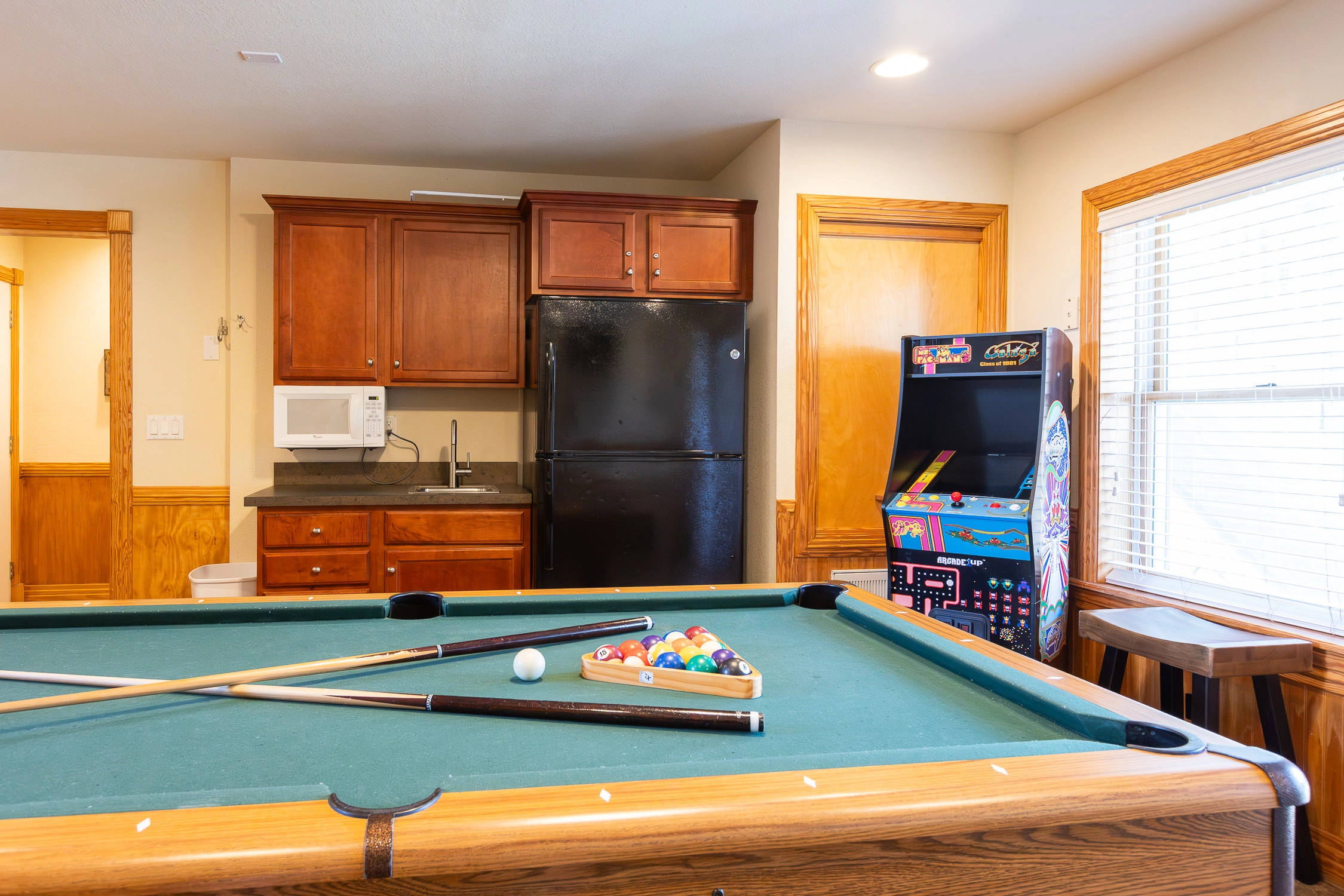 Rec room with pool table and wet bar with refrigerator; media room.