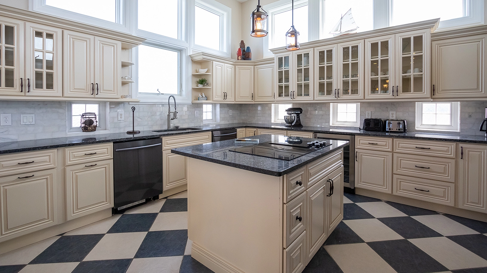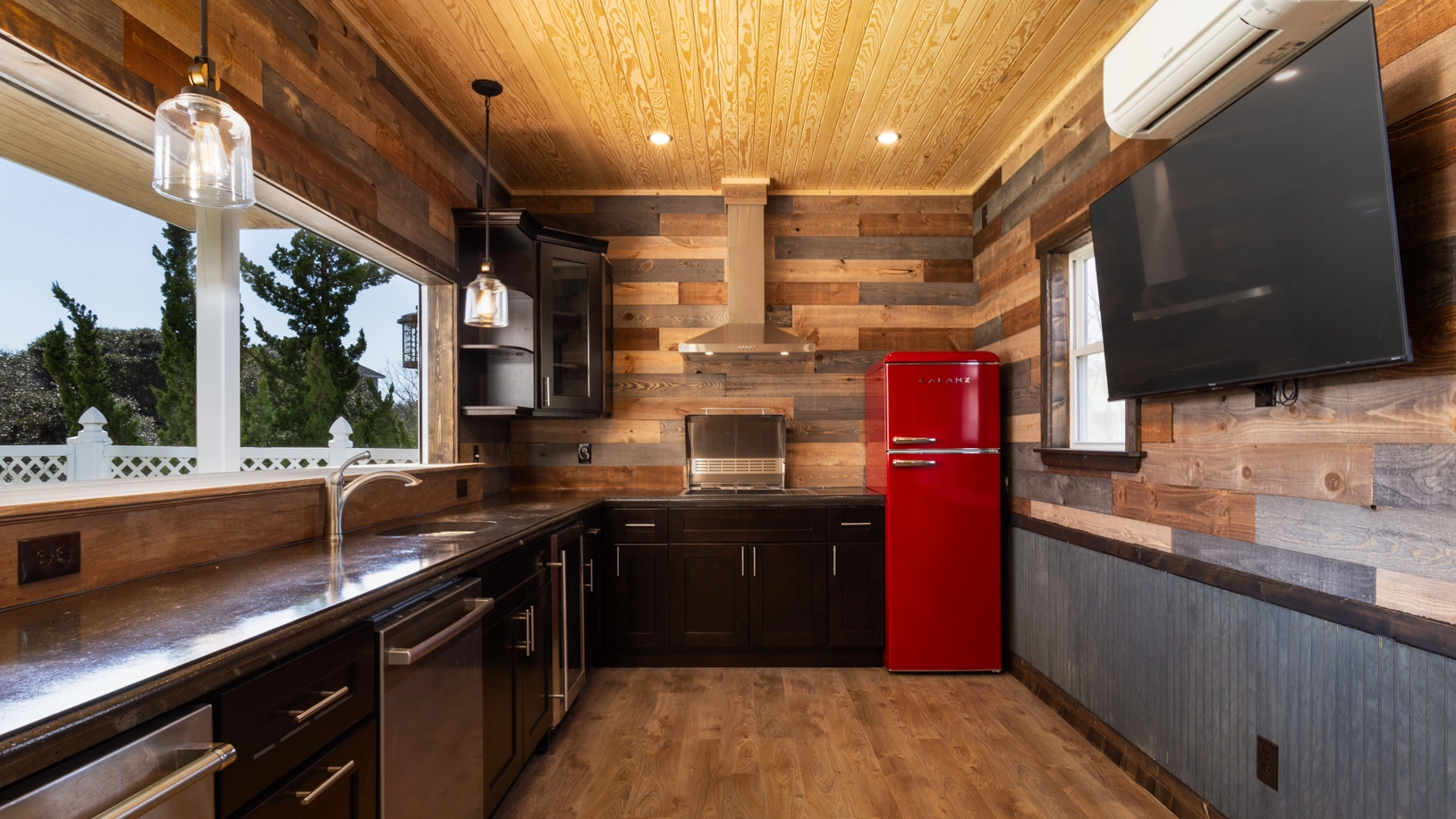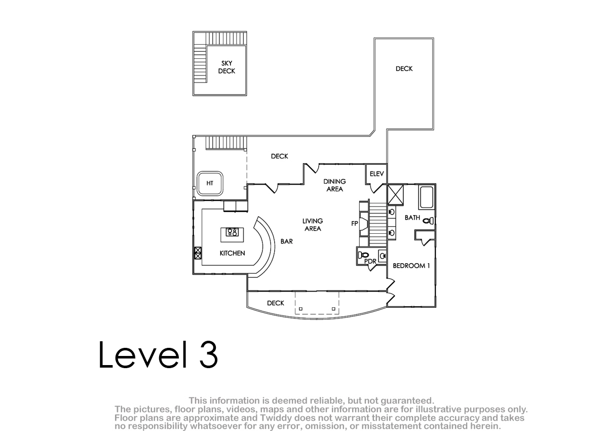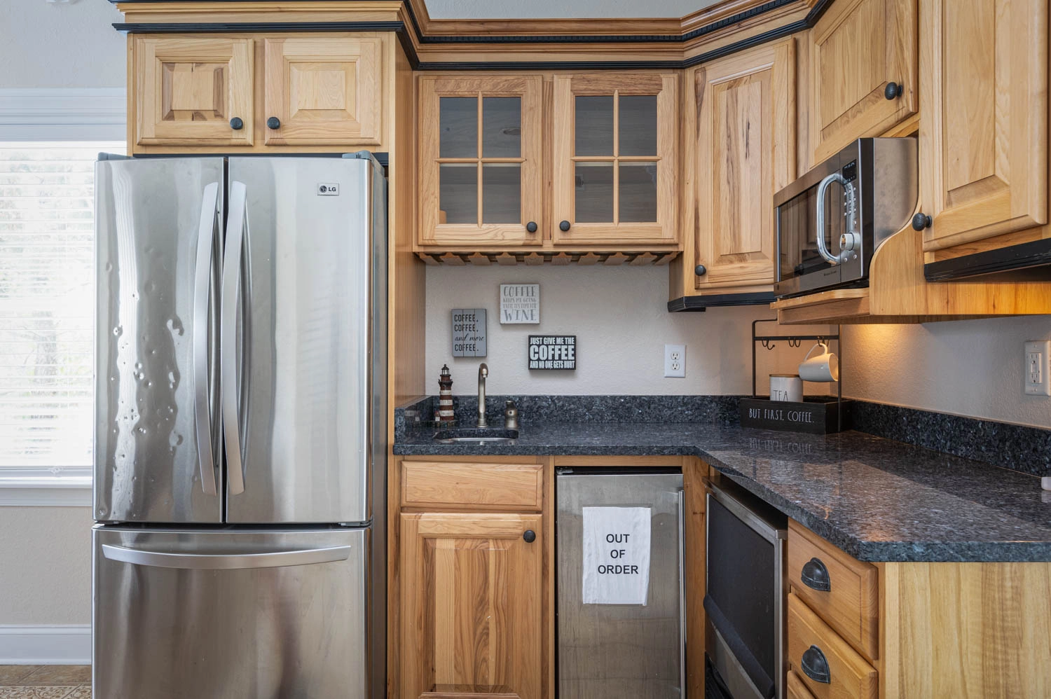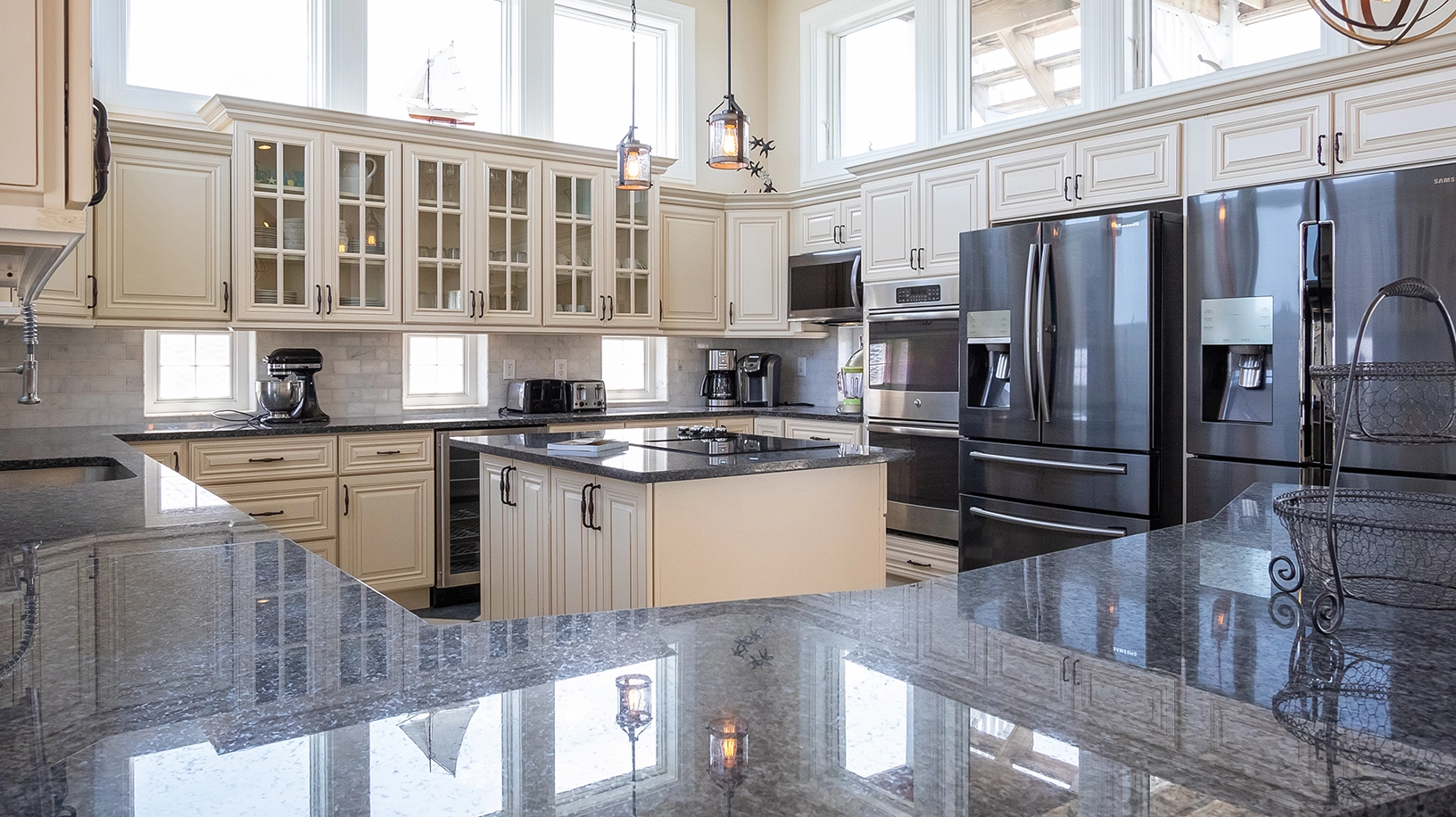 Great room with hardwood floors; elevated kitchen with granite countertops, wine chiller, two full-size refrigerators and dishwashers; dining area; outdoor dining area for 8; sky deck.