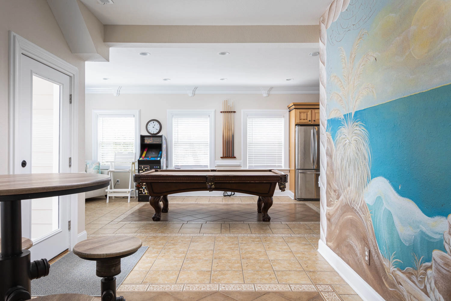 Theater room; rec room with pool table, foosball table, arcade game and kitchenette with full-size refrigerator; laundry; private pool with al fresco kitchen with indoor grill, wine and beverage refrigerator, dishwasher, ice maker, TV, retro refrigerator and bar area, hot tub.