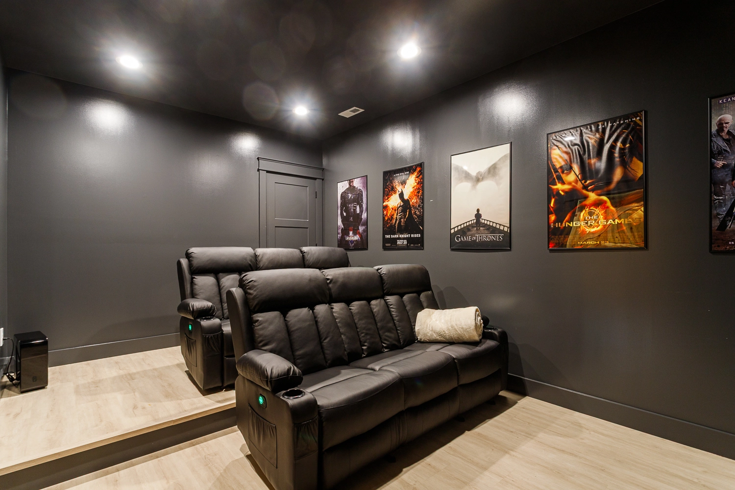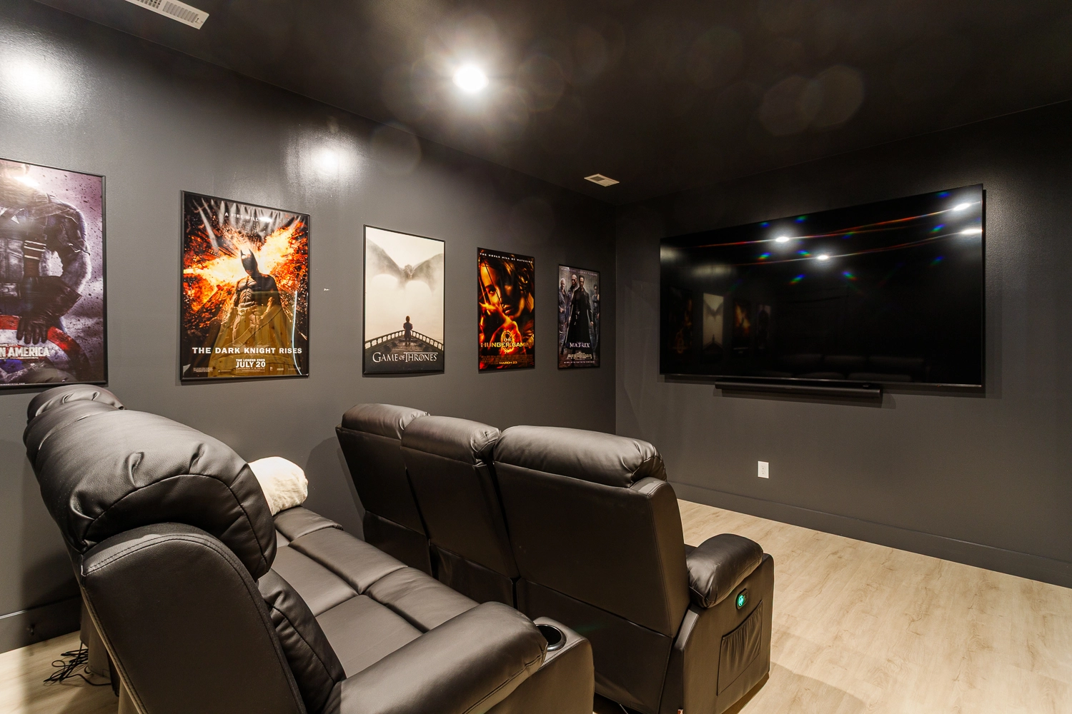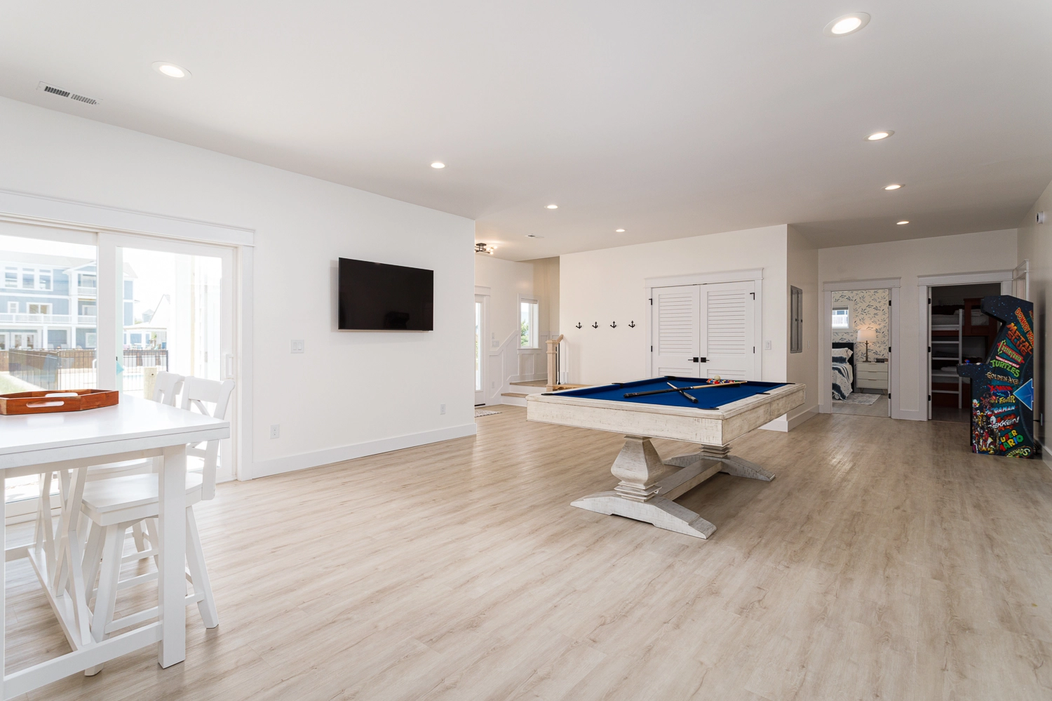 Theater room; rec room with pool table, arcade game, and wet bar with refrigerator; laundry.