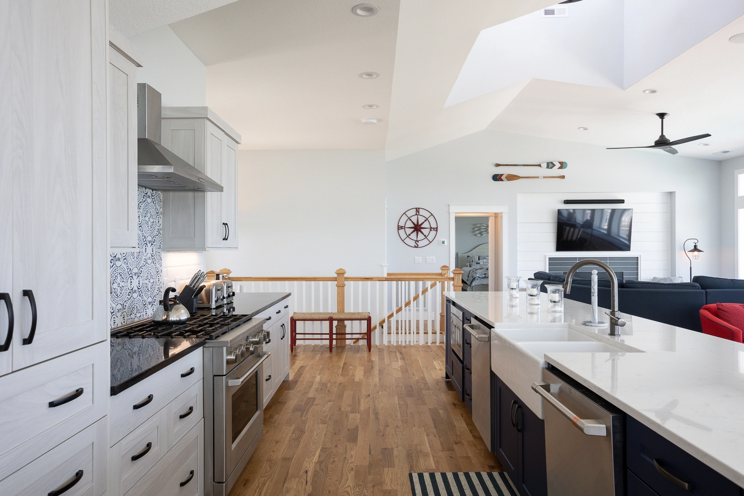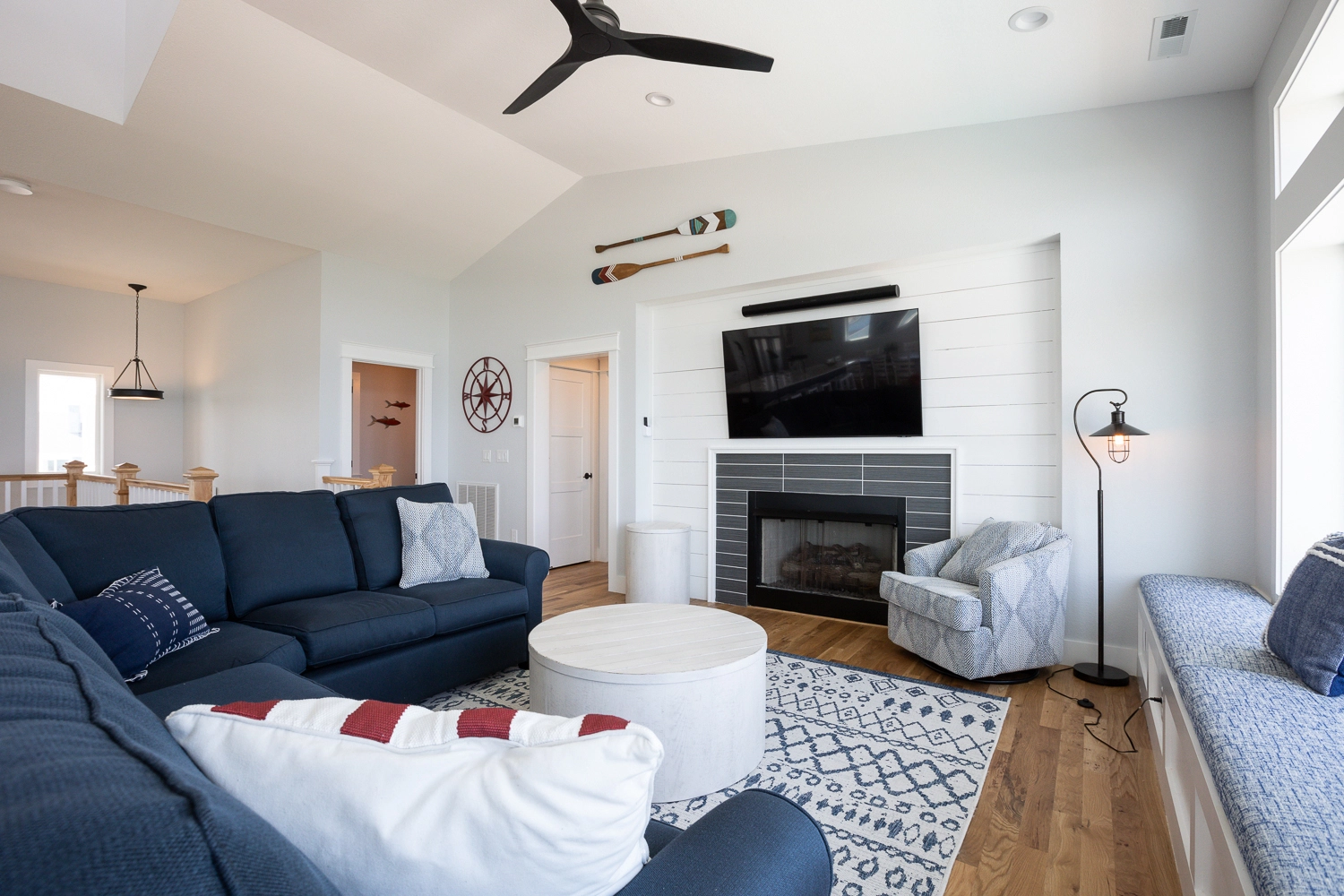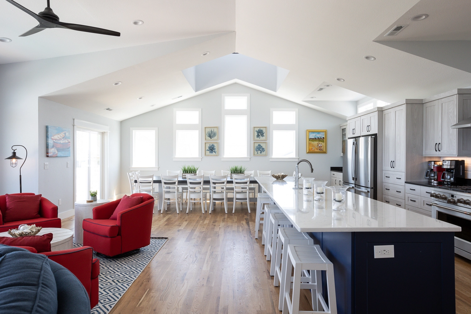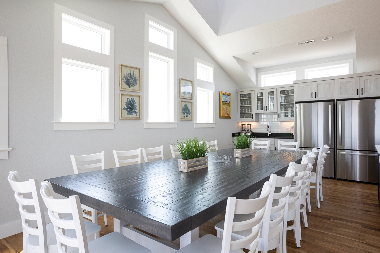 Great room with electric fireplace; kitchen with two refrigerators and two dishwashers; dining area.