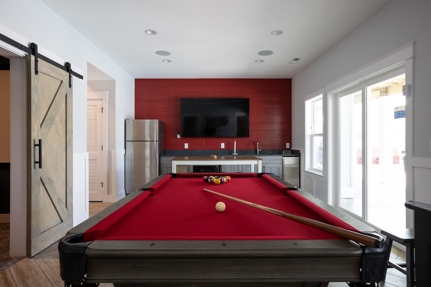 "The very spacious great room is beautifully decorated and very comfortable for large groups. The huge dining table is perfect! Having a private en suite with each bedroom is ideal. I loved that the bedrooms were all kings (maximum comfort). Deck access for each bedroom was lovely. The outdoor spaces are awesome. The home theater was so much fun. Our sons-in-law loved the pool table, and the grandkids had a ball with the pac man game. The set up of the pool with a wading pool depth area for the toddlers set apart made the pool a relaxing time or all."