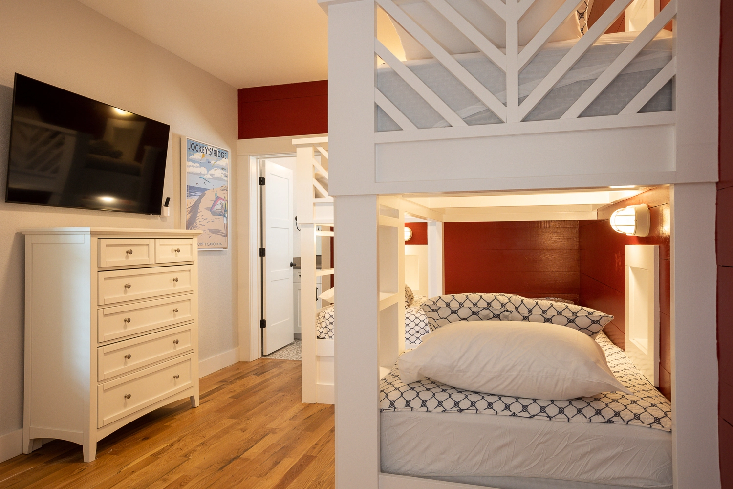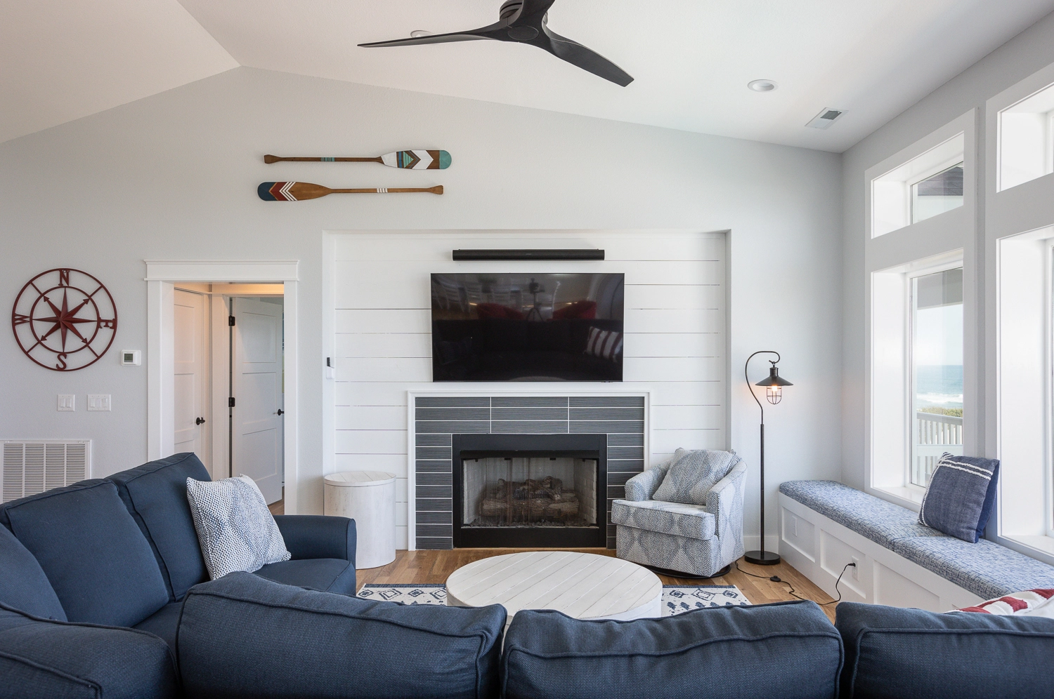 "The layout is fantastic with all king en suite bedrooms and bunk rooms. The location is perfect—oceanfront in Corolla. Well equipped kitchen. Plenty of indoor and outdoor gathering space. The extension of the third floor deck to span the ocean side of the house was a GREAT addition from our first stay here two years ago. The pool is awesome, appreciated the hot tub, the game room, many refrigerators, two dishwashers, two sets of laundry equipment. Cabana service is great. Decor is pleasant. The bench window seat in the great room is a wonderful feature."