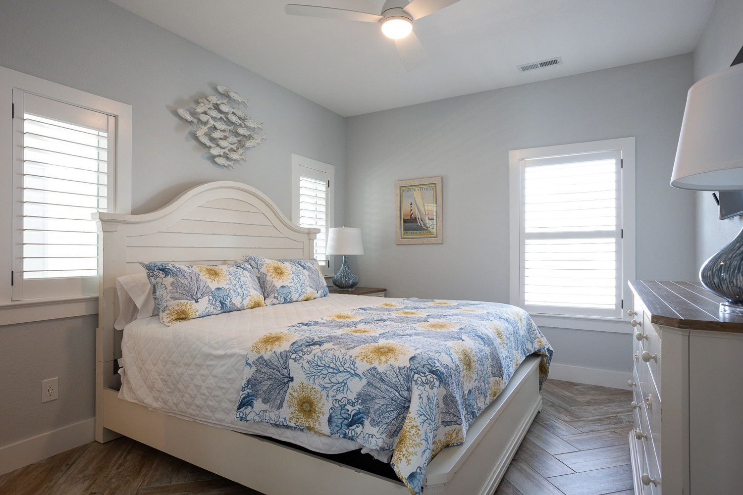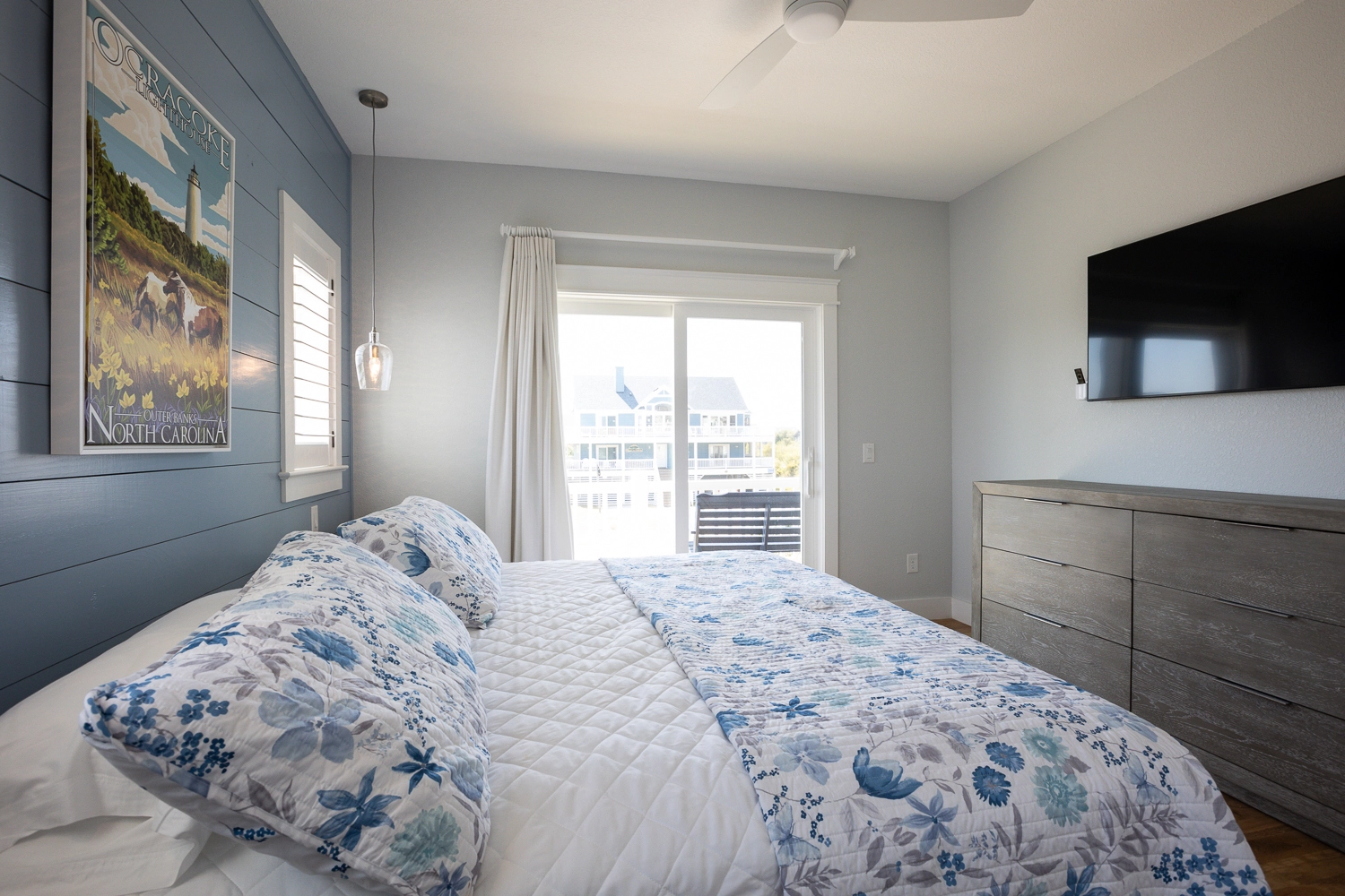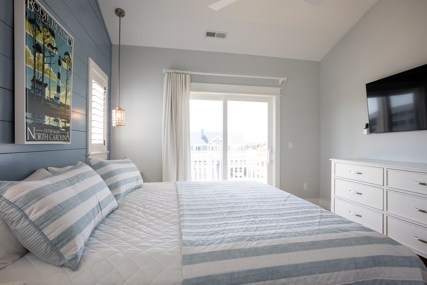 "This was our 13th year in OBX with Twiddy and we absolutely loved Victoria. The ouse helped us create the perfect vacation. The rooms were spacious, the bathroom were beautiful and the detached building added a nice touch for privacy. The color scheme and nautical theme felt so beachy! The kitchen was well stocked with two fridges, and two dishwashers which is important for large groups. The extra fridges on each floor, as well as in the detached building, were a bonus. We loved the huge dining room table as it fit all 14 of us comfortably. We opted to heat the pool and it was amazing. I higjly recommend this in the spring when there are collee days. Sadly the fountain pump broke but that was OK. My only feedback would be to leave instructions for the media room and outdoor pool speakers. We had many tech savvy people with us and we couldn't get them to work. Maybe a little manual for the house would be helpful for when we come back next year. 😃 A special thank you to the homeowners for delivering 3 delicious pies. That was a first for us and we all really appreciated the gesture. See you soon OBX."