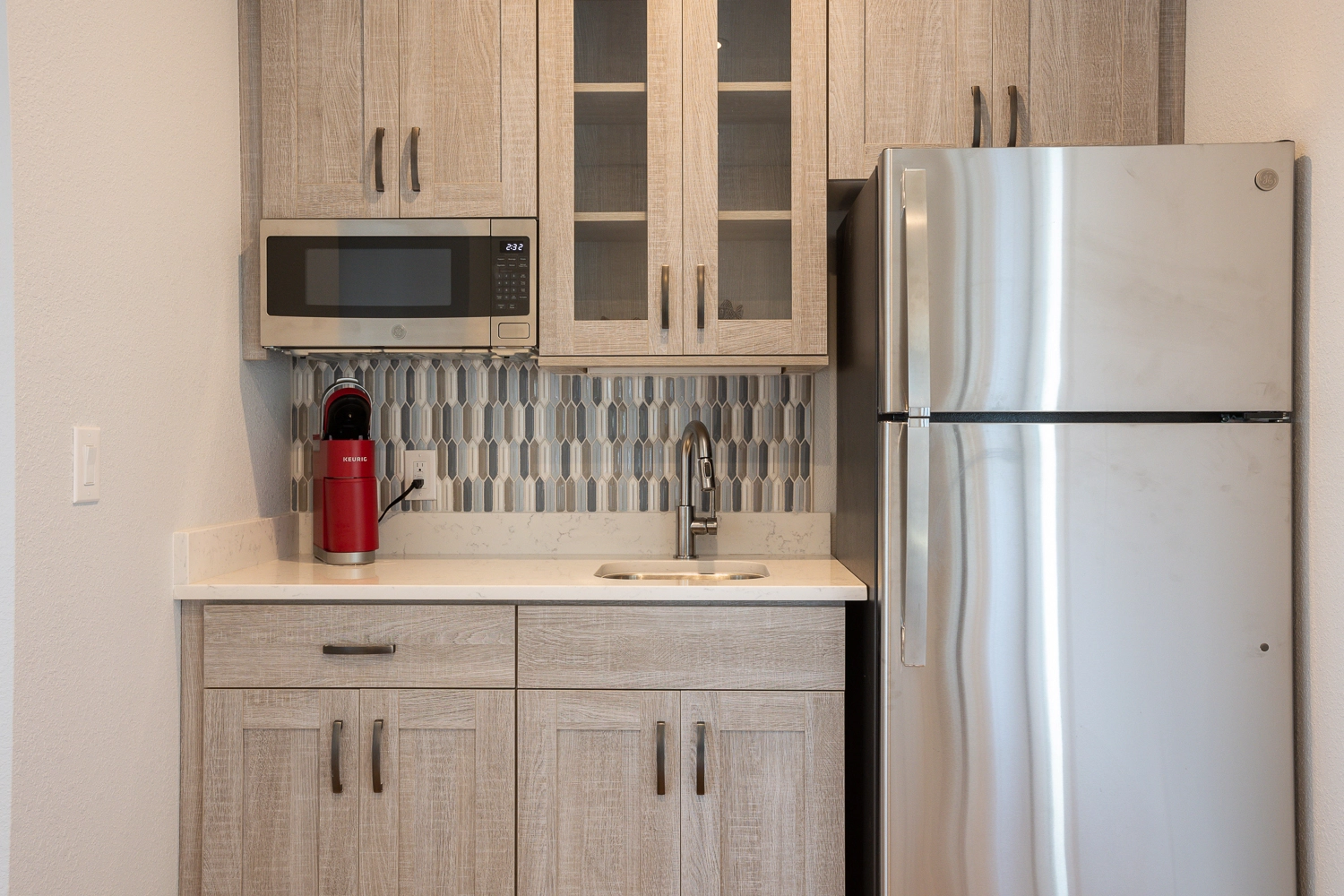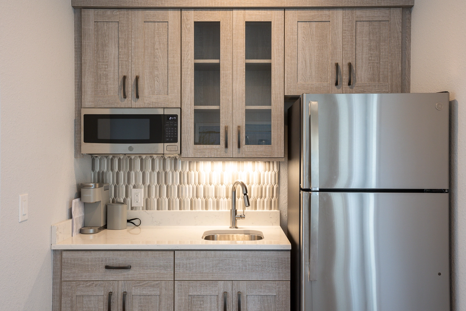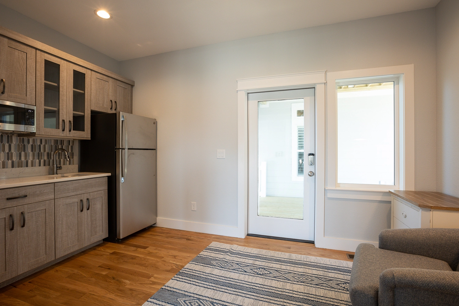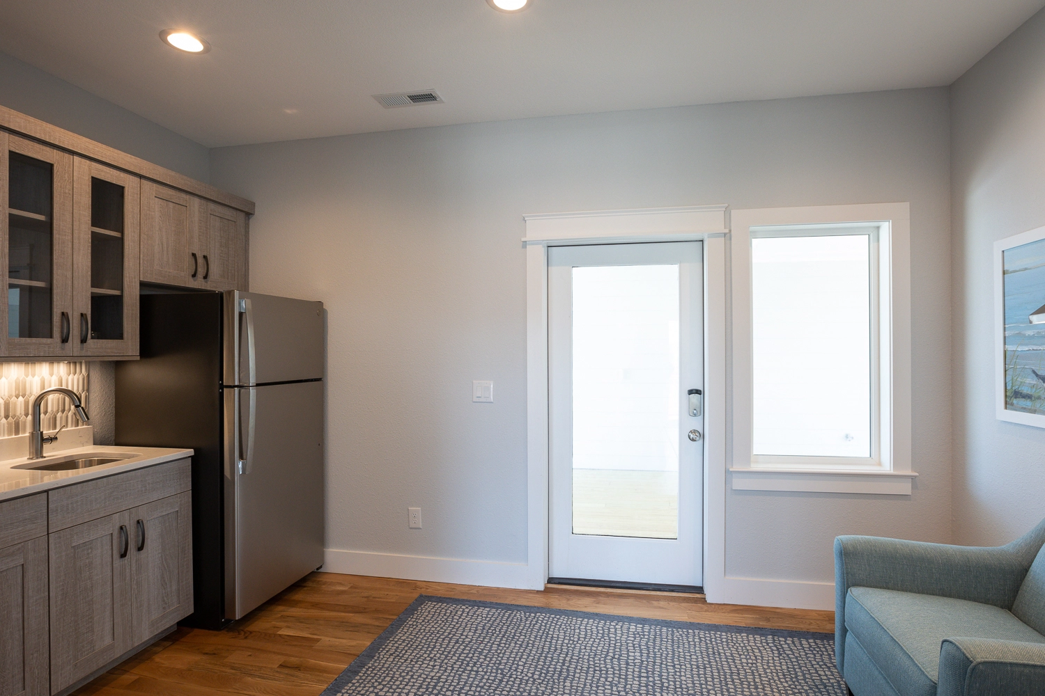 Sitting area with wet bar and refrigerator.