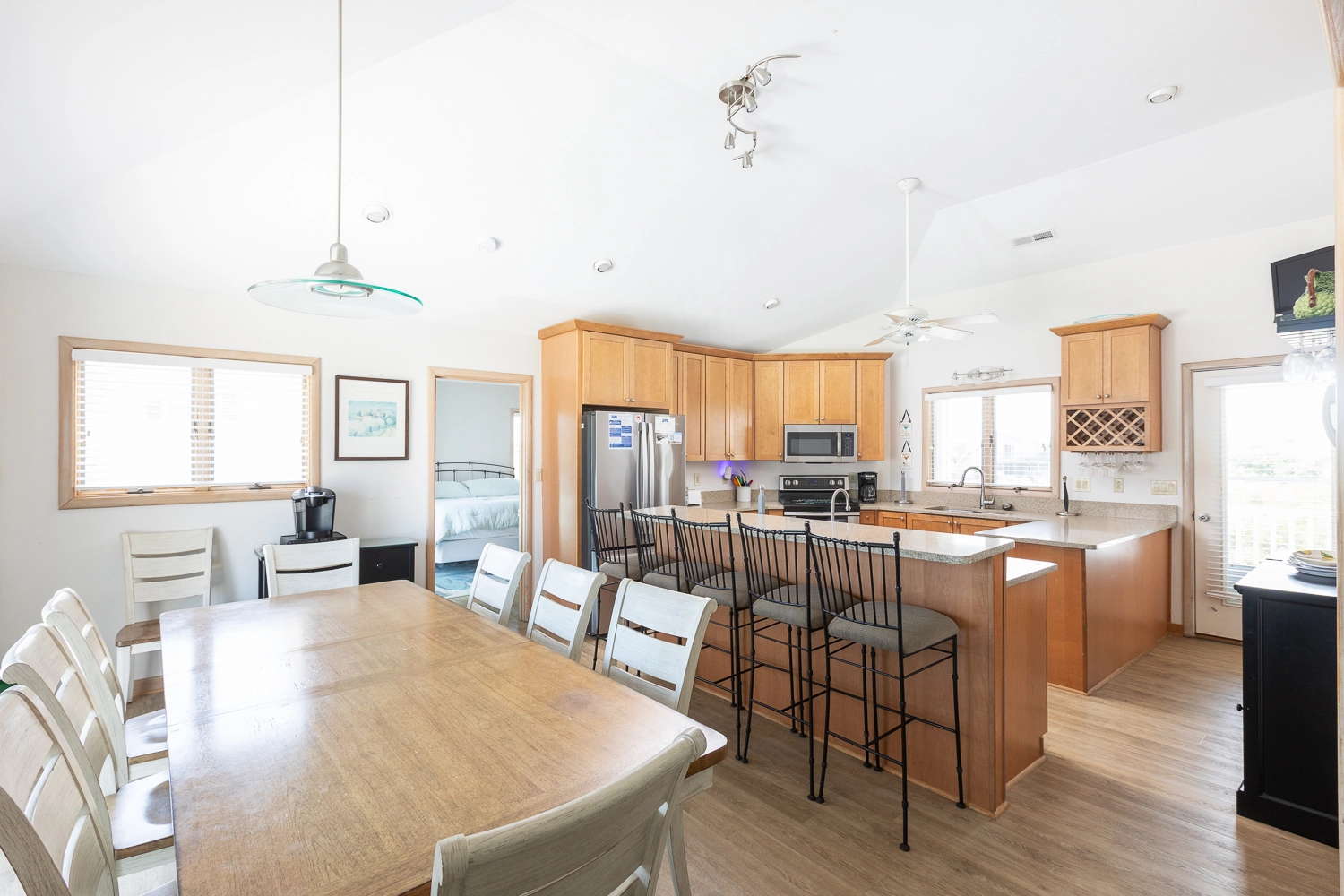 "Overall, excellent rental. My only real complaint is that the kitchen chairs need to be replaced (the seat cushions come undone from the frames), but I assume this will be done in the offseason. The pros - bluetooth speakers both at the pool as well as on the deck in the front of the house, excellent AV hookups in the family room (a bit complicated, but the universal remote helped me understand), two dishwashers, ICE MAKER, and an additional fridge and washer/dryer on the first floor for assistance with beach trips. There aren't a lot of houses on Lighthouse Drive that are small enough to make sense for our family (6 bedrooms is all we need), but offer all the amenities that make staying in Corolla so much fun. This house offers the whole package. Thanks!"