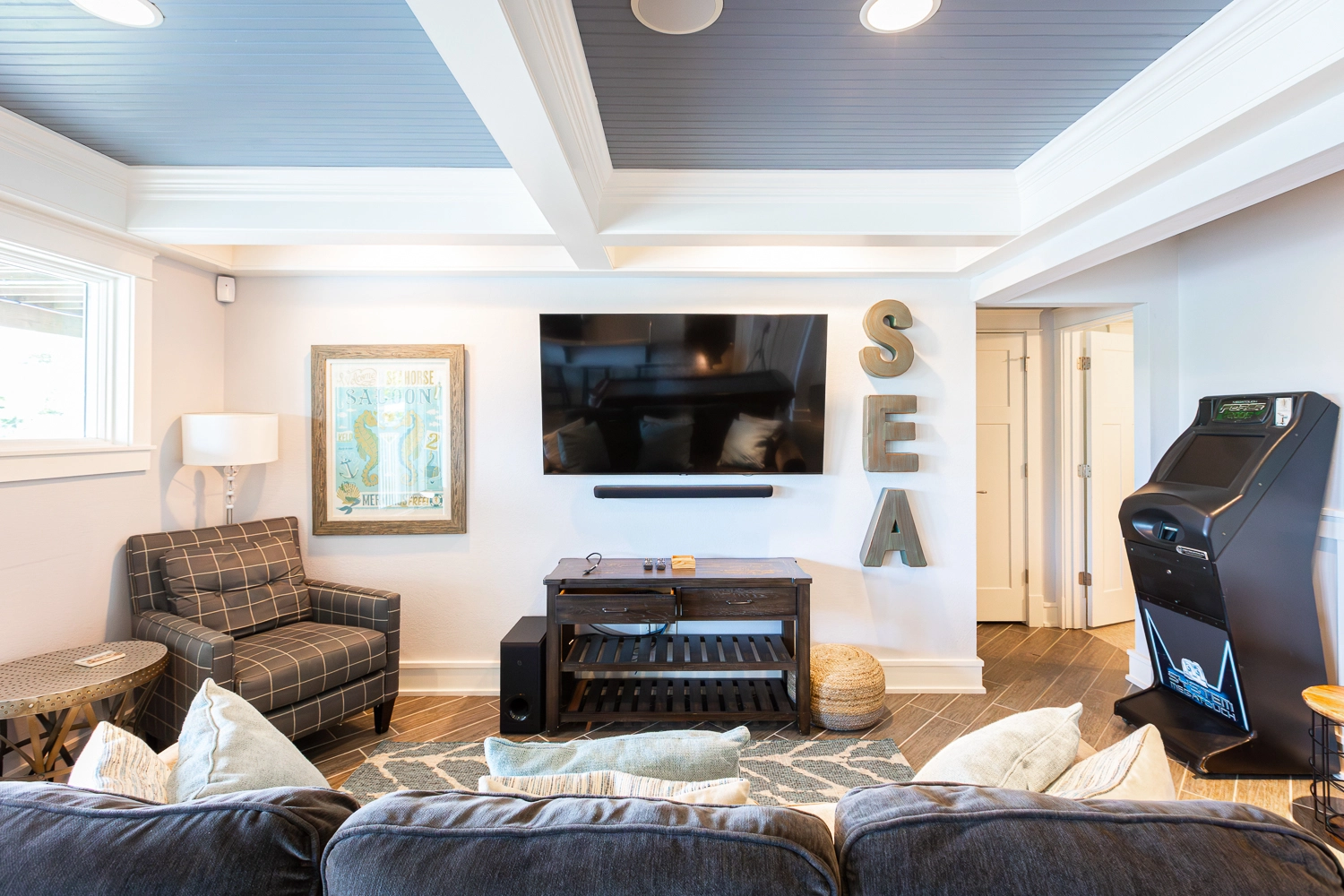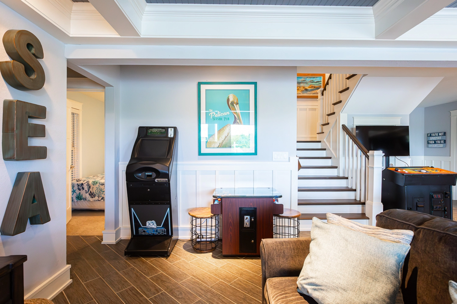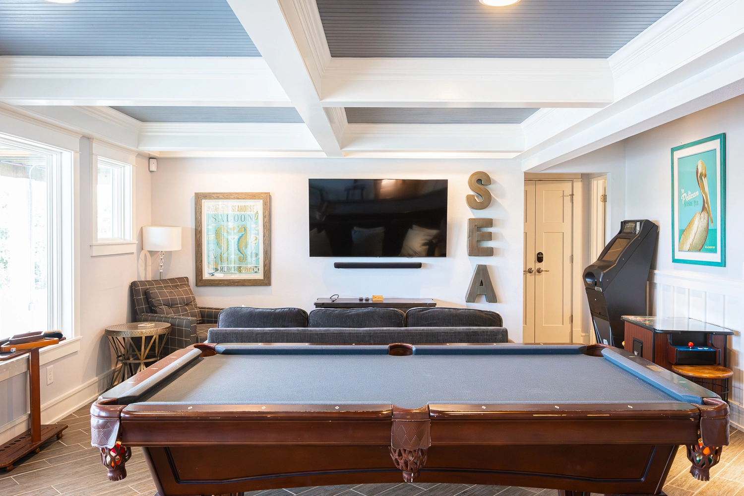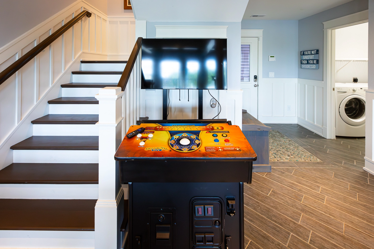 Theater room; rec room with arcade game, pool table, wet bar with refrigerator; laundry with ice machine.