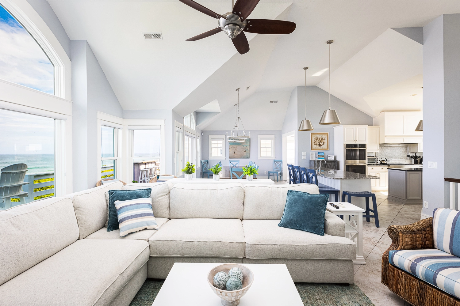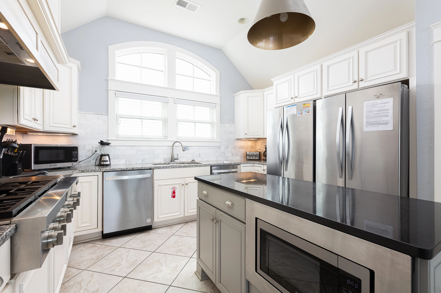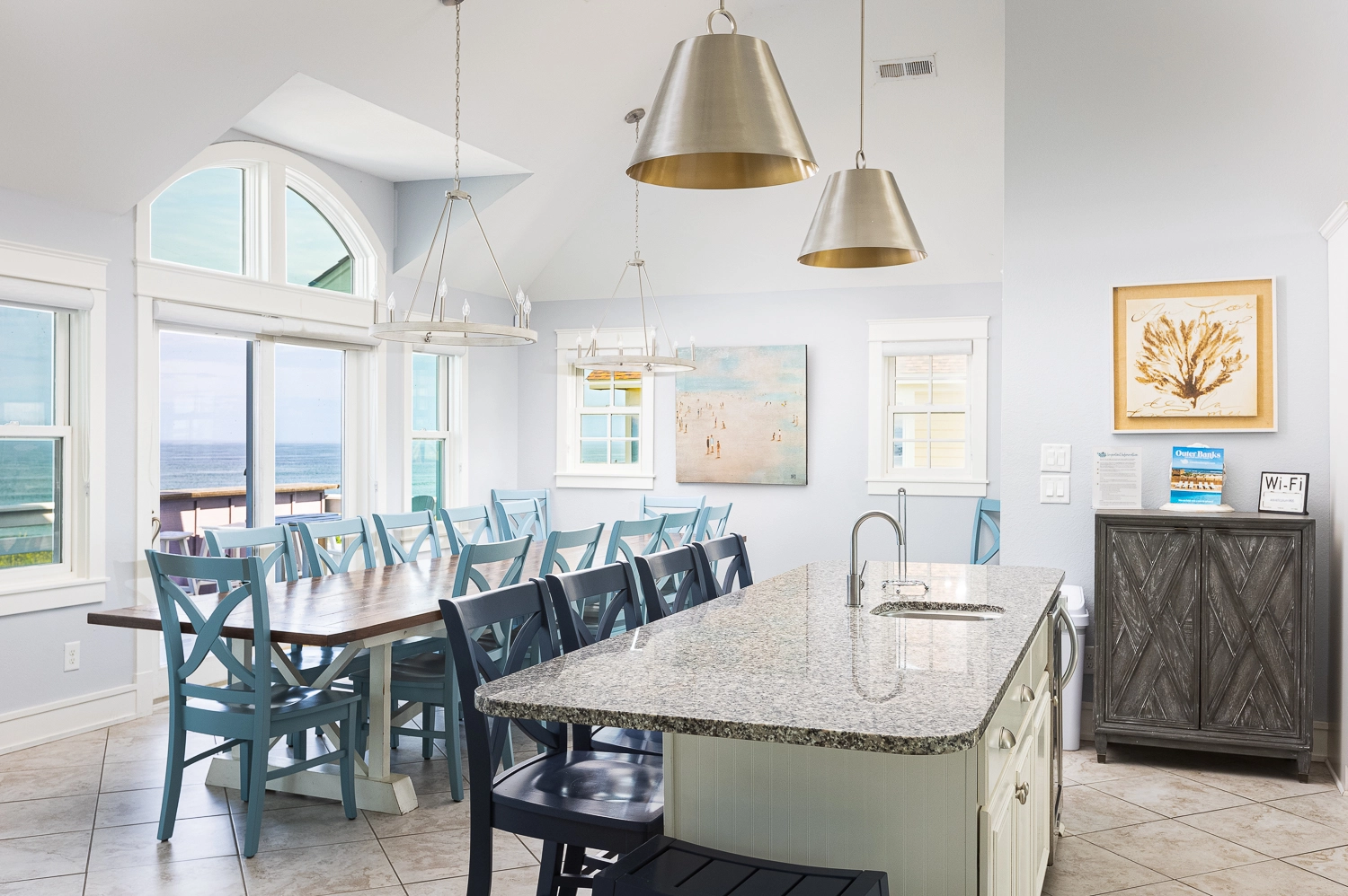 Great room with gas fireplace; kitchen with gas stove, two ovens, two refrigerators, and two dishwashers; dining area.