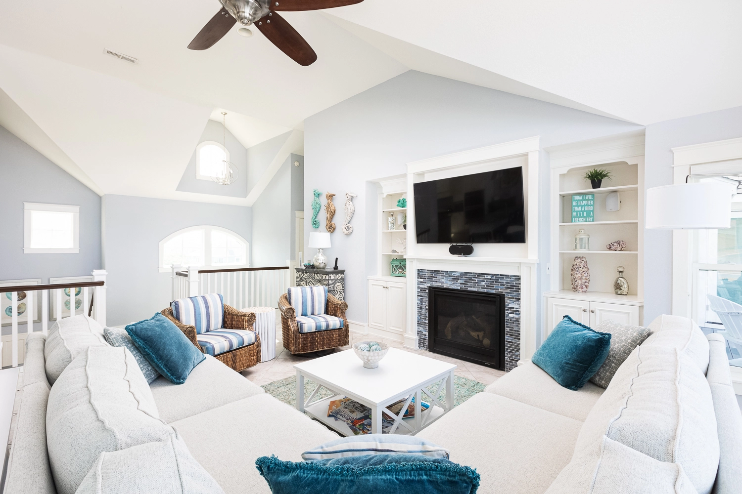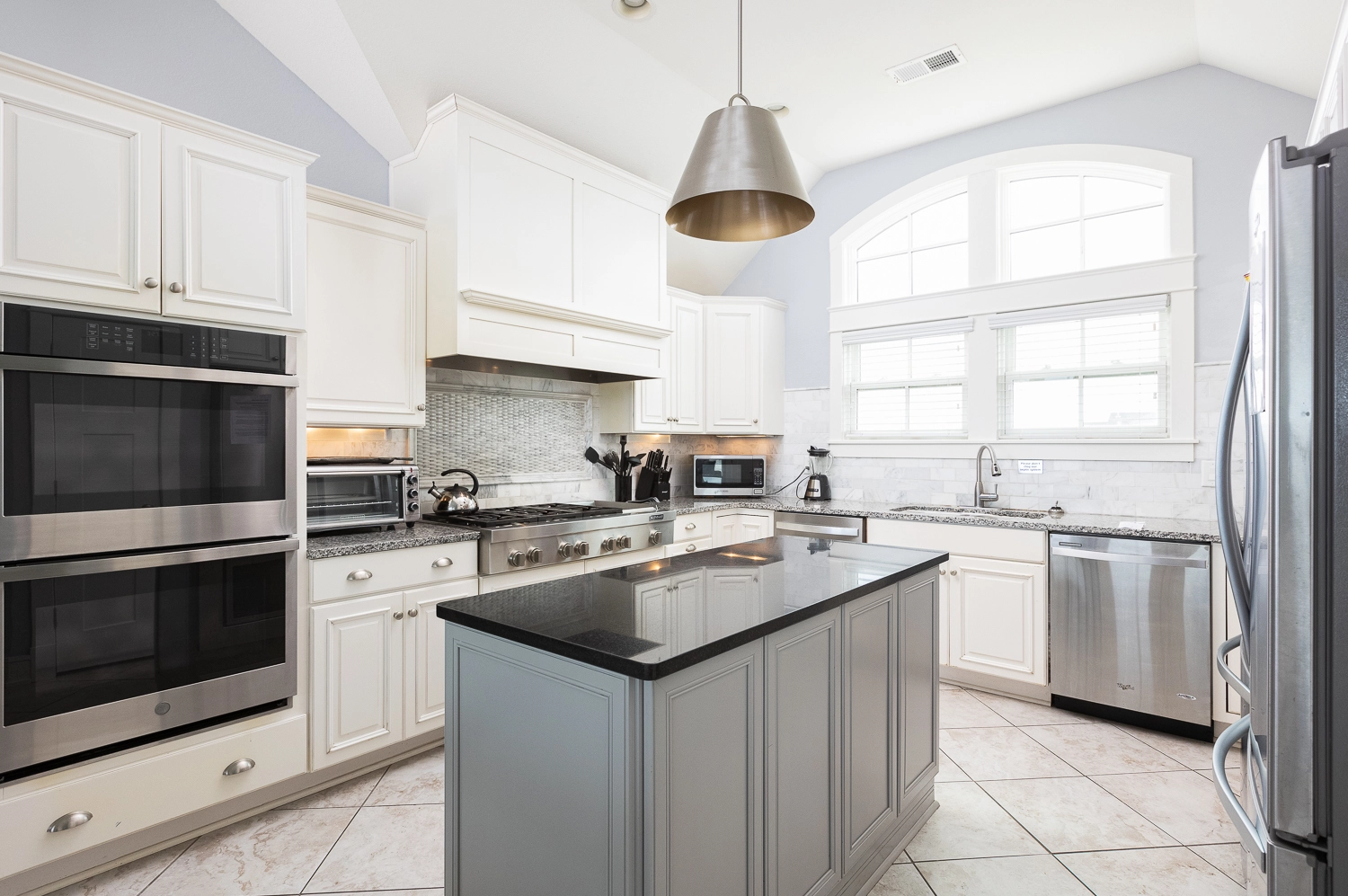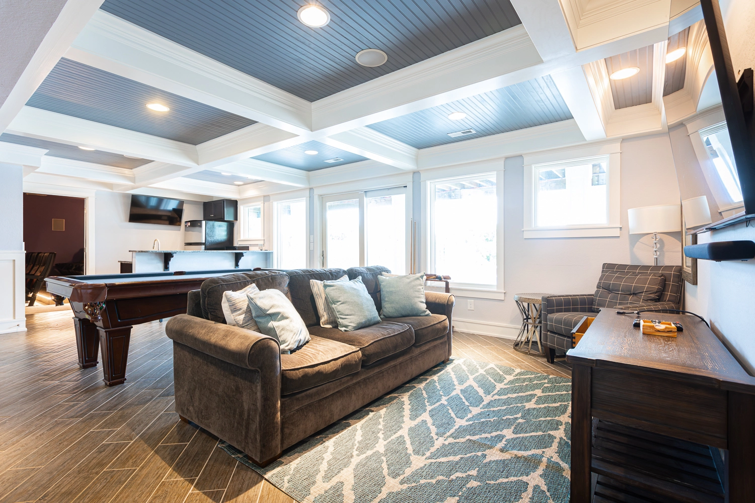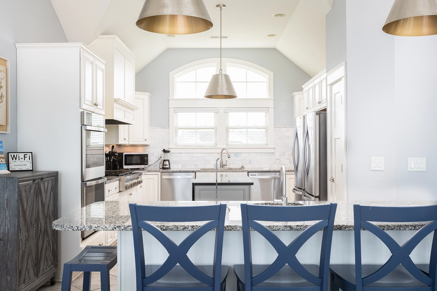 Great room with gas fireplace; kitchen with gas stove, two ovens, two refrigerators, and two dishwashers; dining area.