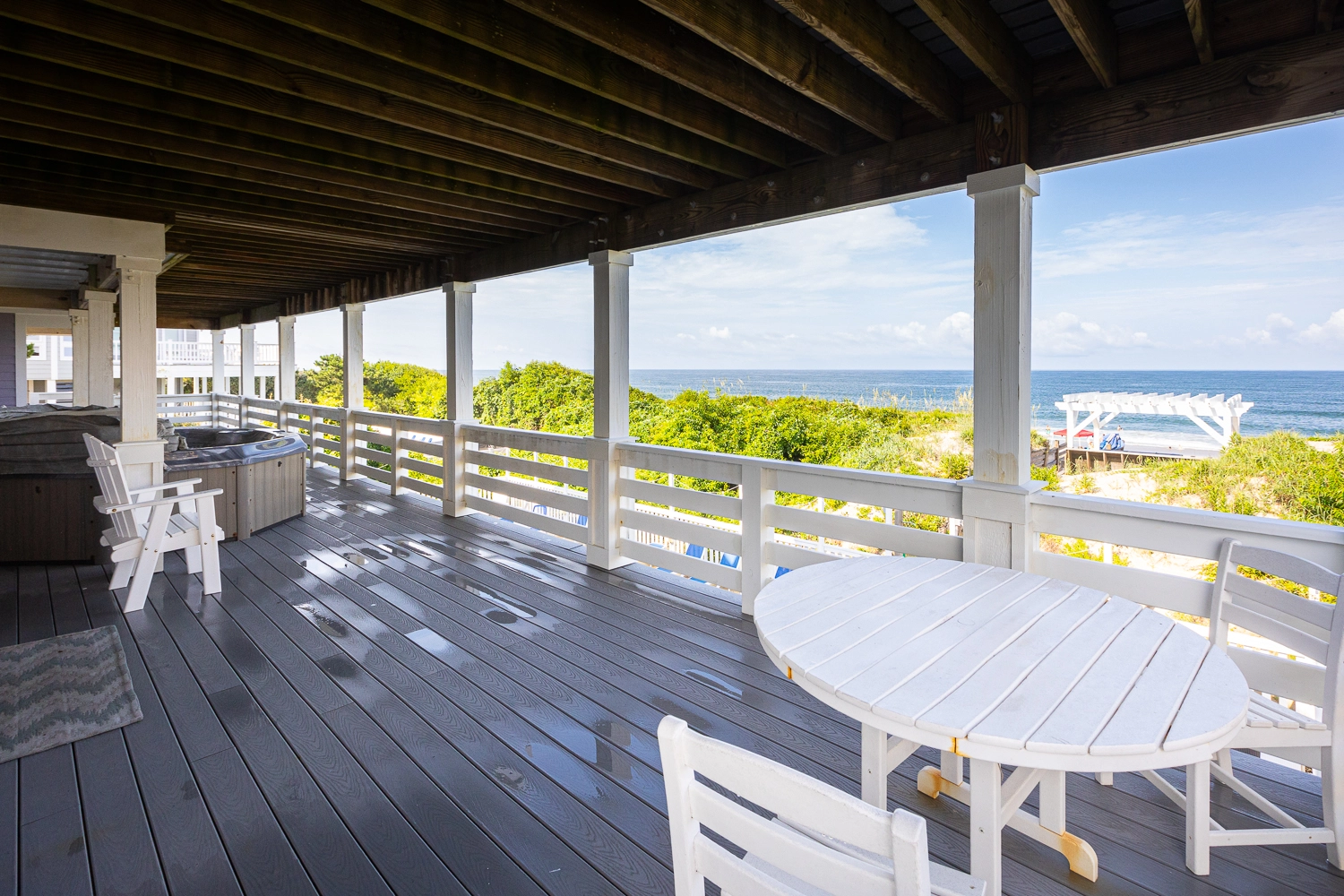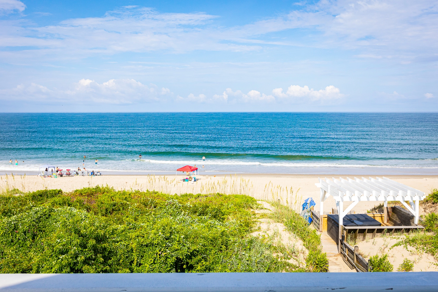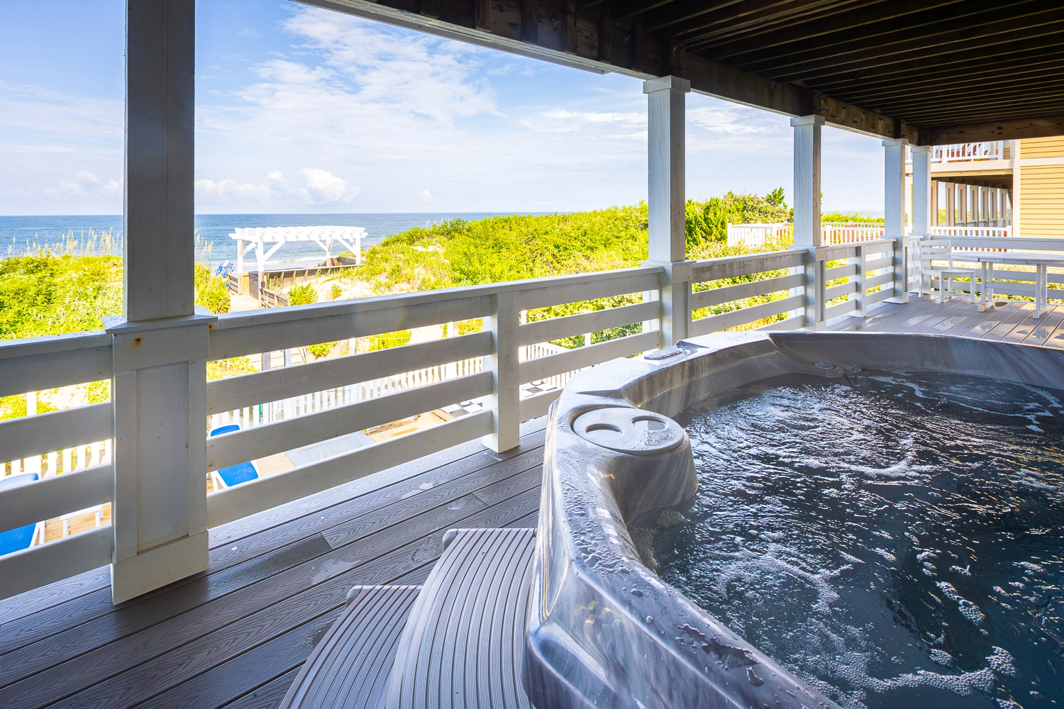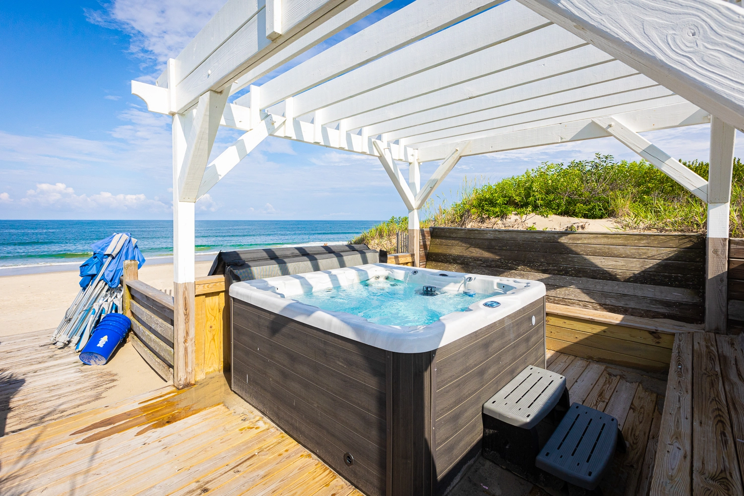 "Outside fire pit, pool area, dune top hot tub, proximity to the beach and local shops."