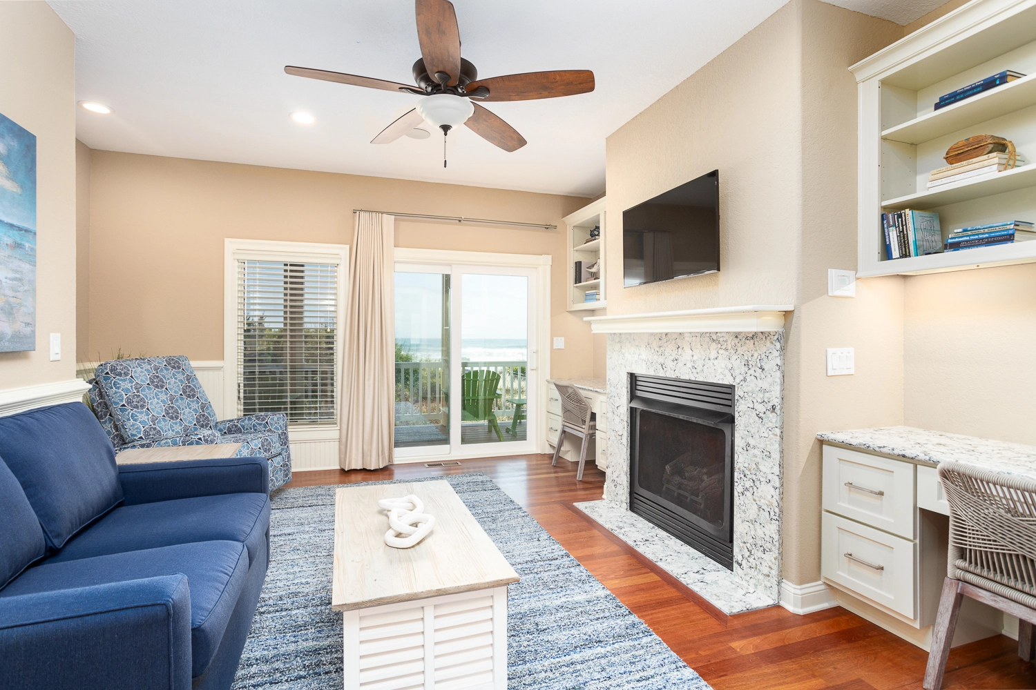 Living area with gas fireplace, wet bar and ocean views; well-appointed kitchen; dining area with ocean views; oceanfront deck.