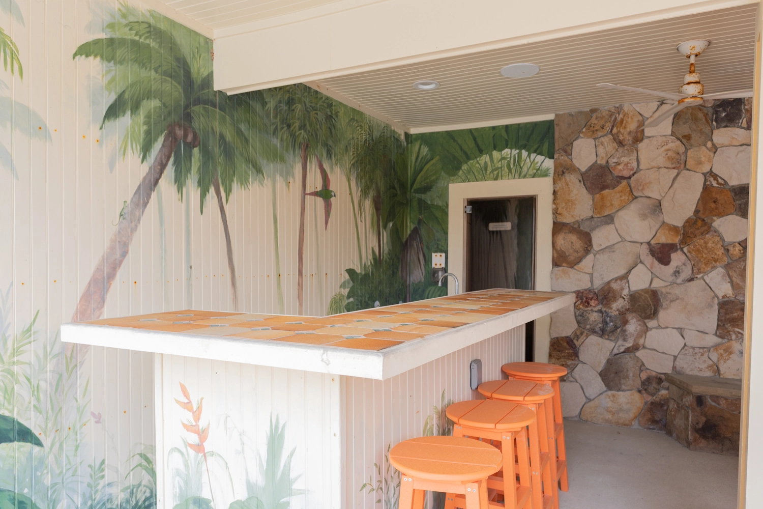 Theater room with stadium seating, oversized projection screen and surround sound; rec room with wet bar, refrigerator, microwave and deck access; laundry; covered cabana with tiki bar, outdoor half bath; outdoor gas fireplace; private pool; hot tub; oceanside deck; outside shower.