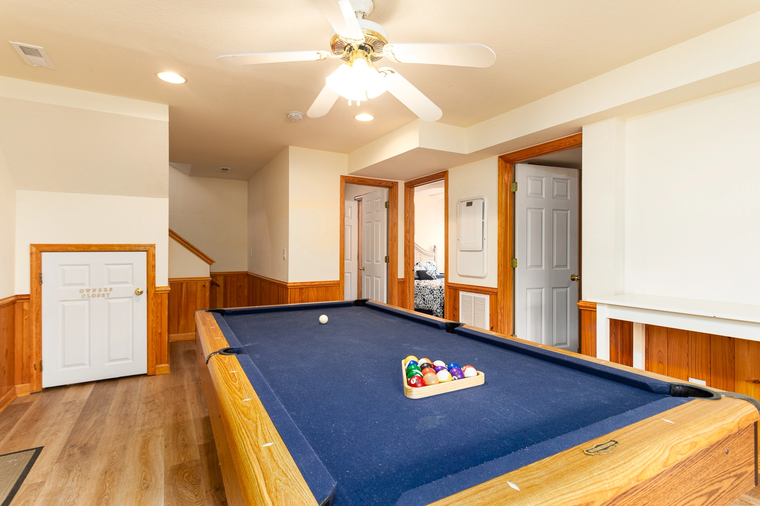 Game room with pool table; access to gated pool.