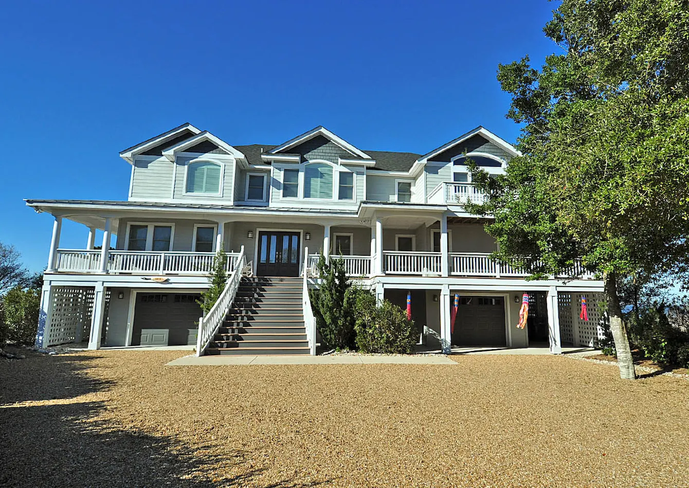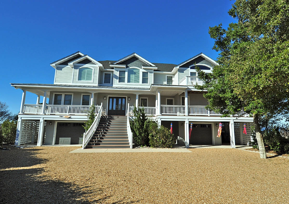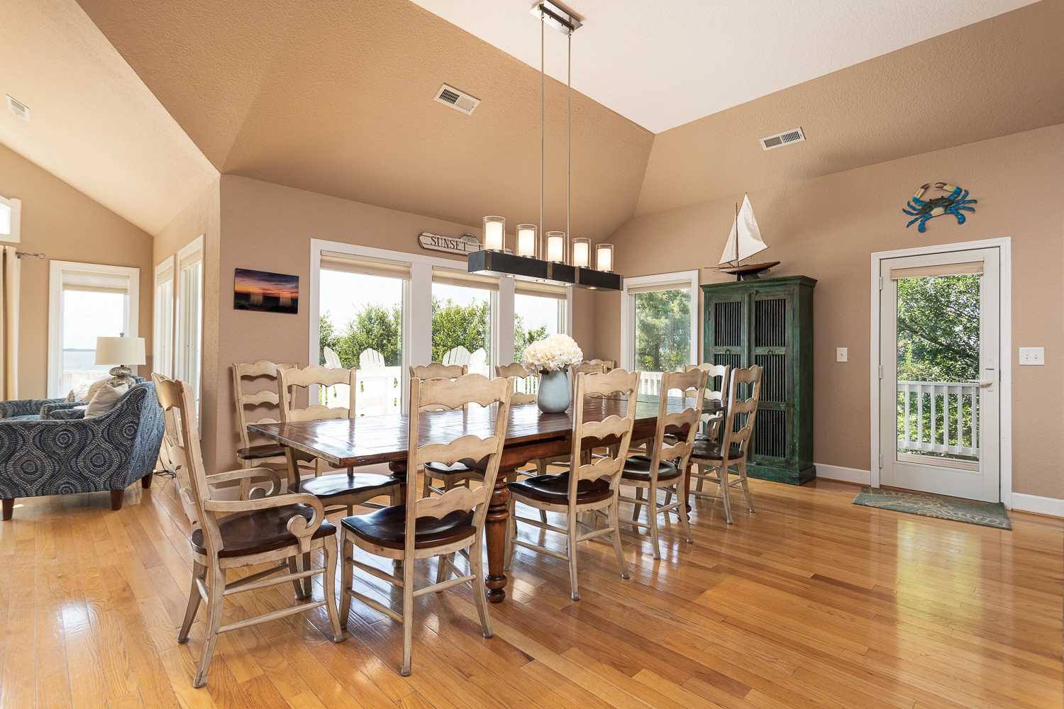 "This is an incredible home in an outstanding location! The layout of the home is superb, both in providing adequate space for everyone to gather together for meals, games, etc., but also in having great options for quiet downtime by yourself. The view of the sound is incredible--really stunning, and yet, because of the where the house is located in the neighborhood and how elevated it is, you still feel like you're far away from the main road, even though you can walk down a private staircase from the house to the road. The walk to the beach is easy as well. Every appliance was in good working order, and the kitchen is very well stocked to make great meals at the house--we didn't go out to eat once during our entire stay. This is simply one of the nicest homes we've ever rented in 20 years of OBX trips; can't wait to return!"