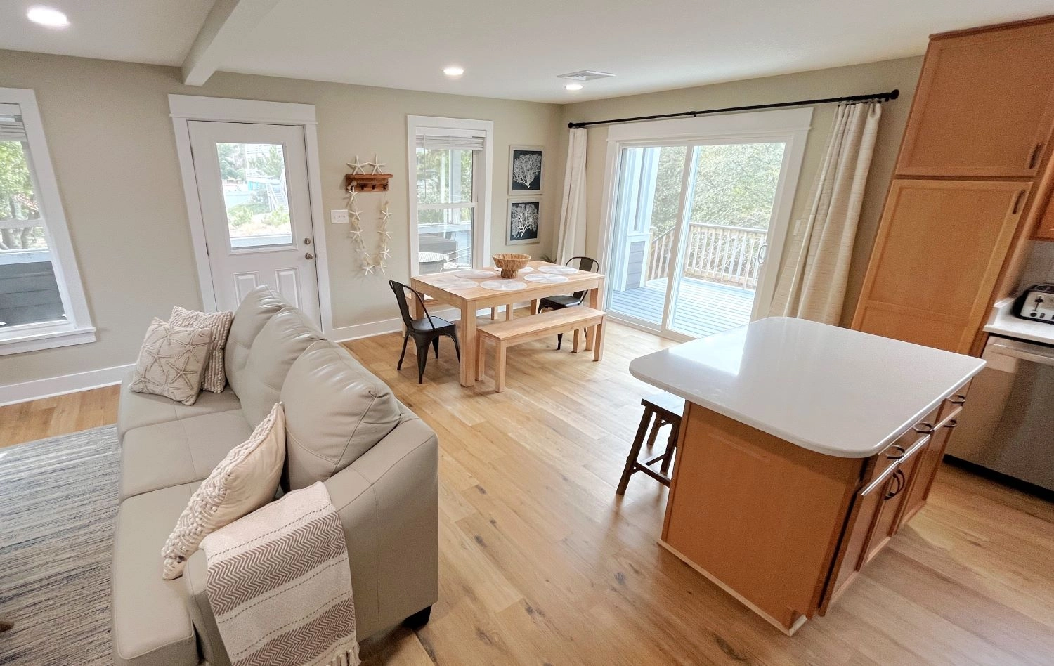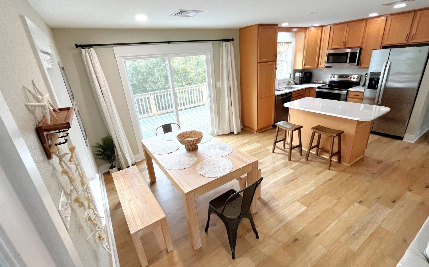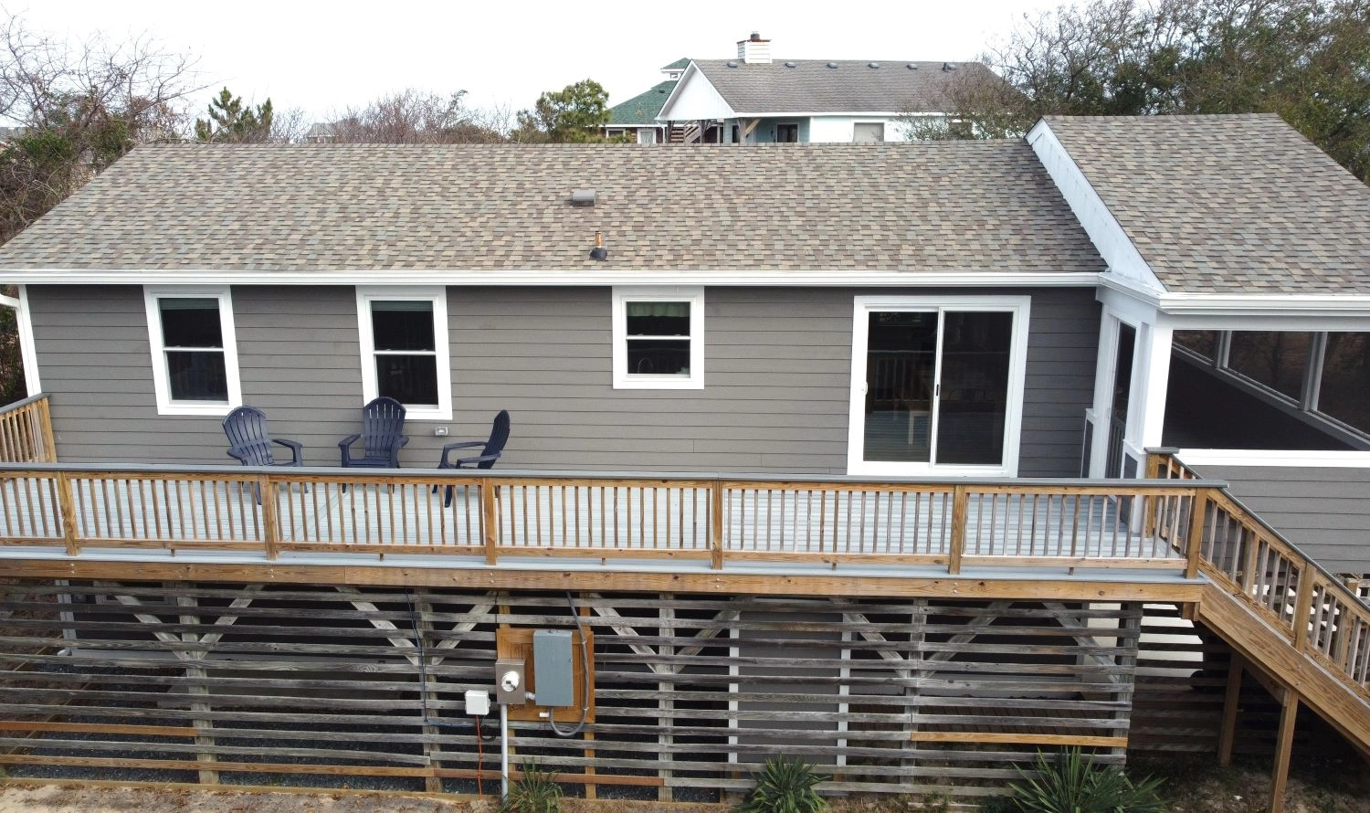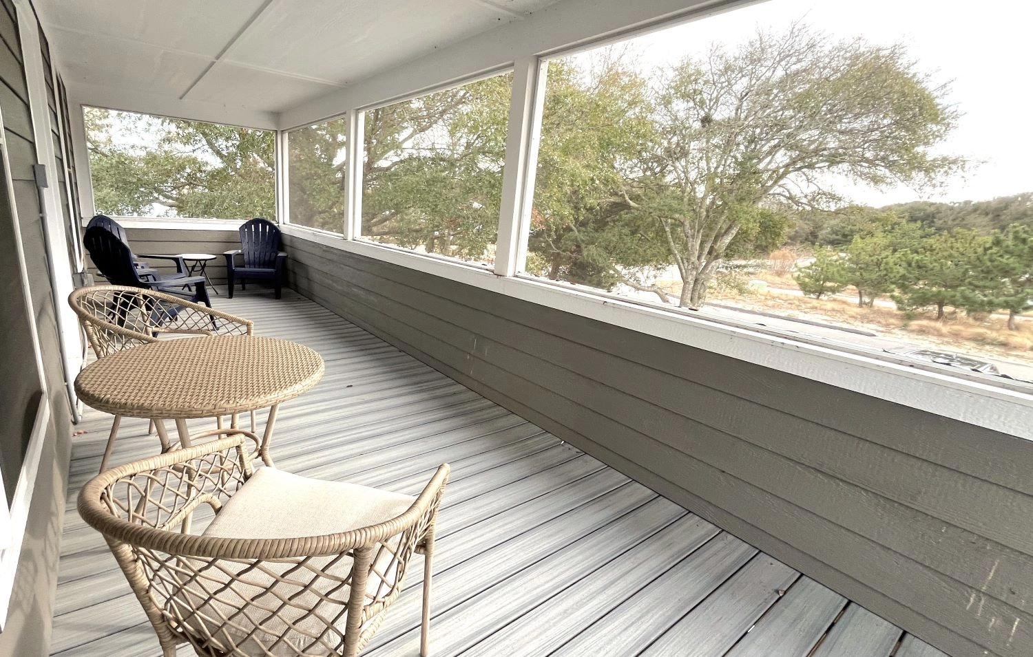 "Convenience to local shops and restaurants in Duck made everything very walkable. Having two living spaces/tv areas on separate floors made staying there with friends more enjoyable as we each had our own common areas. The screened in porch was a huge hit and great for morning coffee. Pool was a great size and lots of fun for the kids due to all the steps/platforms."
