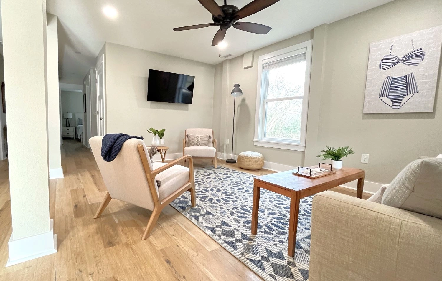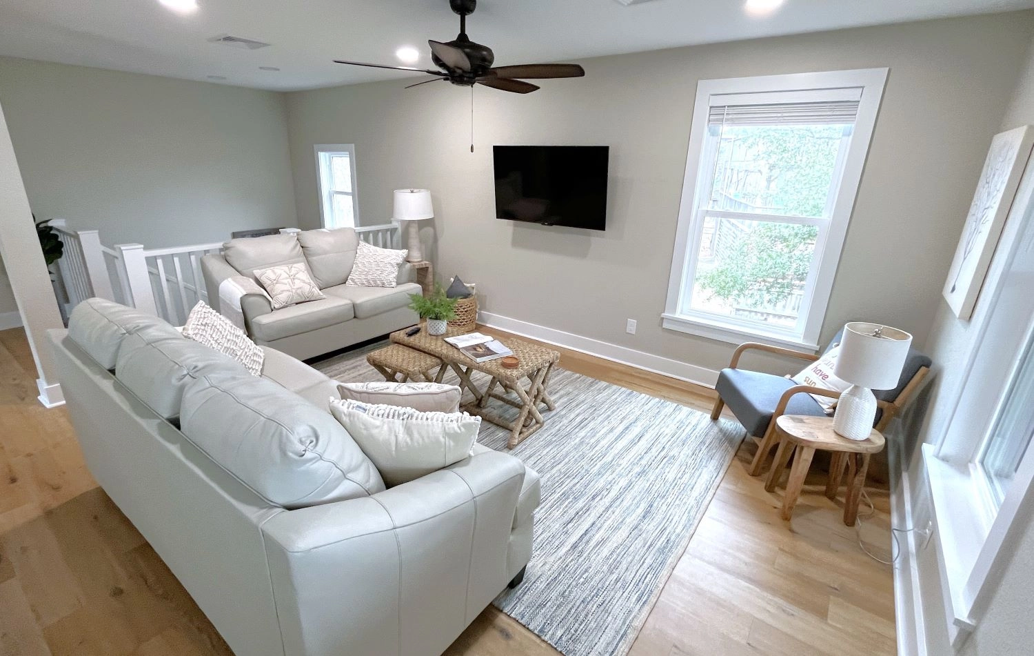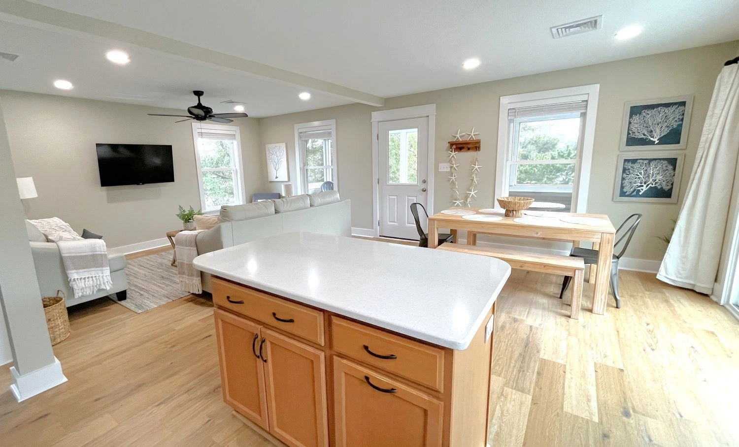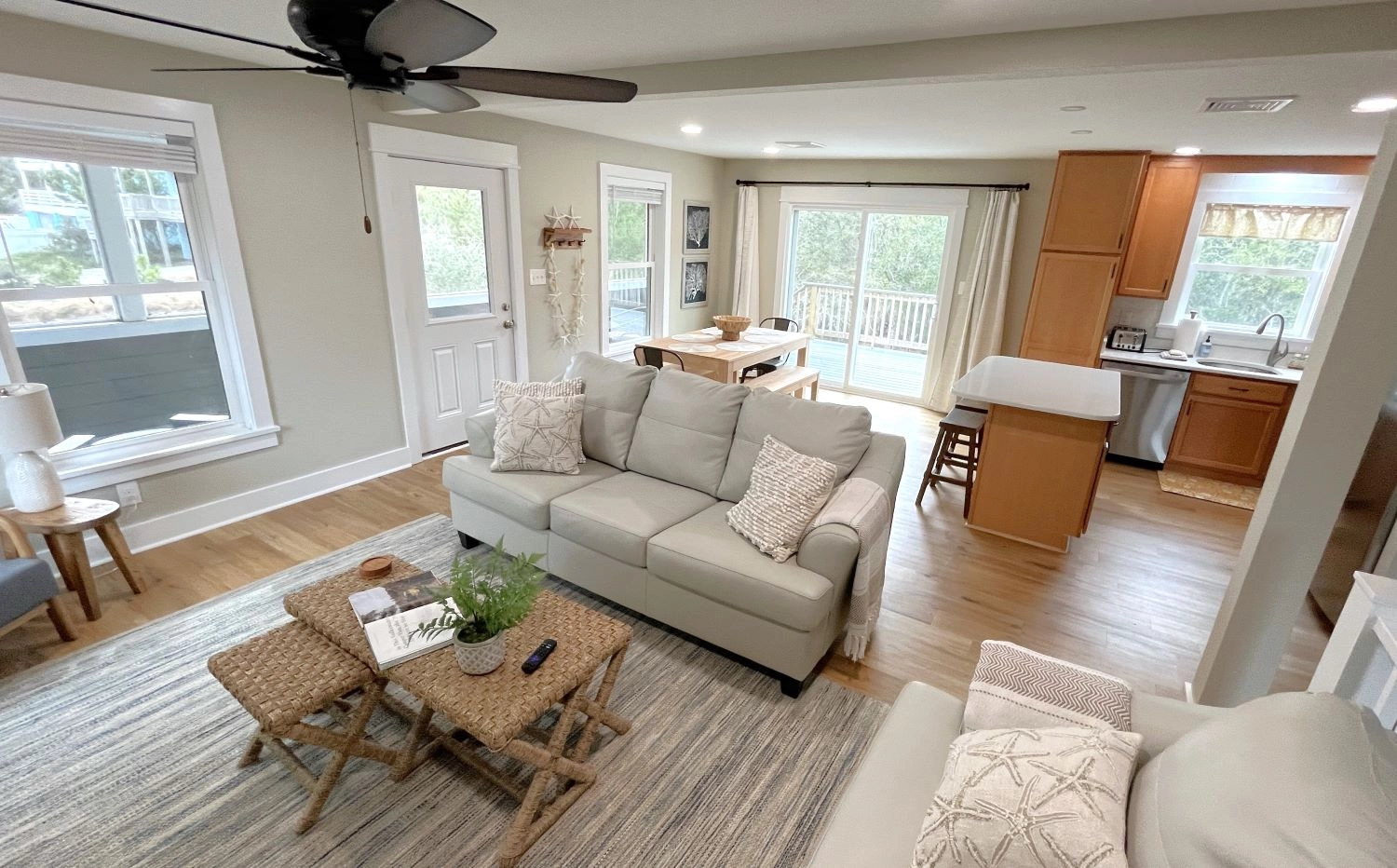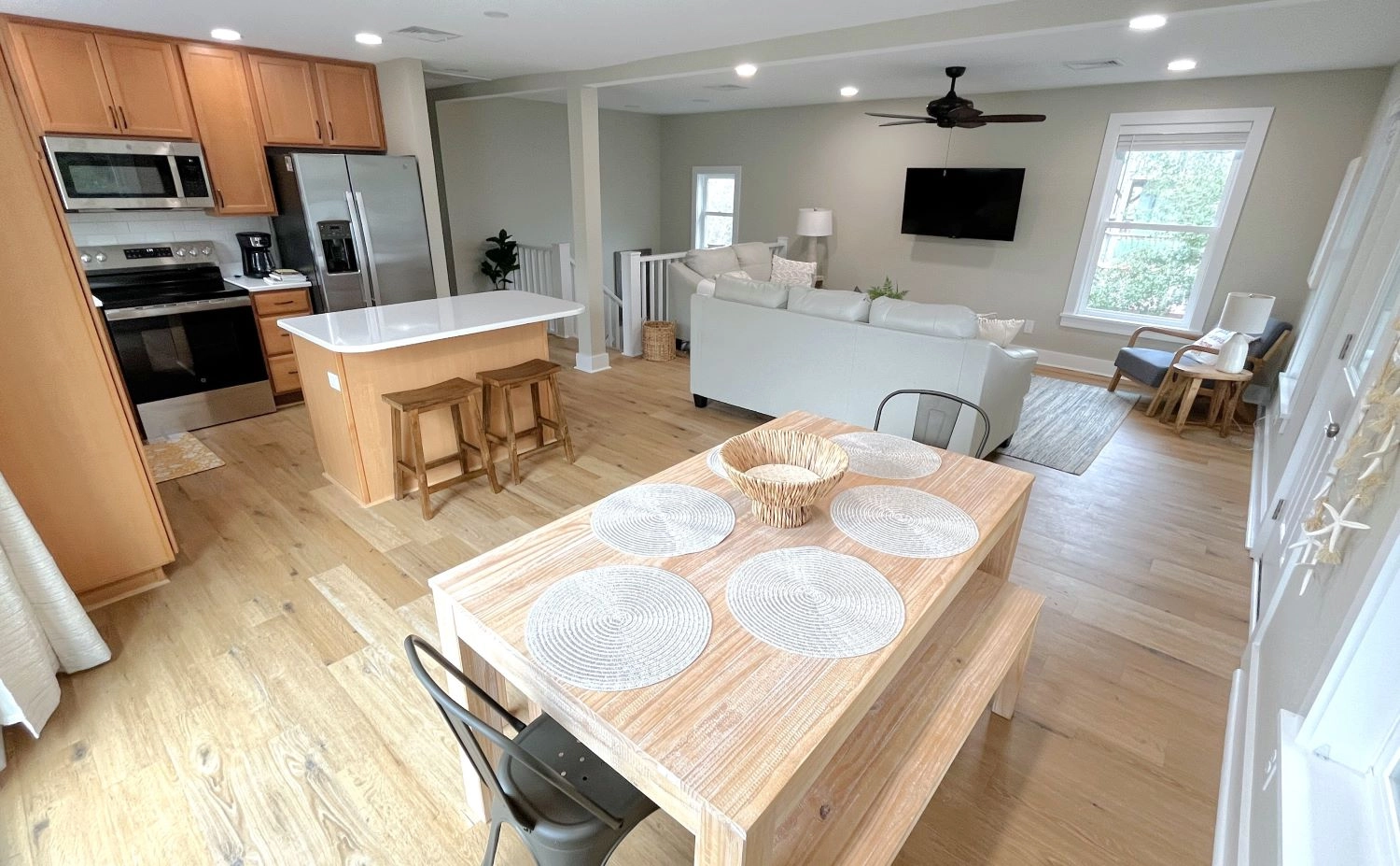 "Convenience to local shops and restaurants in Duck made everything very walkable. Having two living spaces/tv areas on separate floors made staying there with friends more enjoyable as we each had our own common areas. The screened in porch was a huge hit and great for morning coffee. Pool was a great size and lots of fun for the kids due to all the steps/platforms."