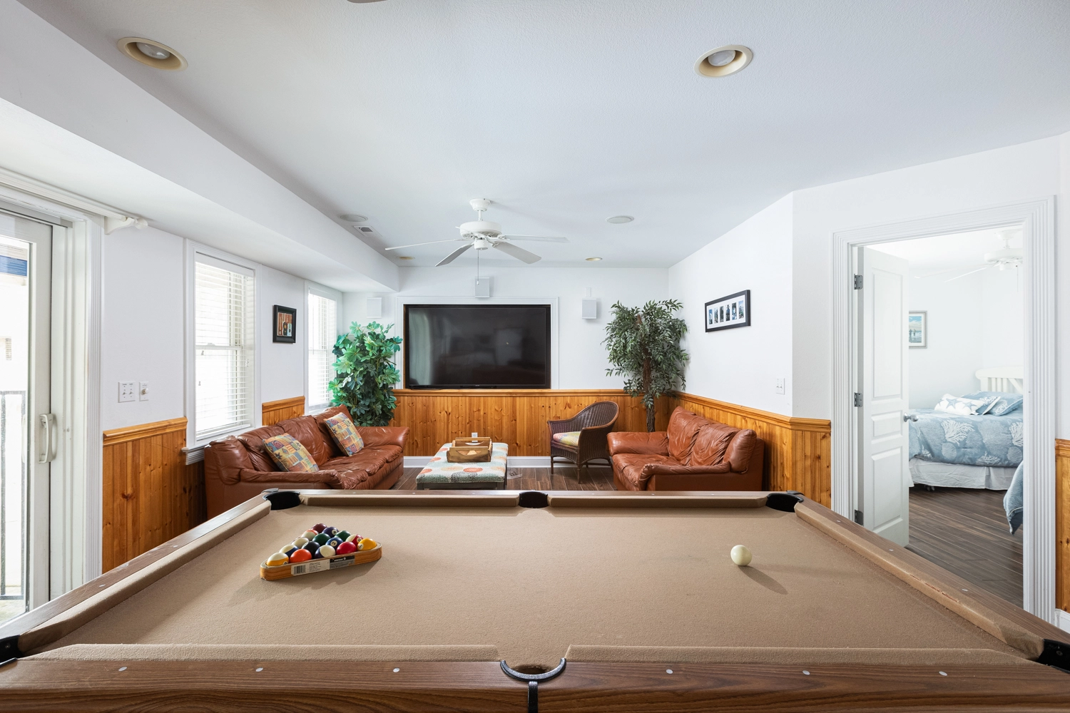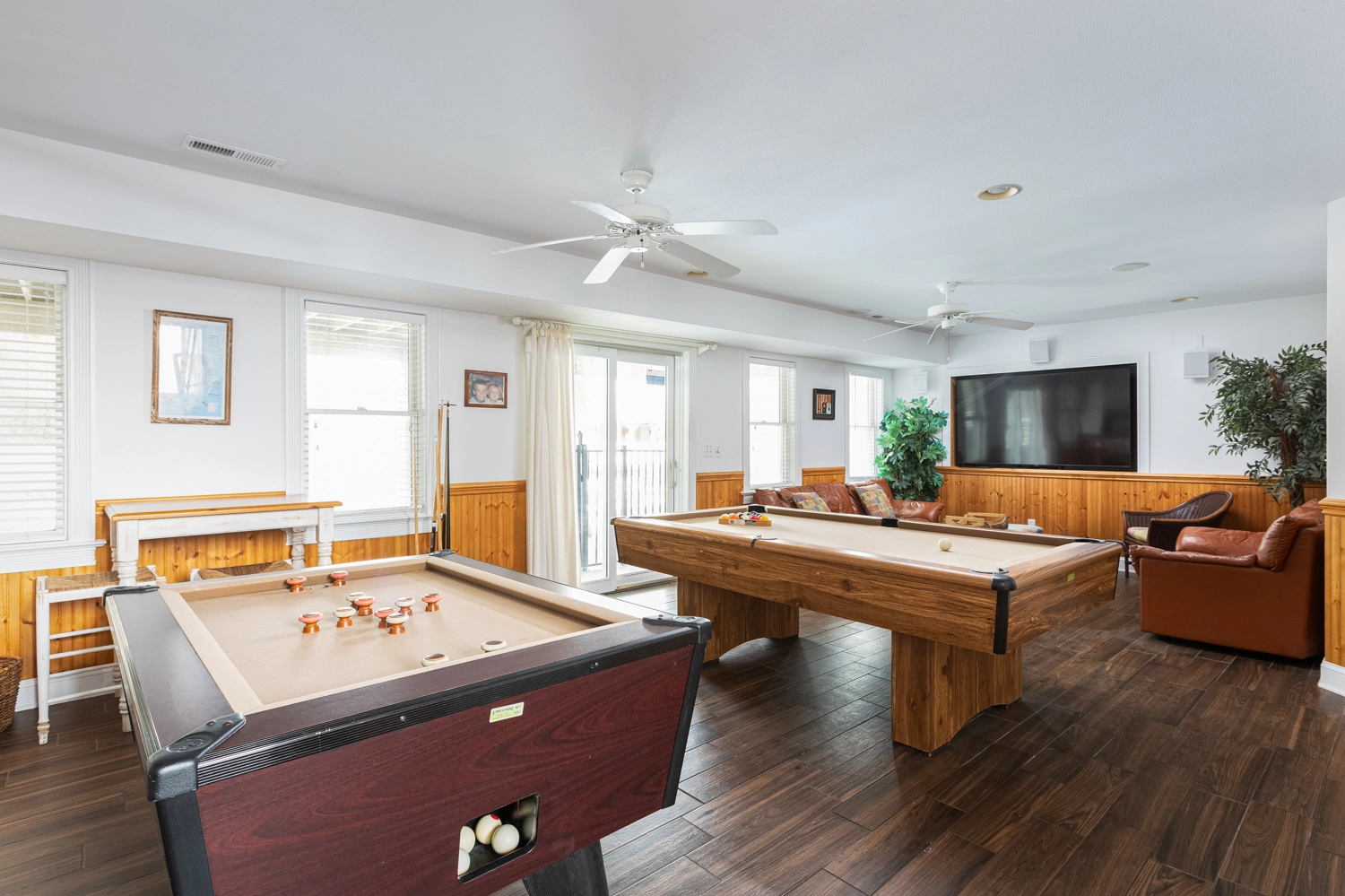 Game room with entertainment center, bumper pool table, billiards table, kitchenette with dishwasher, refrigerator and microwave; patio with pool and hot tub.