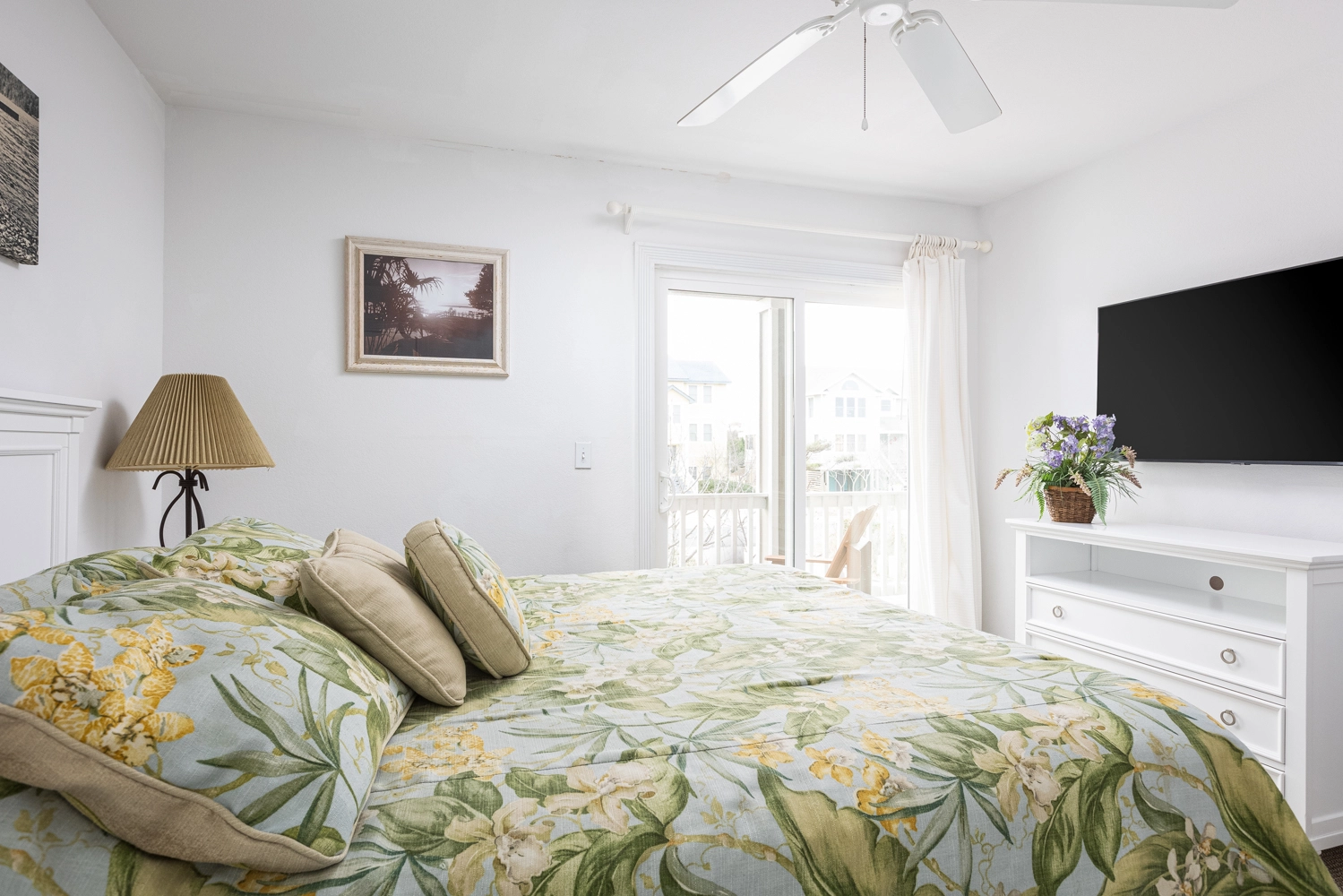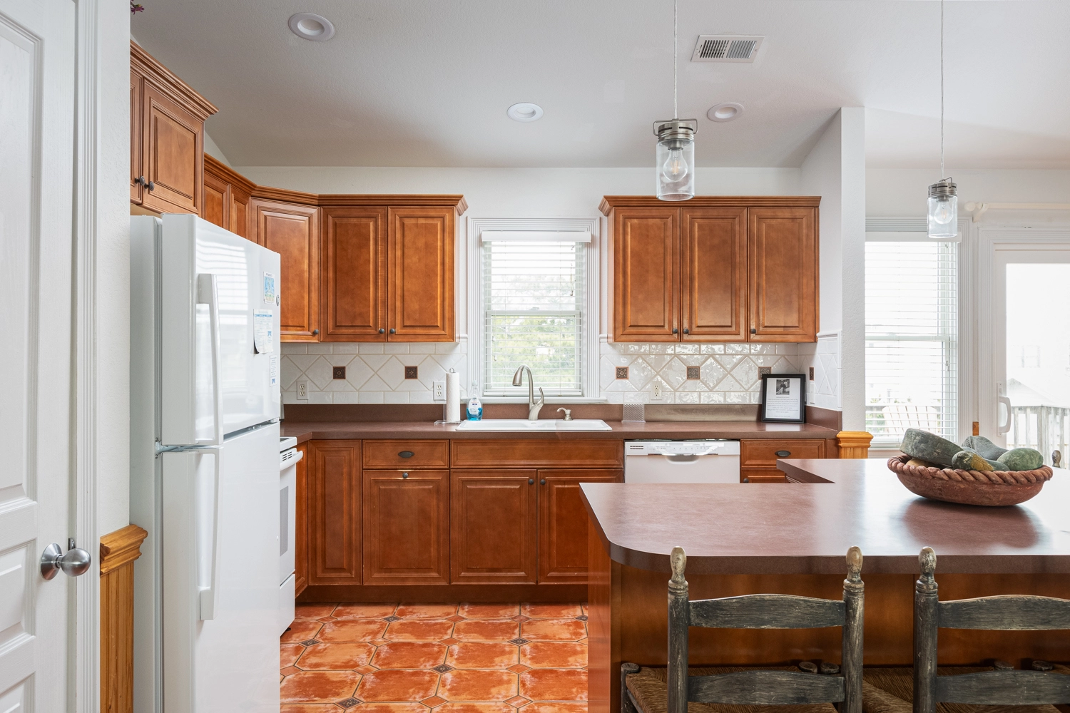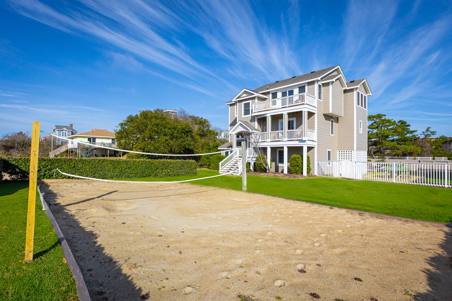 "This is a great home that is pet friendly. We were able to bring our pets without worry because of the fenced in back yard. Each room has its own full bathroom which made it a plus for large families like ours. Very short walk to the direct beach access which was perfect. You could see the ocean from the top decks of the house as well.... perfect vacation spot for our family would definitely use this property again as this was our second time using it."