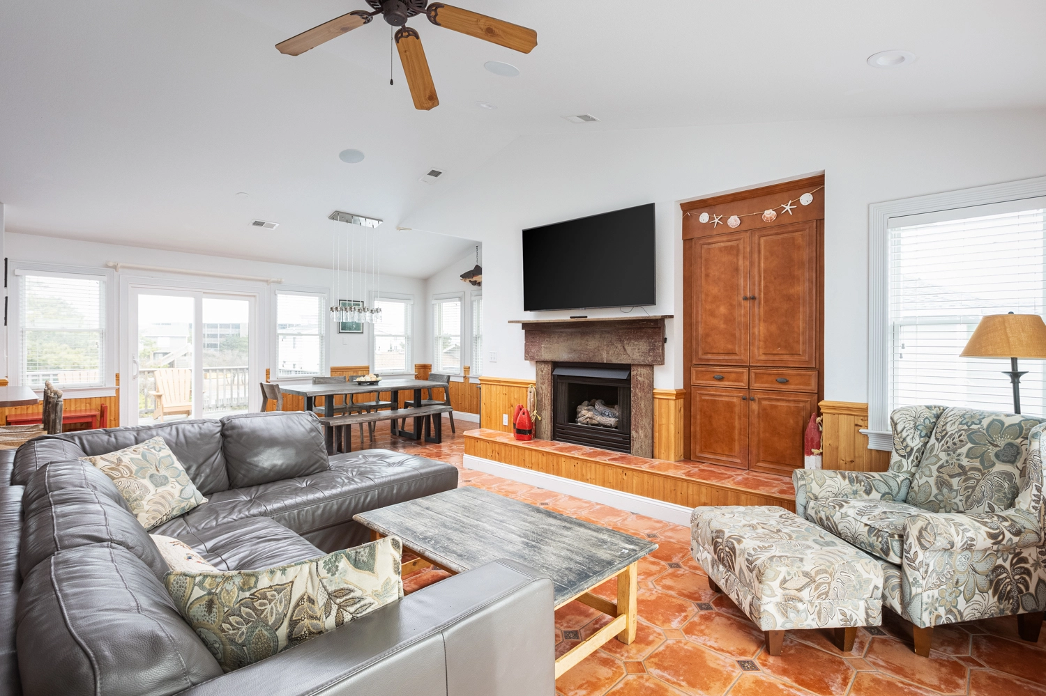 Great room with entertainment center; kitchen; dining area; decks.