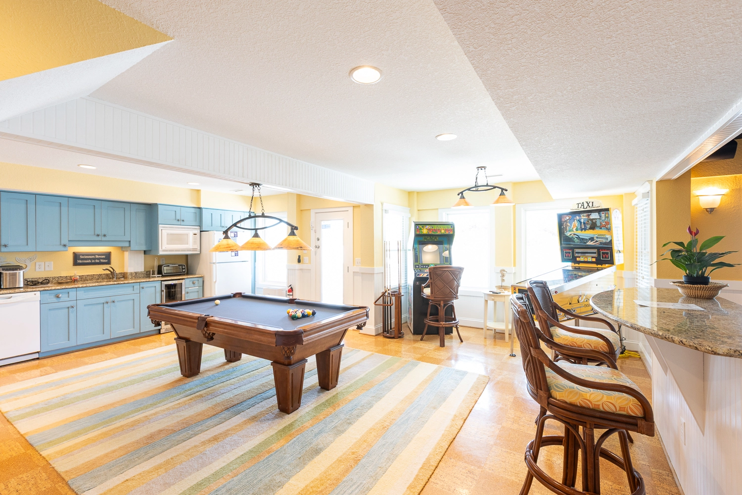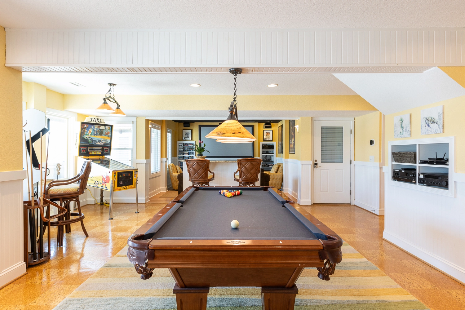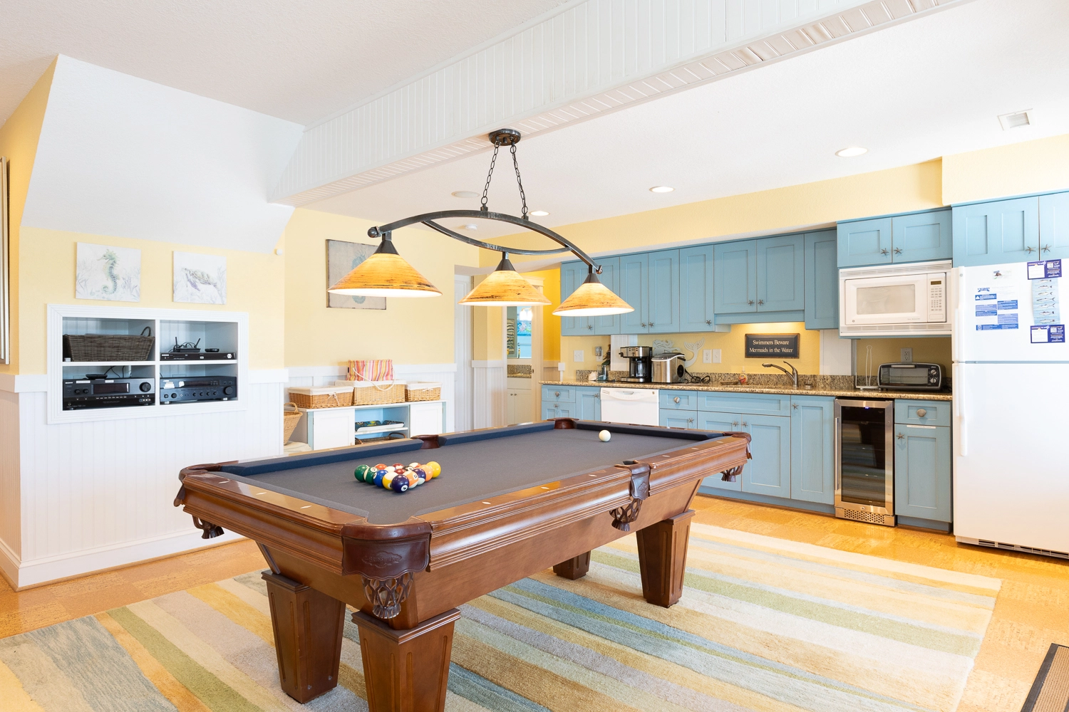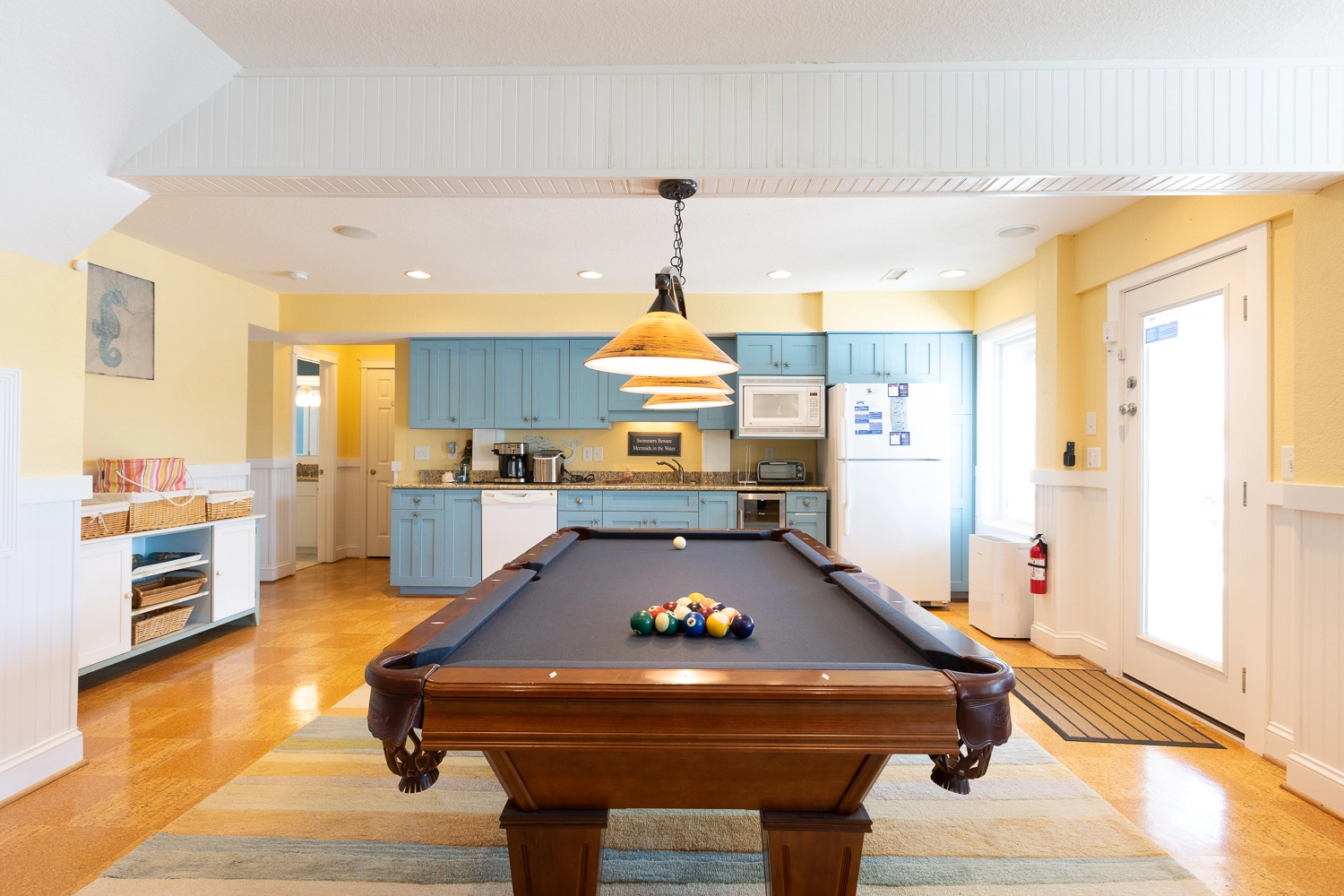 Rec room with pool table, media room, and kitchenette with refrigerator and dishwasher; access to the pool, hot tub and a half bath accessible from the outside only.