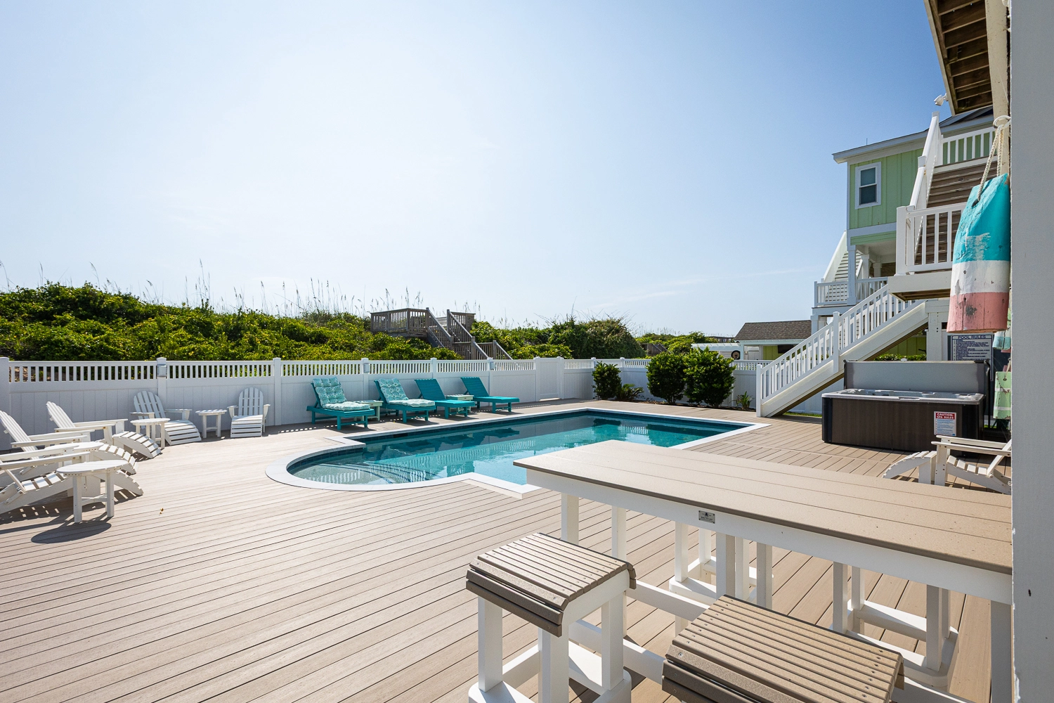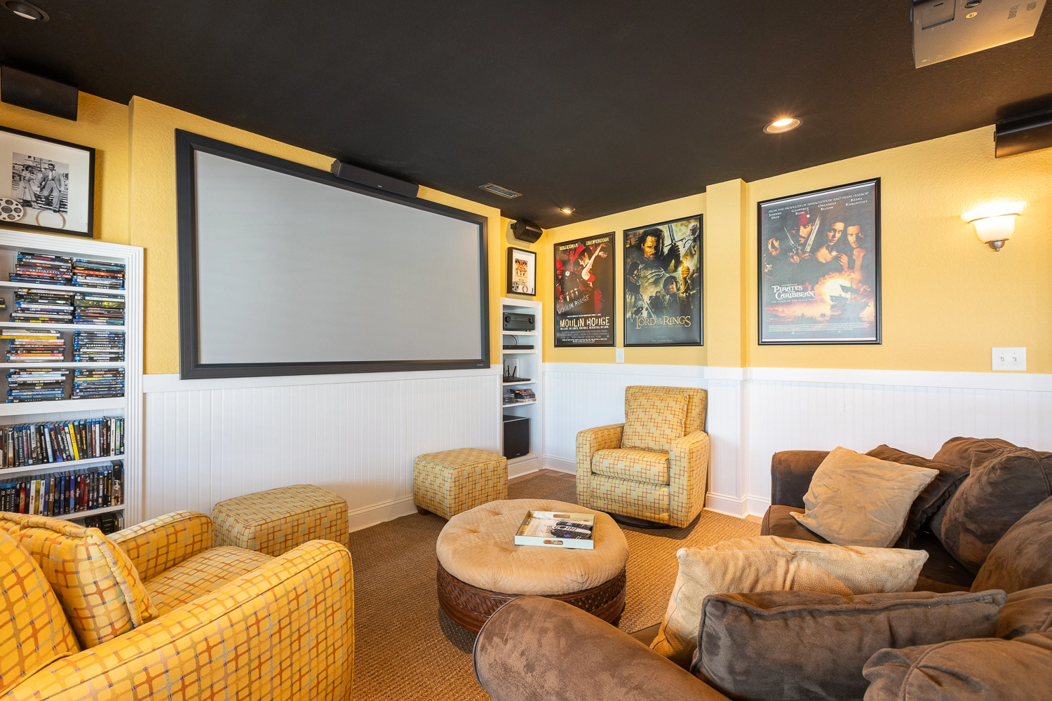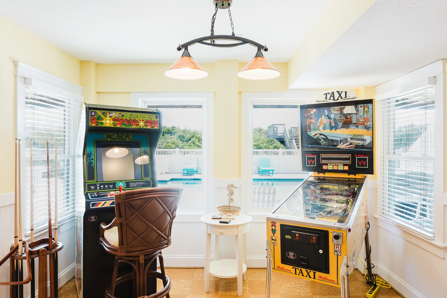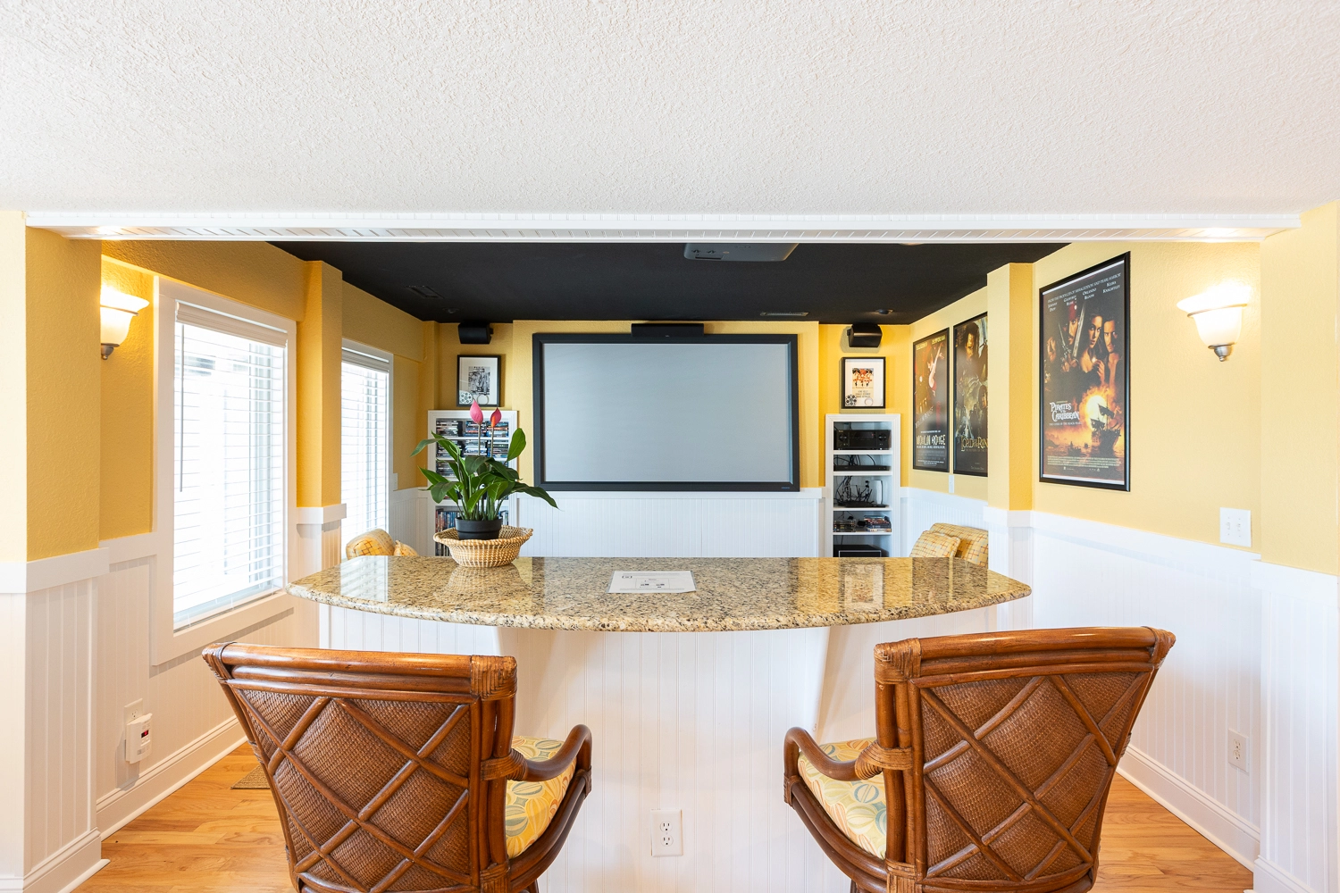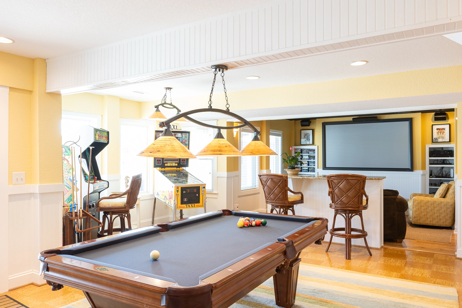 Rec room with pool table, media room, and kitchenette with refrigerator and dishwasher; access to the pool, hot tub and a half bath accessible from the outside only.