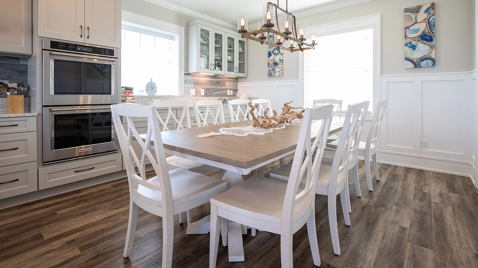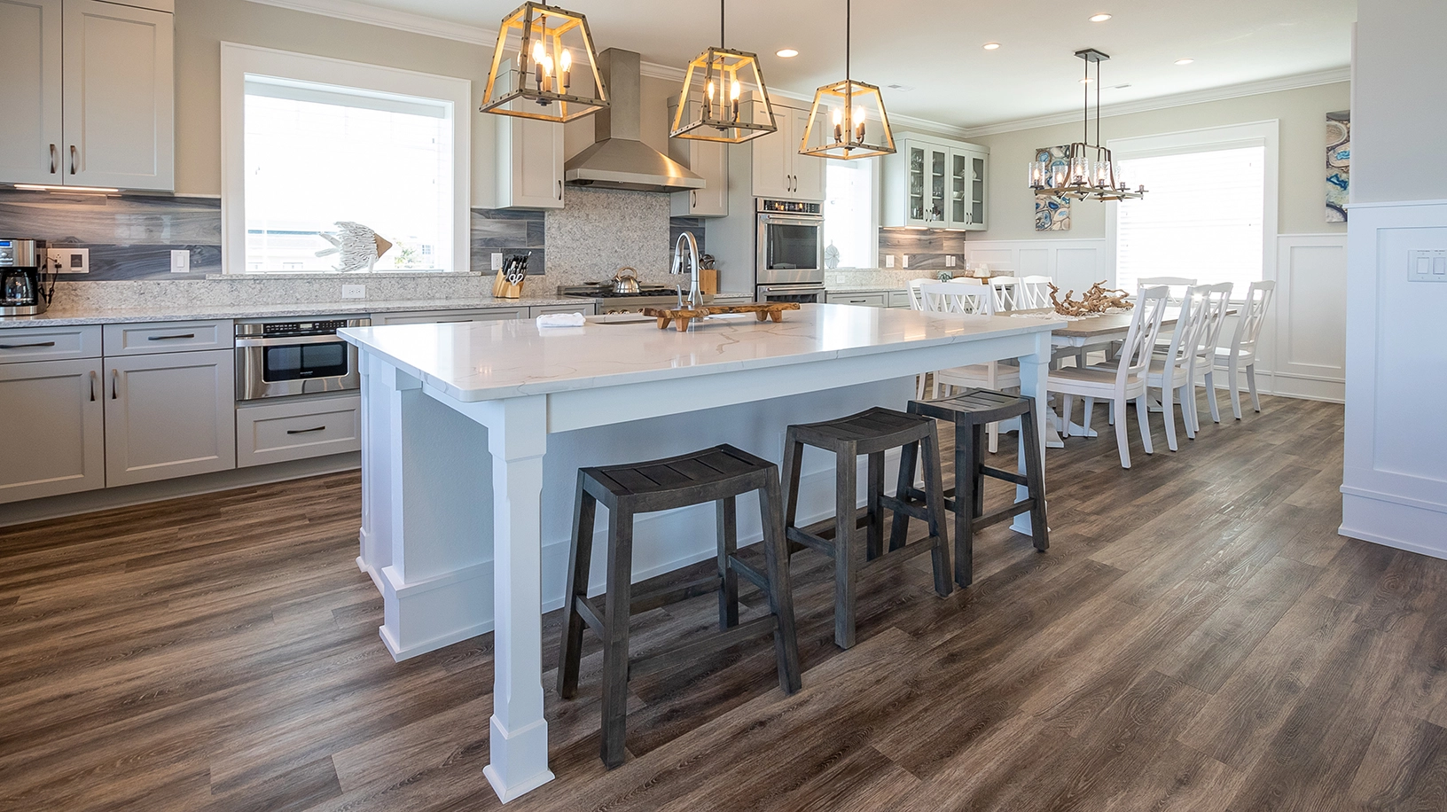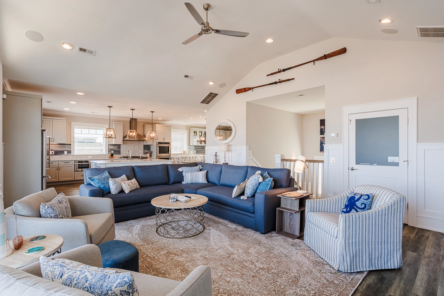 Great room; kitchen with gas stove top, three ovens, two dishwashers, and two refrigerators; dining area.
