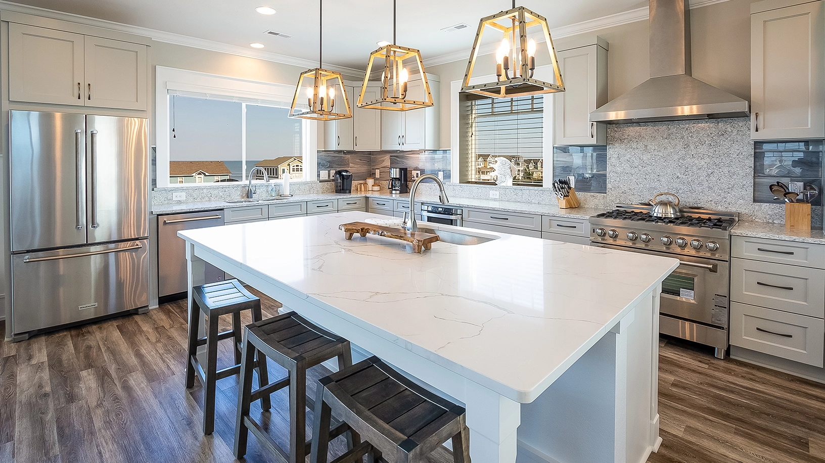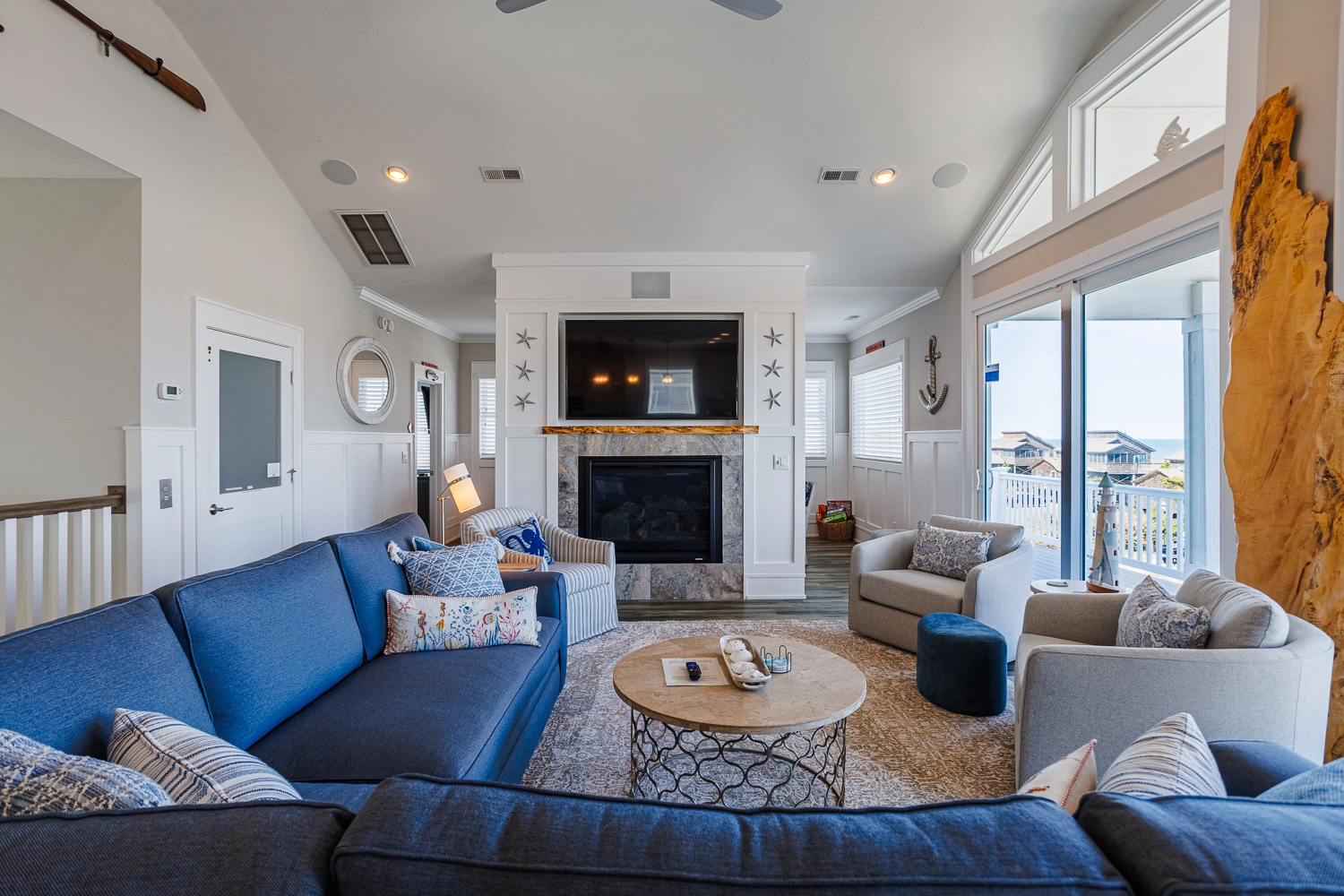 Take the elevator or stairs to the top floor where you’ll immediately be awed by picturesque ocean views and an abundance of natural light flooding in through plentiful floor-to-ceiling windows. In addition to the views, the impressive beauty of the interior furnishings are also sure to catch your eye. Colors, textures, and unique statement pieces are meticulously coordinated giving every corner of the home a feeling of coastal elegance. Although the home is incredibly spacious and open, it still retains a feeling of coziness and warmth that you and your loved ones will appreciate. The kitchen is on the east side of the home, so endless views of the ocean can be enjoyed while cooking or hanging out around the spacious seated bar. Stainless steel appliances which include 3 ovens, two dishwashers, and two refrigerators make it easy and enjoyable to entertain for a full house. The gas stove top will bring out your inner chef! Granite countertops and upscale custom cabinetry enhance the beauty of this well designed professional kitchen. A generous island with bar seating is the only divider between the kitchen and great room so the family chef won’t miss out on a moment of the festivities. A bonus Den with an additional television lies just off of the great room, providing more space to gather together as a family. A dining area is conveniently located next to the kitchen, making serving meals an easy task. There’s also a half bath for use while enjoying the common areas. A king master bedroom with attached bath and deck access creates the perfect space for the heads of the household to rest up after a full day of activities.