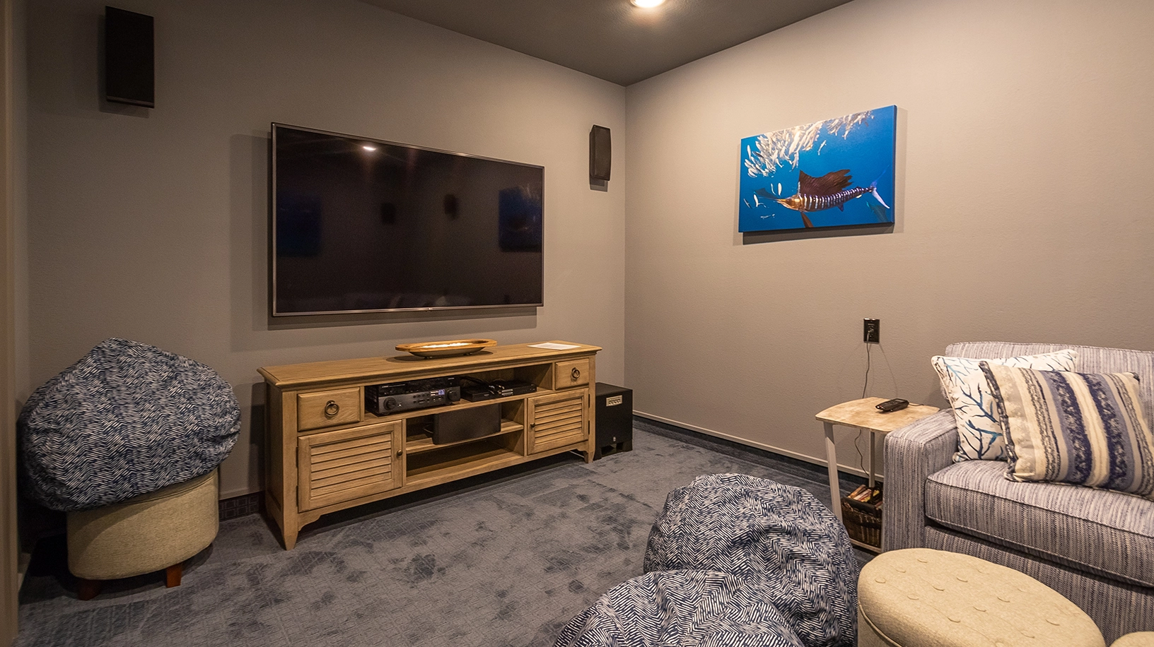 "Kitchen, upper level deck, game room, movie room"