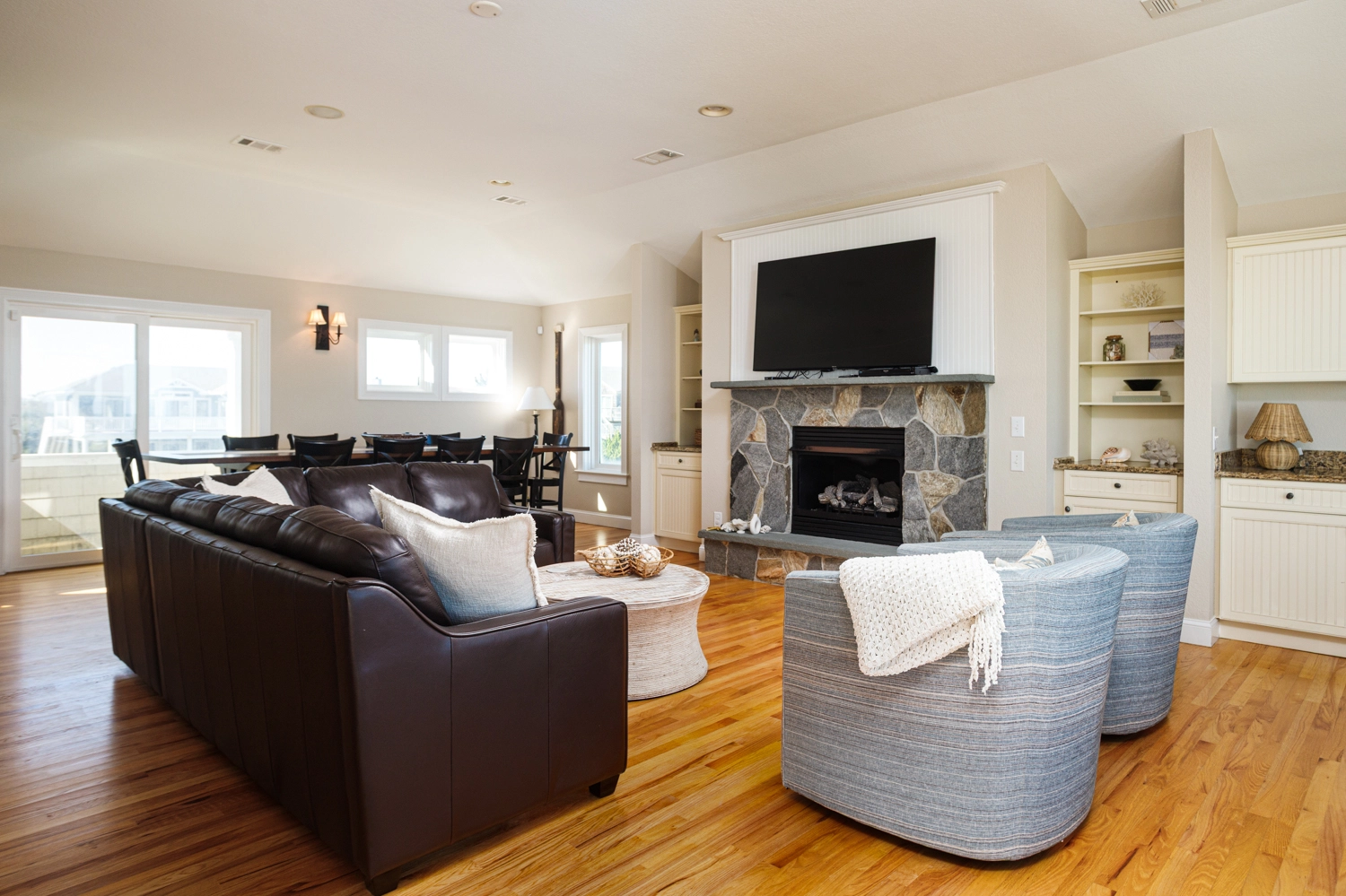 Great room with wet bar; kitchen; dining area; oceanside and soundside decks.