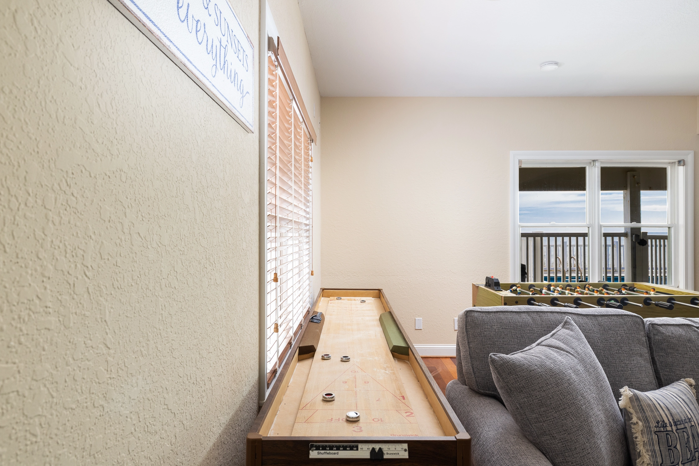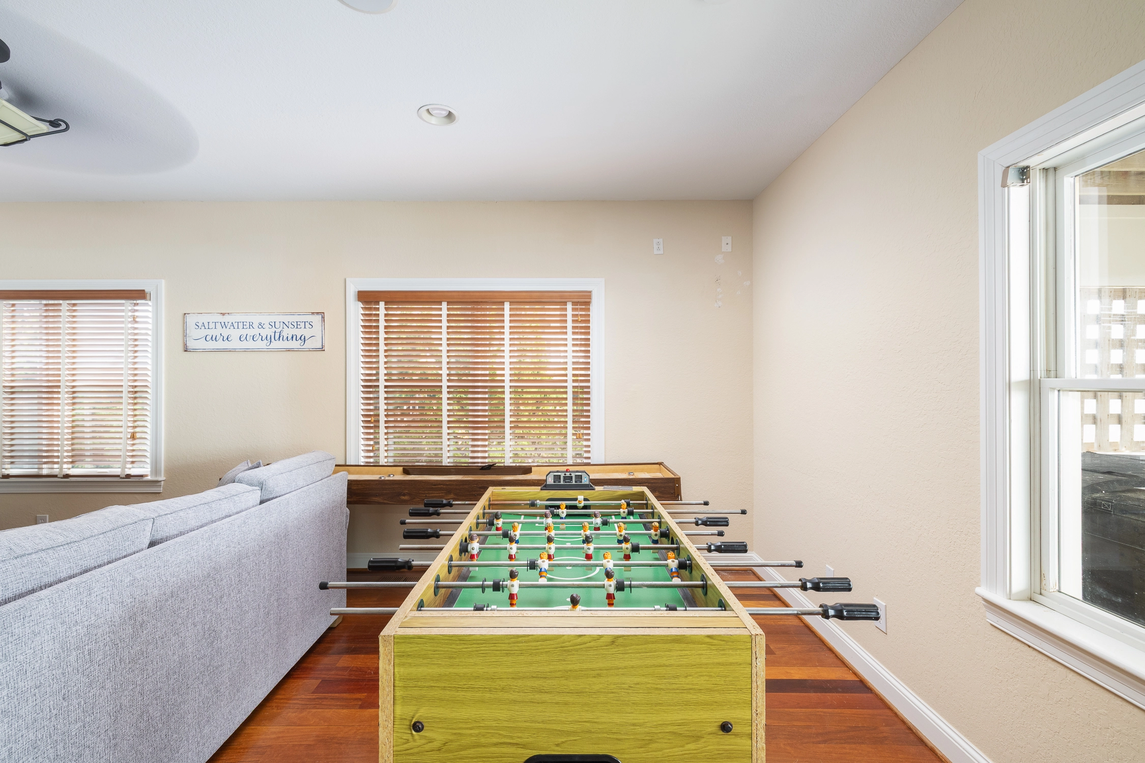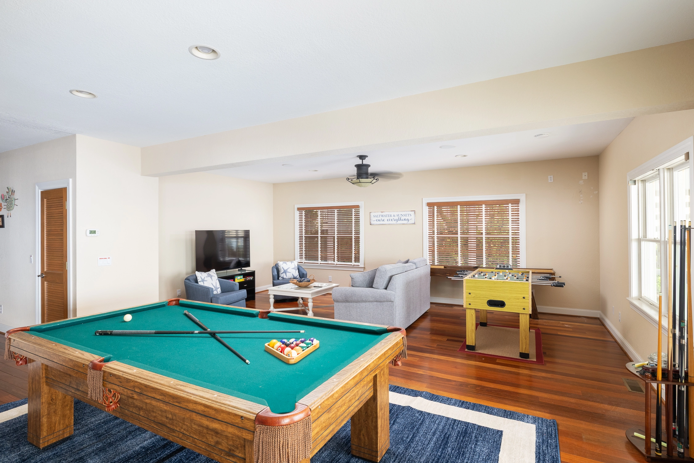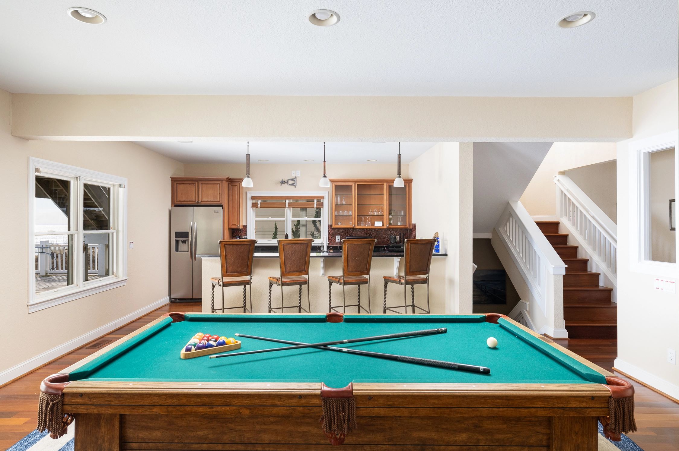 Rec room with pool table, foosball, and kitchenette with refrigerator and dishwasher.