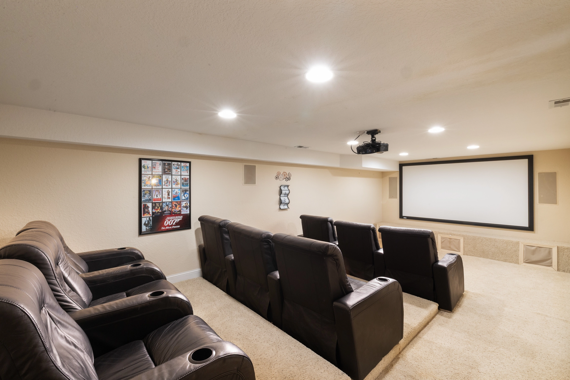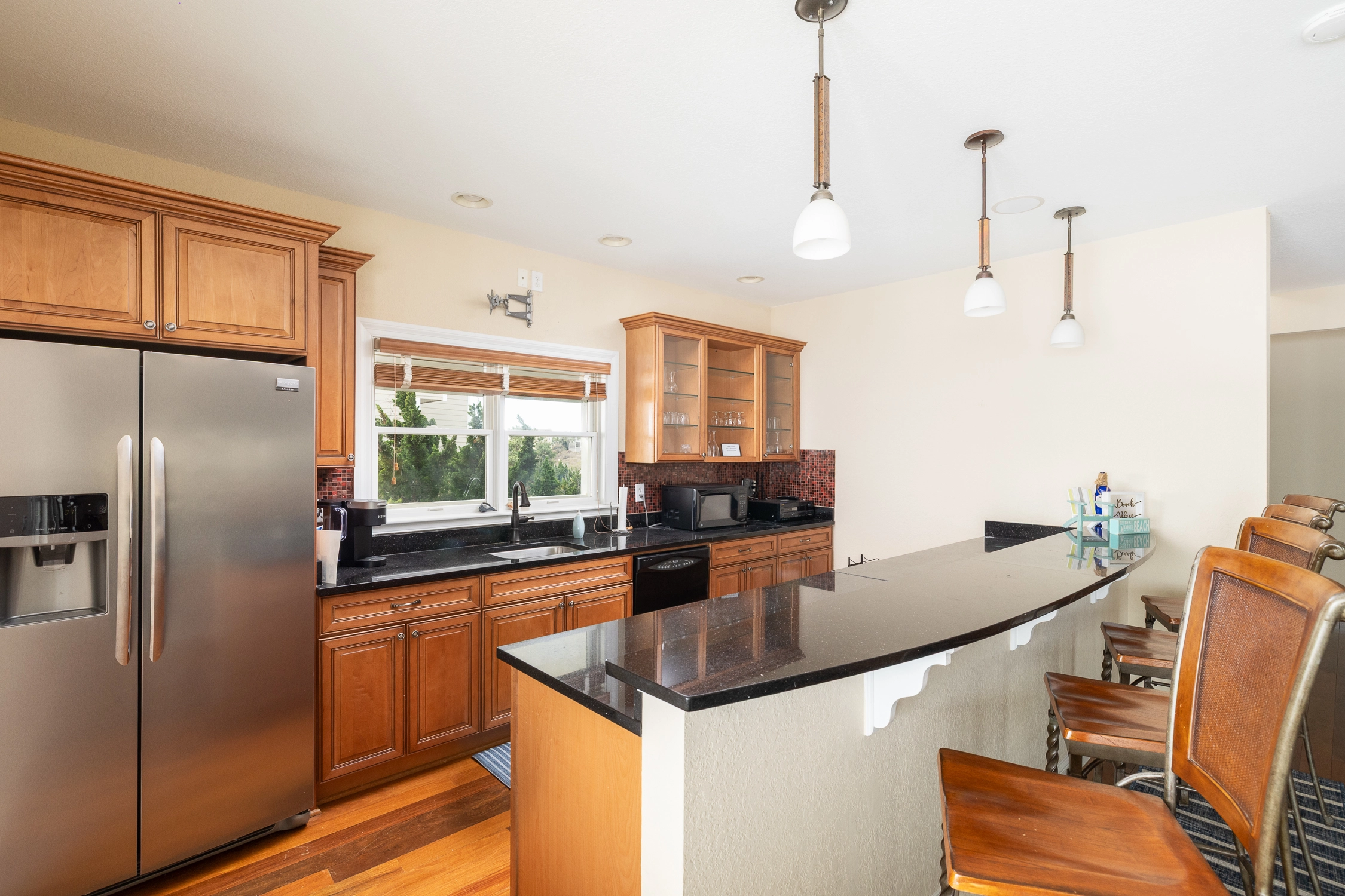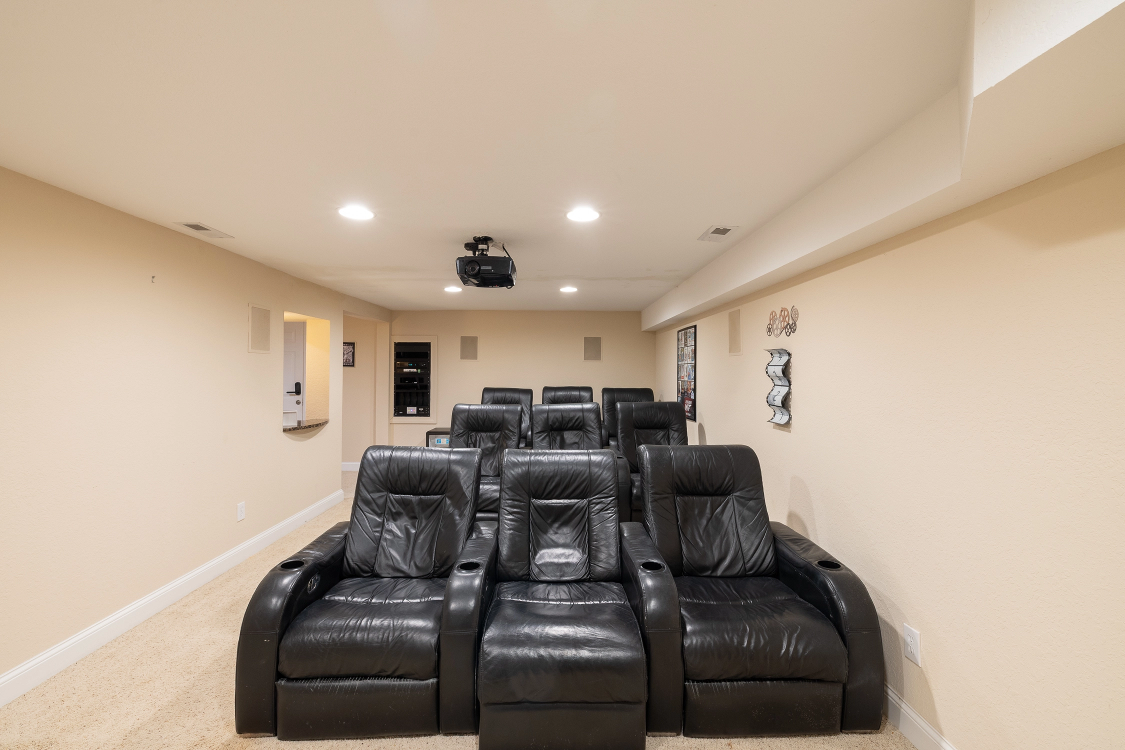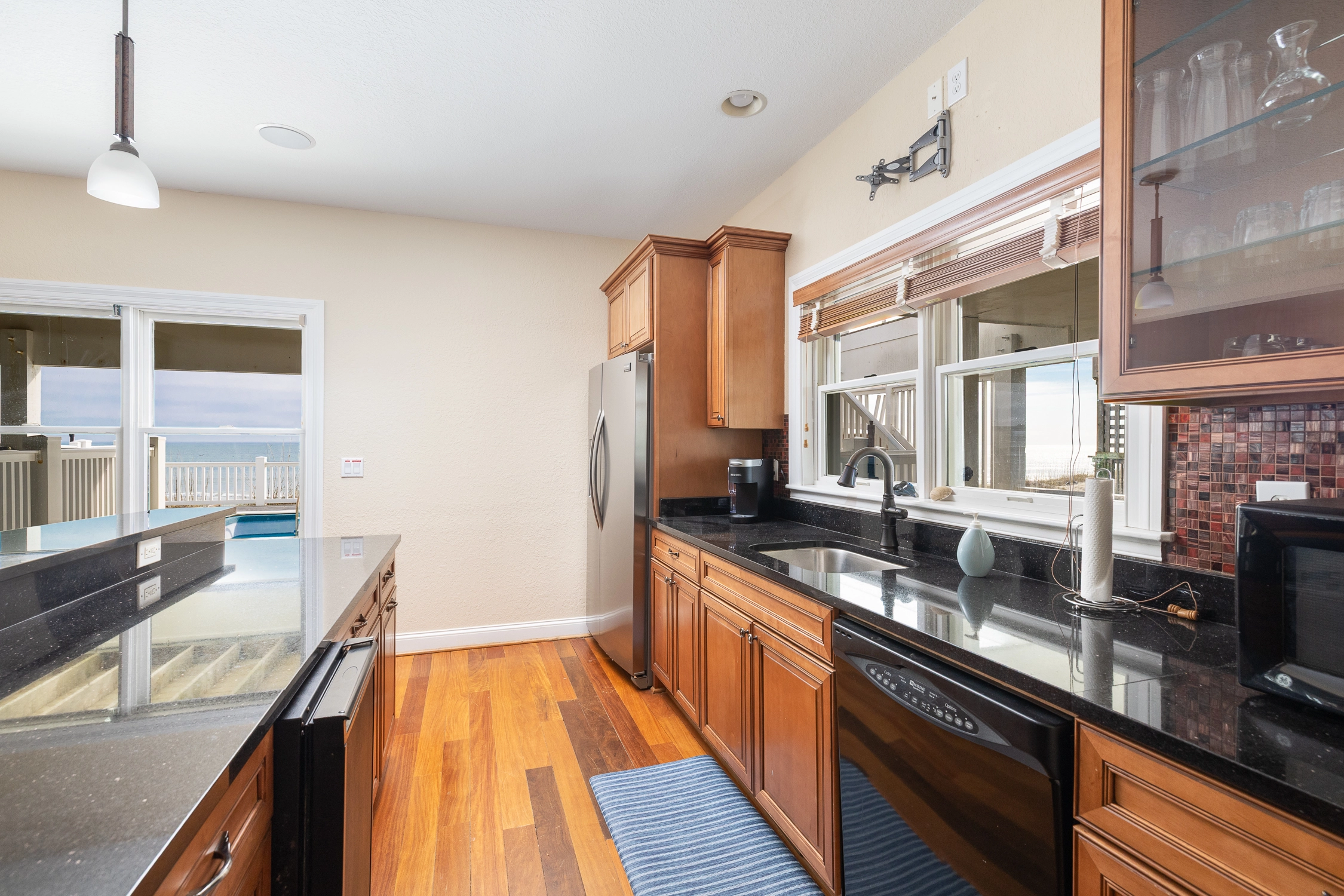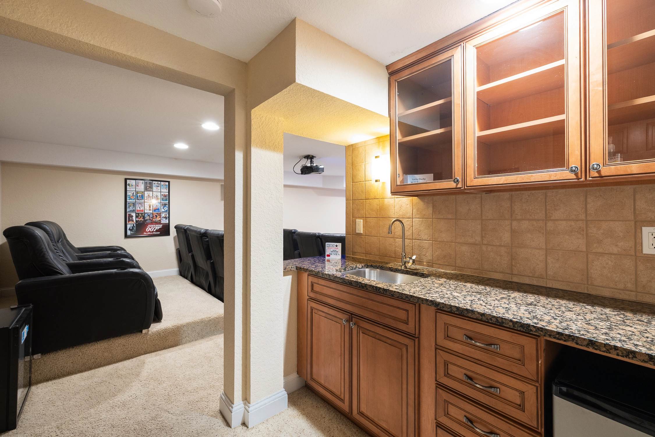 Rec room with pool table, foosball, and kitchenette with refrigerator and dishwasher.