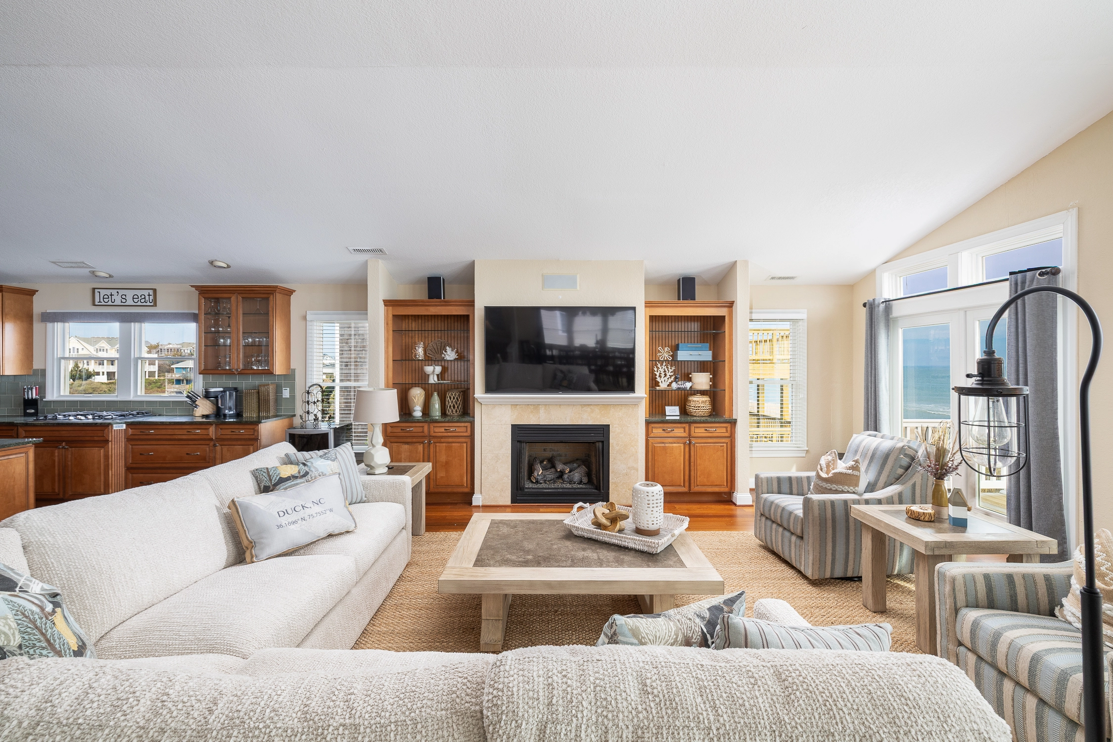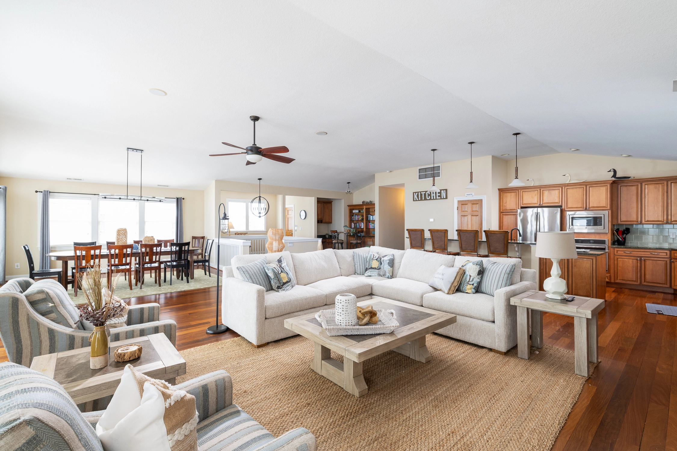 Great room with gas fireplace; kitchen with gas stove; dining area; laundry.