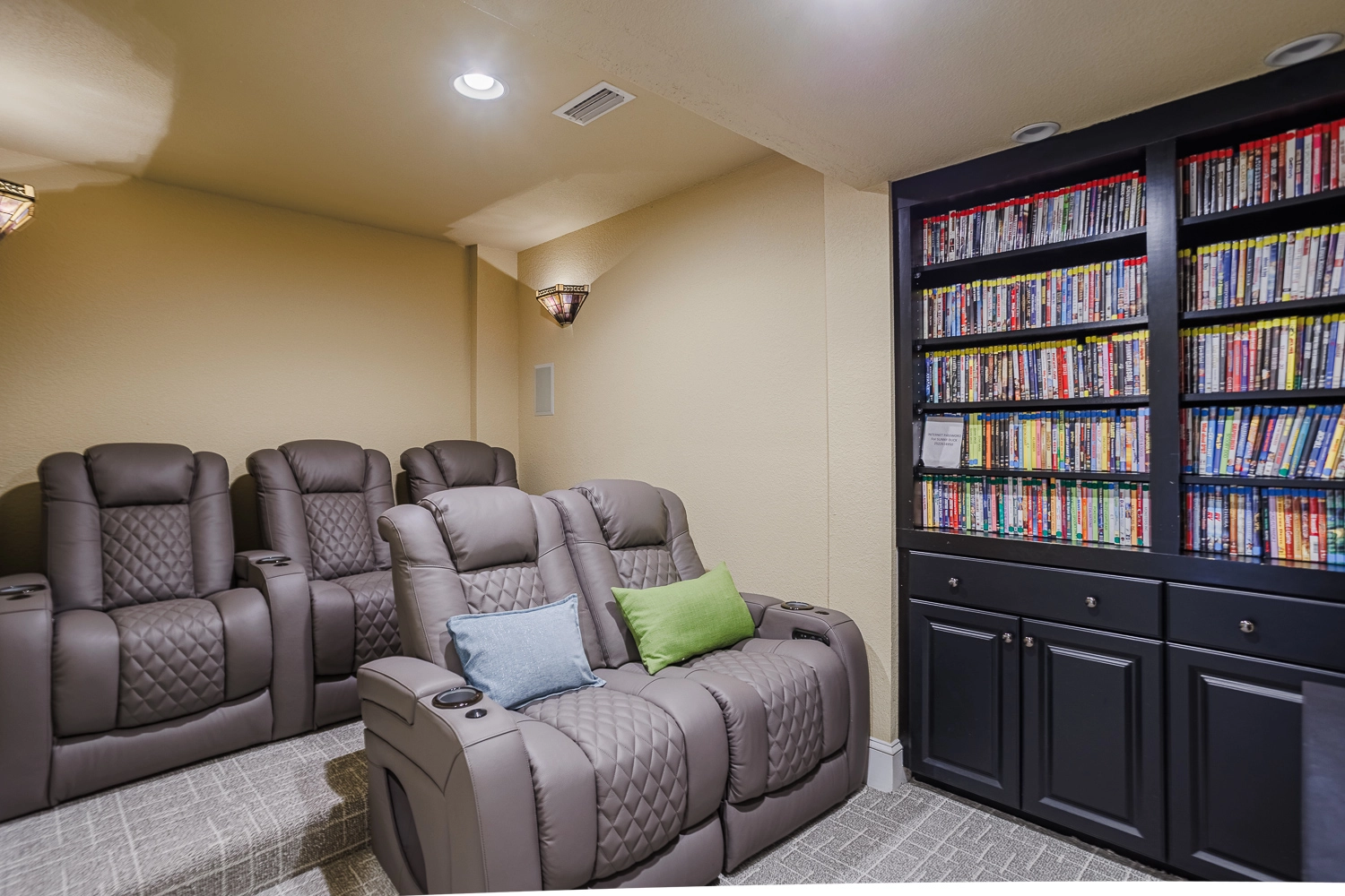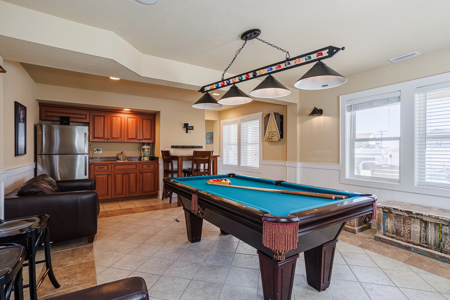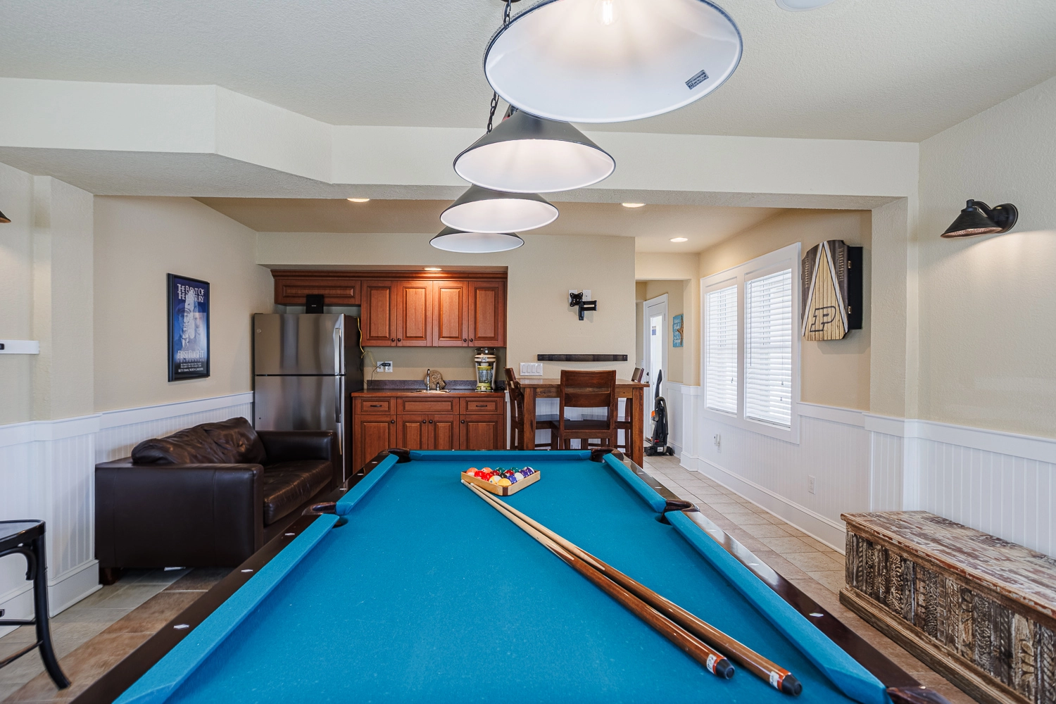 Rec room with pool table, wet bar, refrigerator and 28 bottle wine cooler; theater room with surround sound; private pool and hot tub, outside shower.