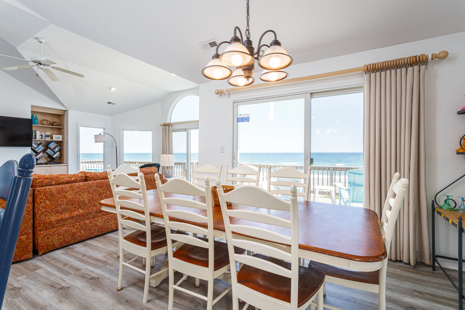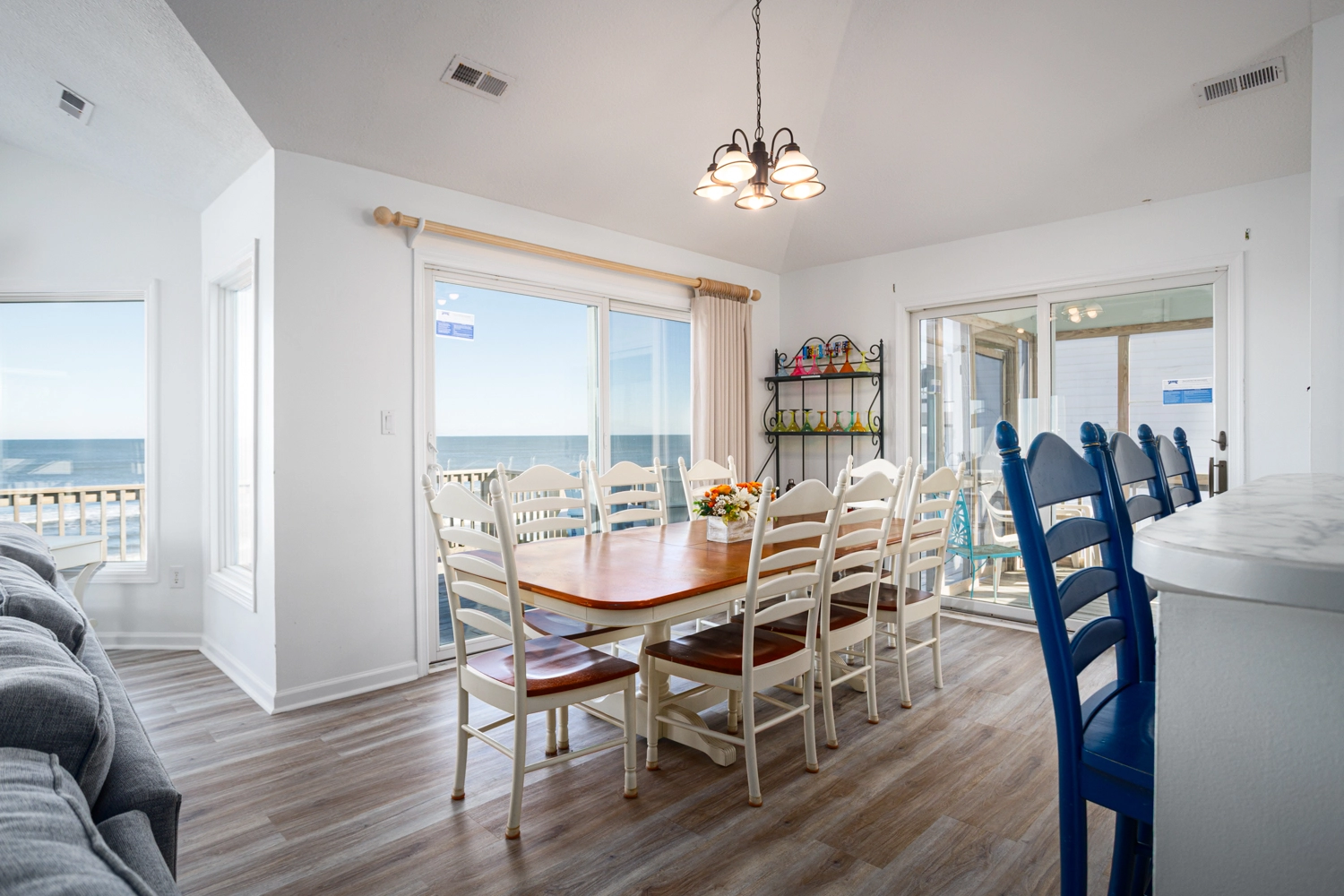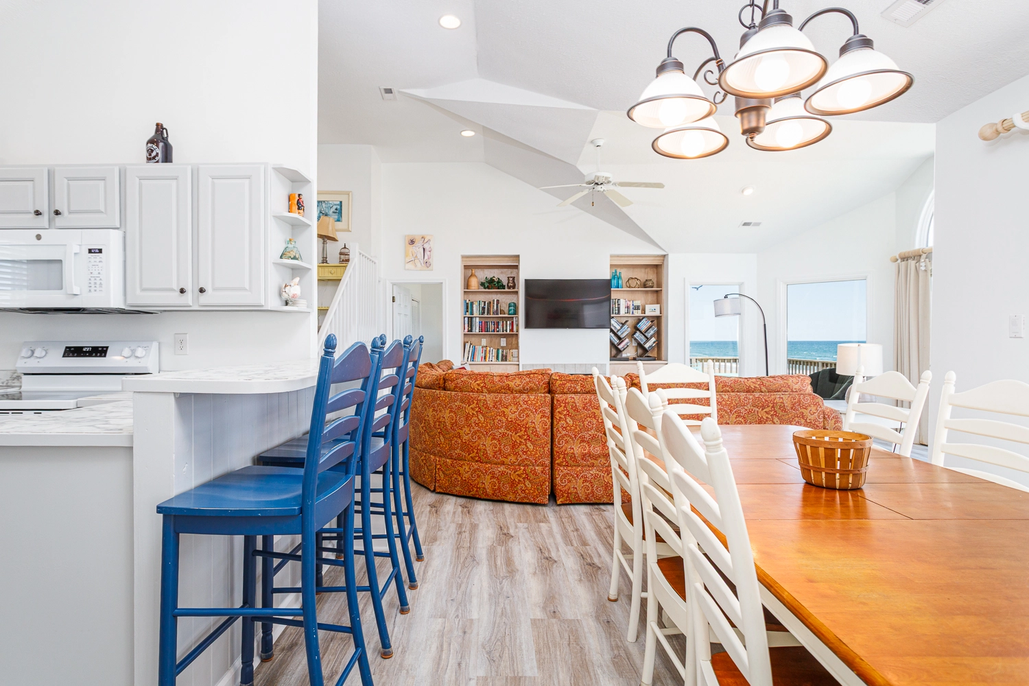 "LOCATION! LOCATION! LOCATION! VIEWS! VIEWS! VIEWS We enjoyed staying here. Plenty of room for our group of 5 with lots more room to spare. Comfortable bedding, spacious bathrooms, and good decks with nice furniture. Dishes, utensils, pots and pans, and glassware all very nice. Nice pantry area with shelves in the kitchen. Washer and dryer on the second level almost like new. The house could use a major update in the kitchen. The range (old style, not a glass top, and one unit did not work) and dishwasher (we ended up hand washing everything) should be replaced. The kitchen has a double sink, but it's small and shallow. Really nice coffeemaker, toaster, microwave, and tea kettle. Fridge was not very large--with the freezer on top--but it was adequate, and the ice maker worked fine. The TV in the great room was very nice. Disappointed there was only one TV on second level. No TV in twin, bunk, or queen rooms, only in the king master bedroom. Overall this is a great home, and we had a wonderful time. The criticisms are meant to be constructive, and the things I mentioned did not deter us from enjoying the whole week. In fact, we already reserved Vista del Mar for the same time next year!"