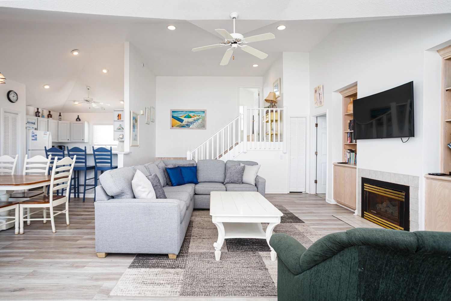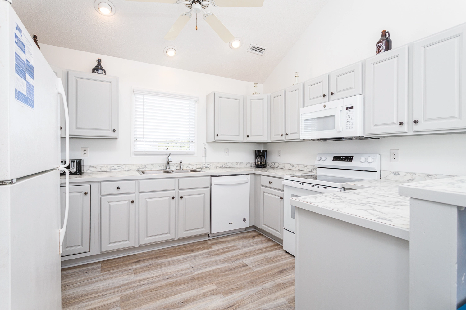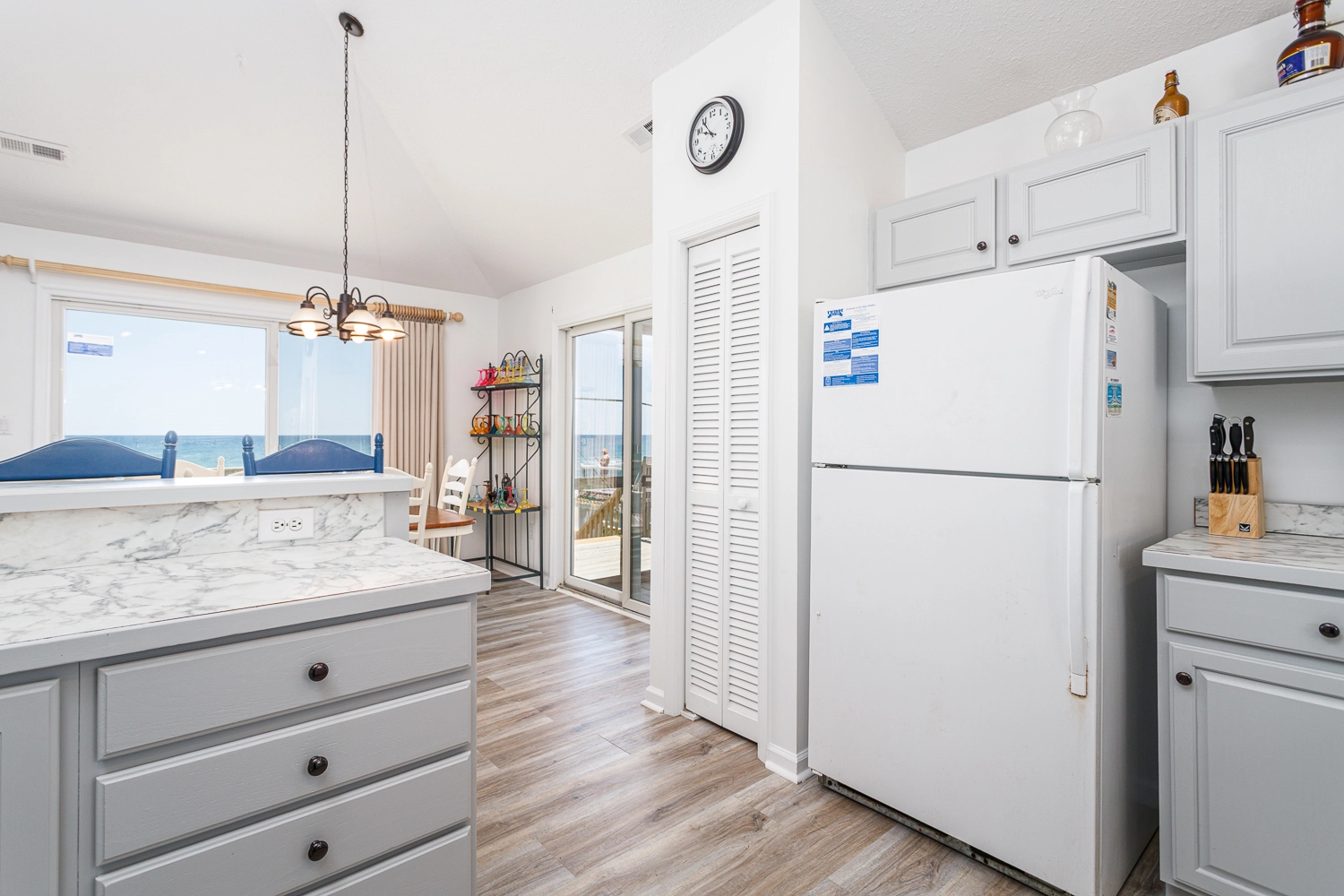 "LOCATION! LOCATION! LOCATION! VIEWS! VIEWS! VIEWS We enjoyed staying here. Plenty of room for our group of 5 with lots more room to spare. Comfortable bedding, spacious bathrooms, and good decks with nice furniture. Dishes, utensils, pots and pans, and glassware all very nice. Nice pantry area with shelves in the kitchen. Washer and dryer on the second level almost like new. The house could use a major update in the kitchen. The range (old style, not a glass top, and one unit did not work) and dishwasher (we ended up hand washing everything) should be replaced. The kitchen has a double sink, but it's small and shallow. Really nice coffeemaker, toaster, microwave, and tea kettle. Fridge was not very large--with the freezer on top--but it was adequate, and the ice maker worked fine. The TV in the great room was very nice. Disappointed there was only one TV on second level. No TV in twin, bunk, or queen rooms, only in the king master bedroom. Overall this is a great home, and we had a wonderful time. The criticisms are meant to be constructive, and the things I mentioned did not deter us from enjoying the whole week. In fact, we already reserved Vista del Mar for the same time next year!"