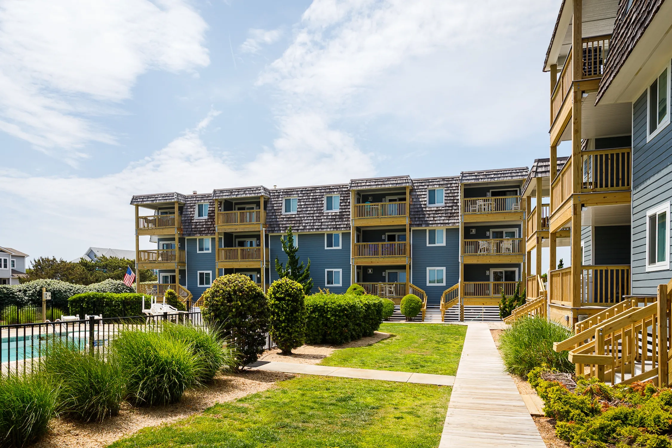 Community pool, community beach access with dune deck, community basketball goal, community charcoal grill, and coin-operated on-site laundry facilities (not located within the condo).