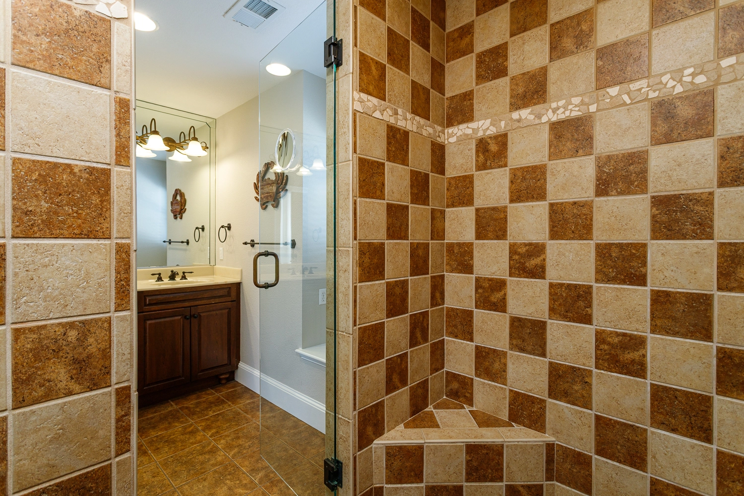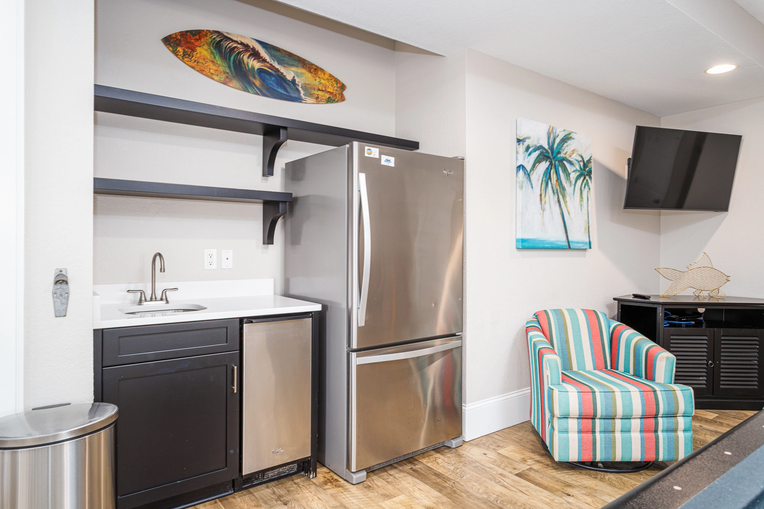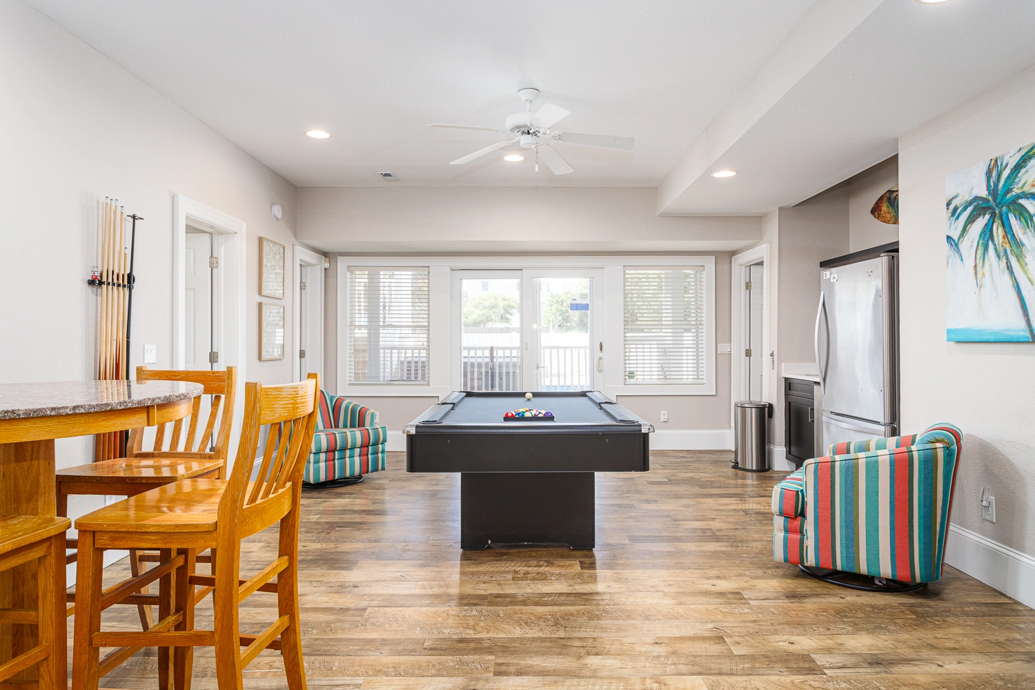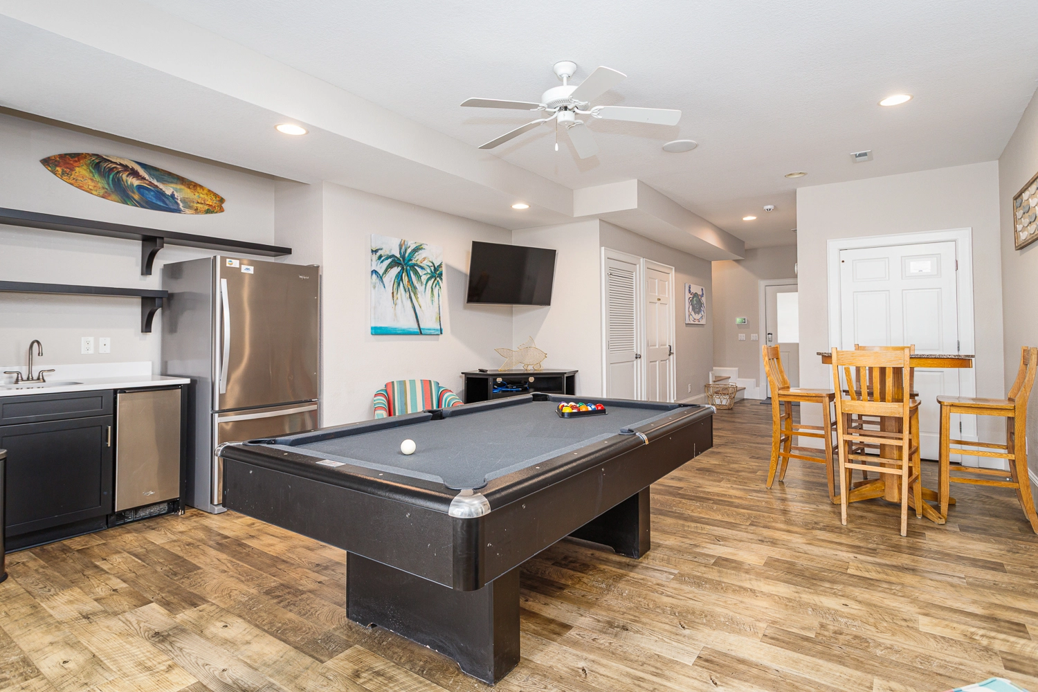 Rec room with pool table, wet bar, and refrigerator; full cabana bath.