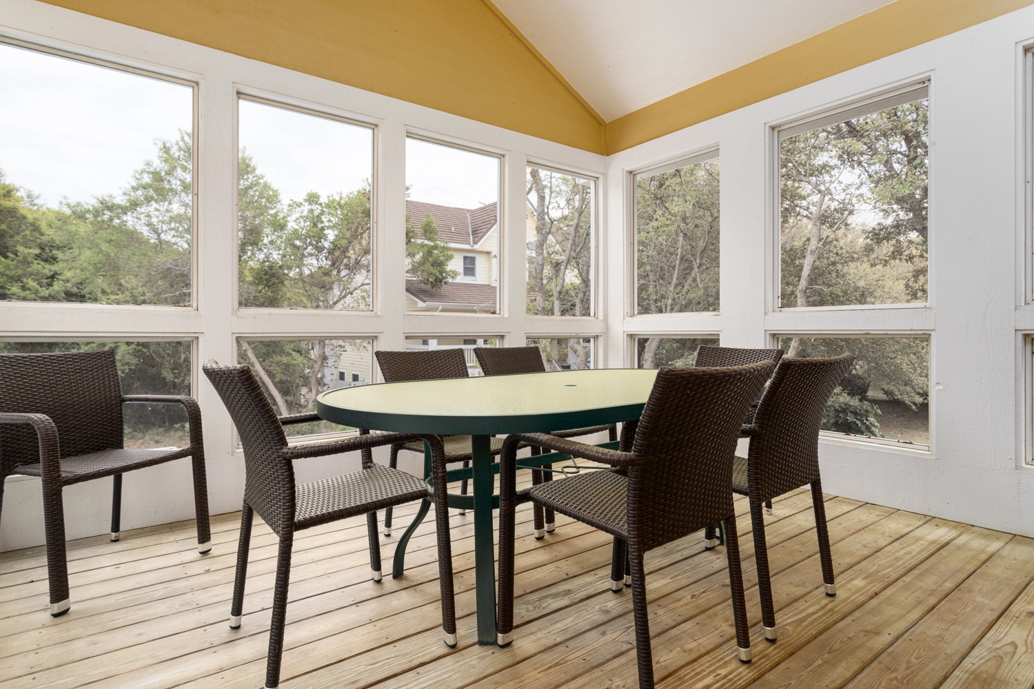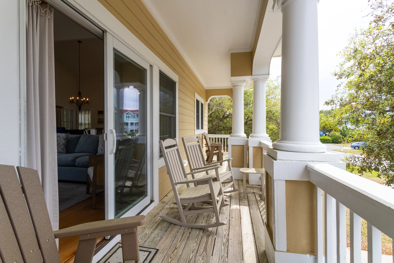 "Lots of balconies. Short walk to the beach but the beach here was not as large as the beach at Corolla. We picked Duck this year because of the traffic was less. You really need a bridge for the northern part of the Outer Banks!"