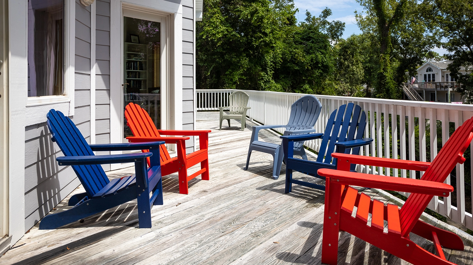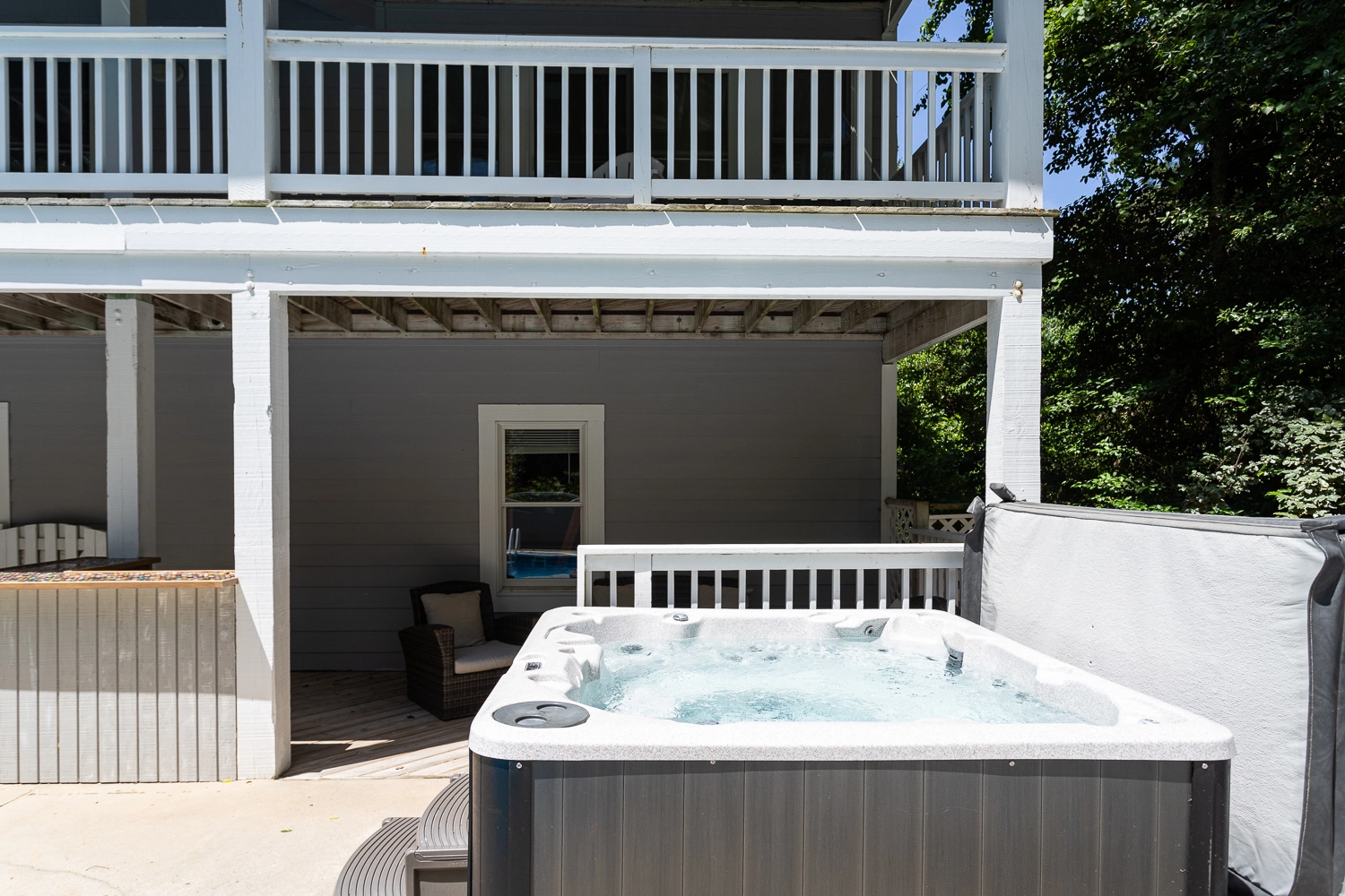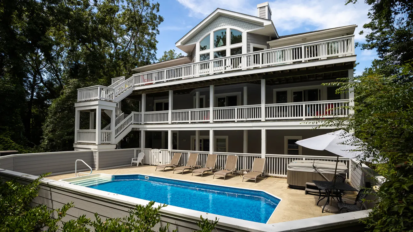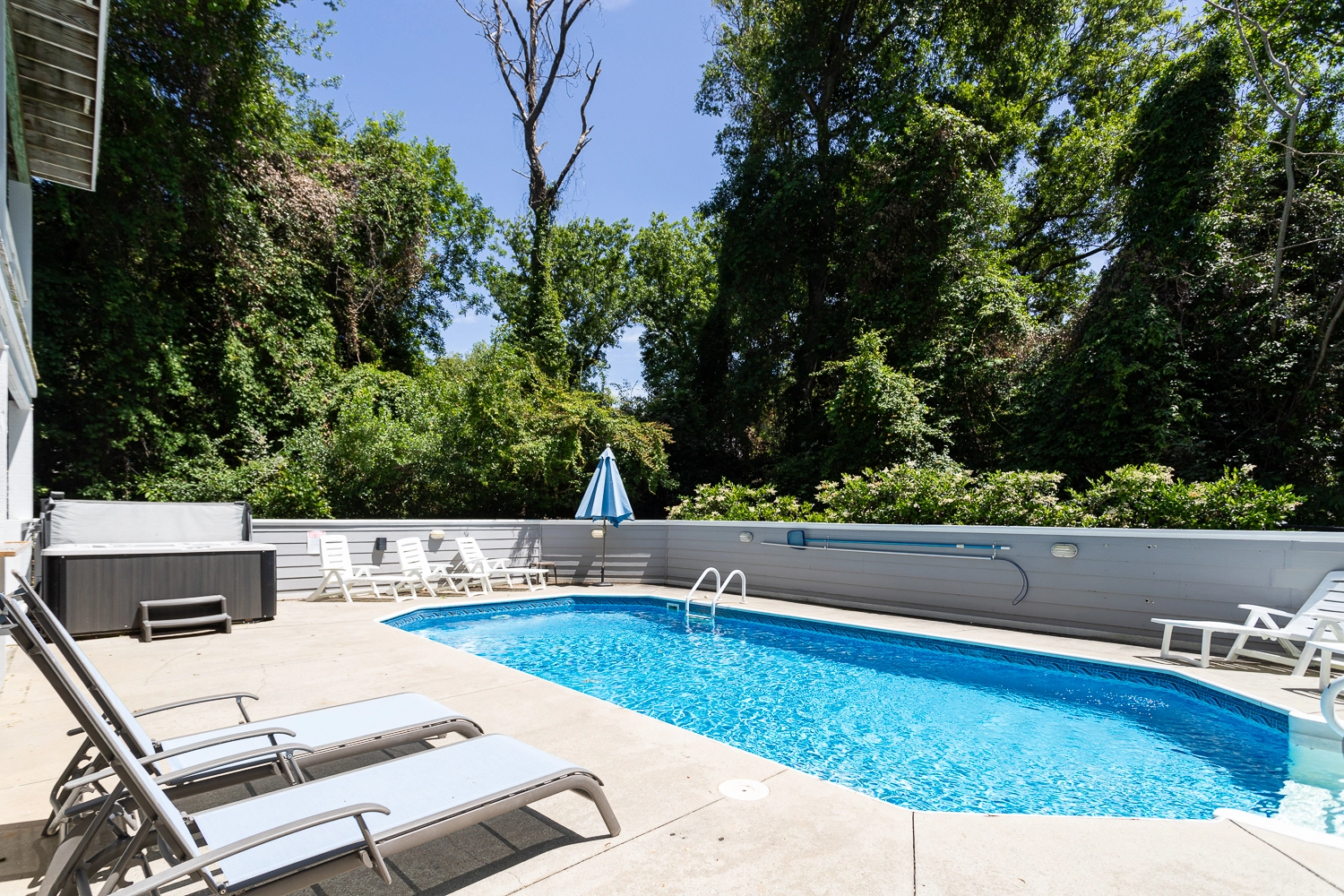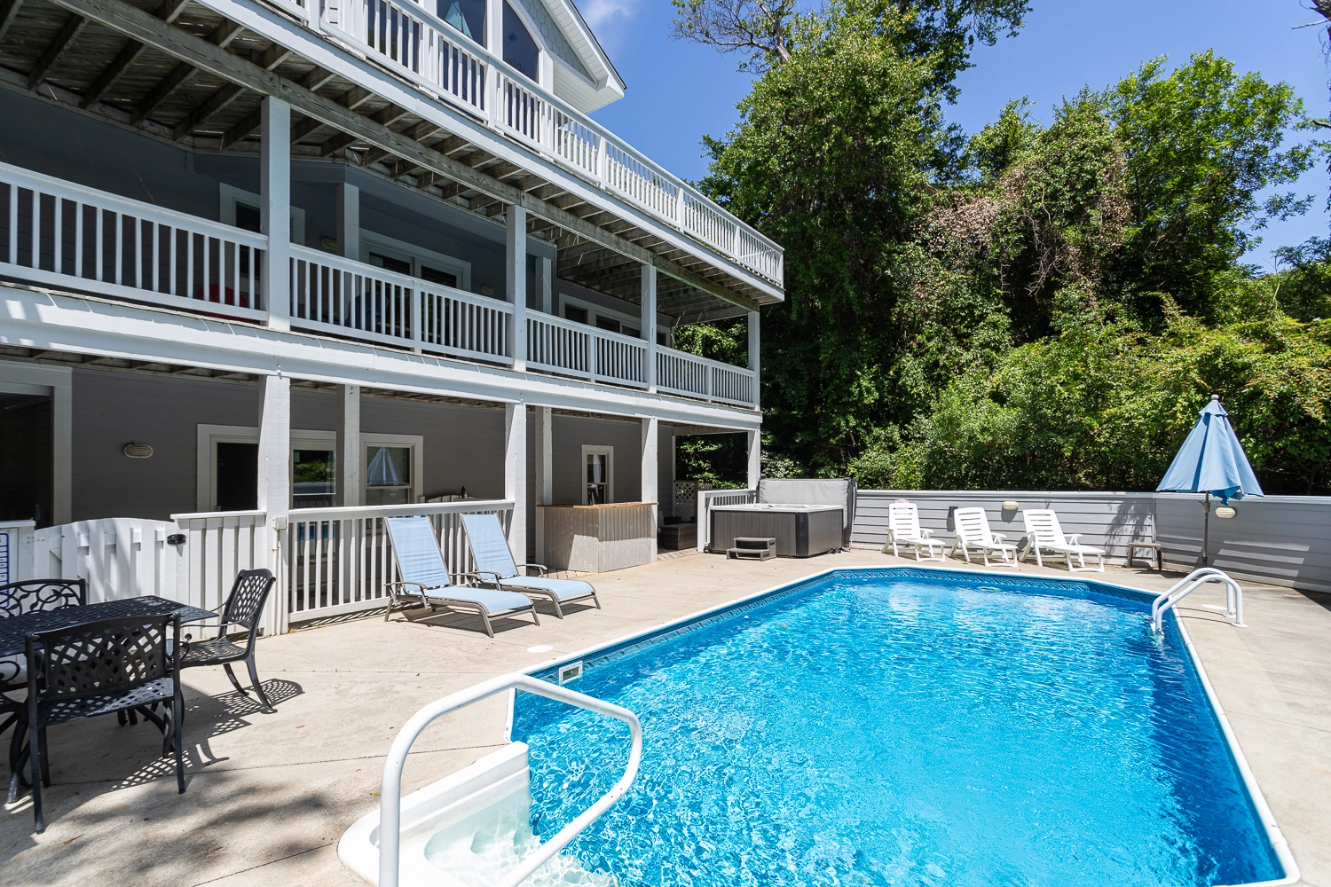"The community space on the second floor; ample parking; bedrooms for everyone; the pool and hot tub; all of the places to sit and read outside (decks, patios, porches, etc)"