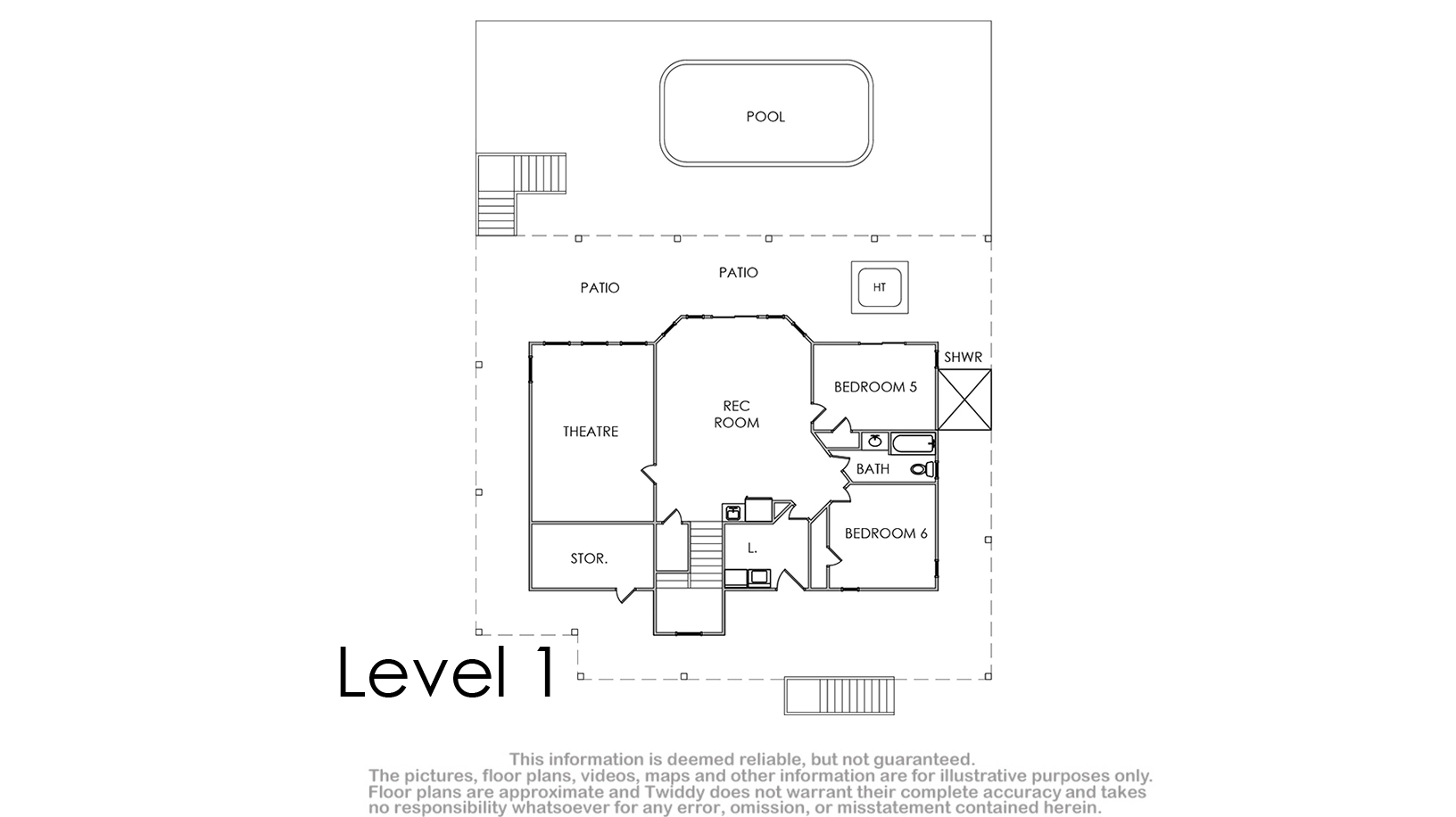Rec room with pool table, wet bar, and full size refrigerator; theatre room; laundry.