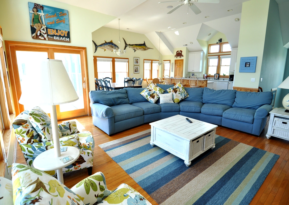 Great room with vaulted ceiling, sectional sofa and gas fireplace; dining table seats ten; breakfast bar seats four; breakfast table seats four; well-appointed kitchen with a pantry and two dishwashers; access to open deck.