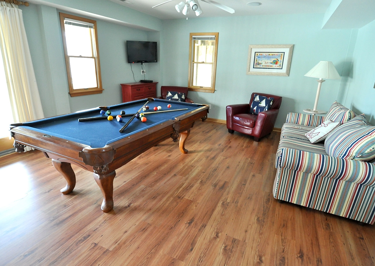 Rec room with pool table, kitchenette and second full-size refrigerator; access to patio with pool, hot tub and grill area.